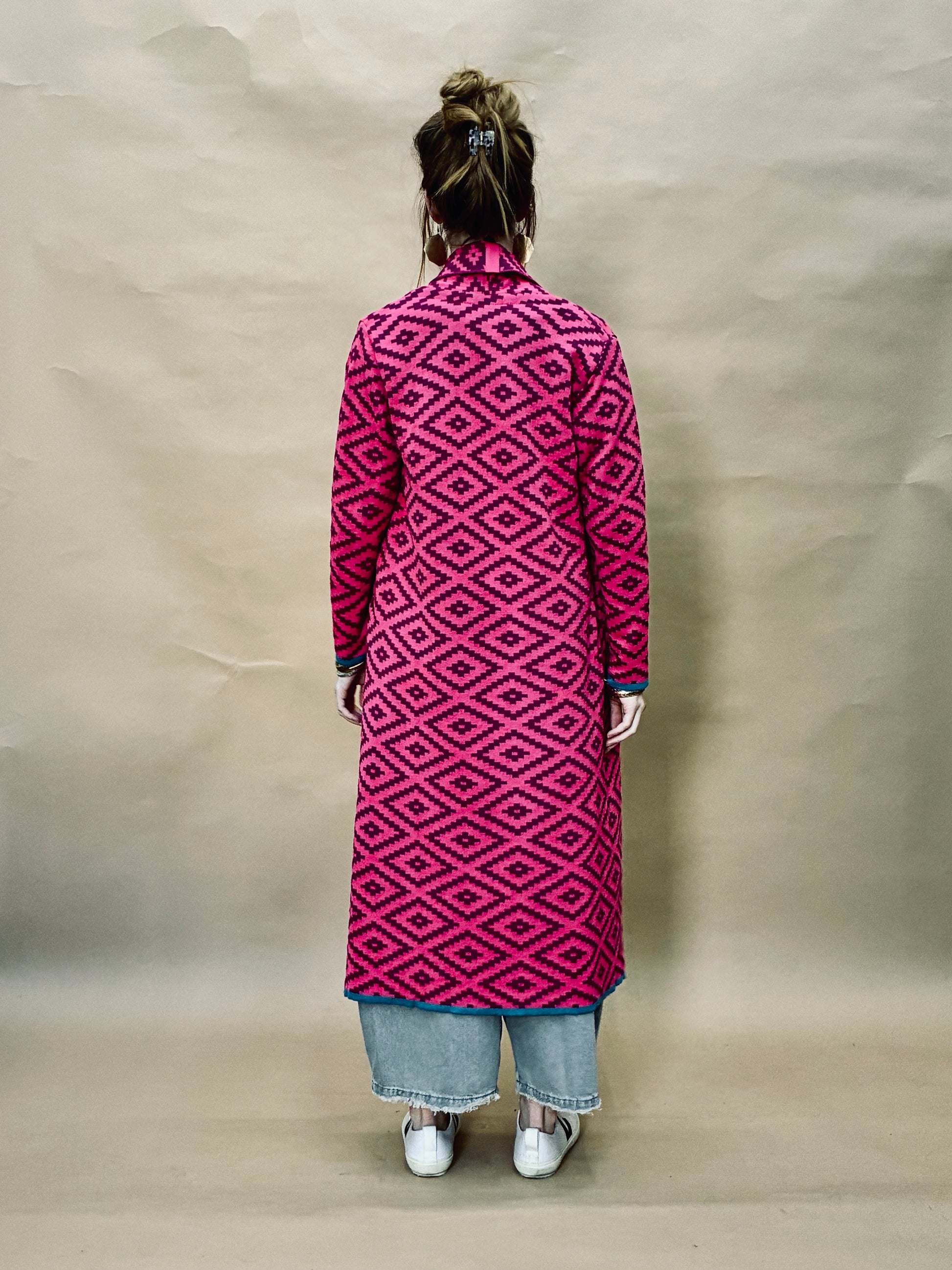 Knitted spring transitional cardigan coat with Aztec pattern. Has cut pockets, and two gold snap fastener at the waist.
