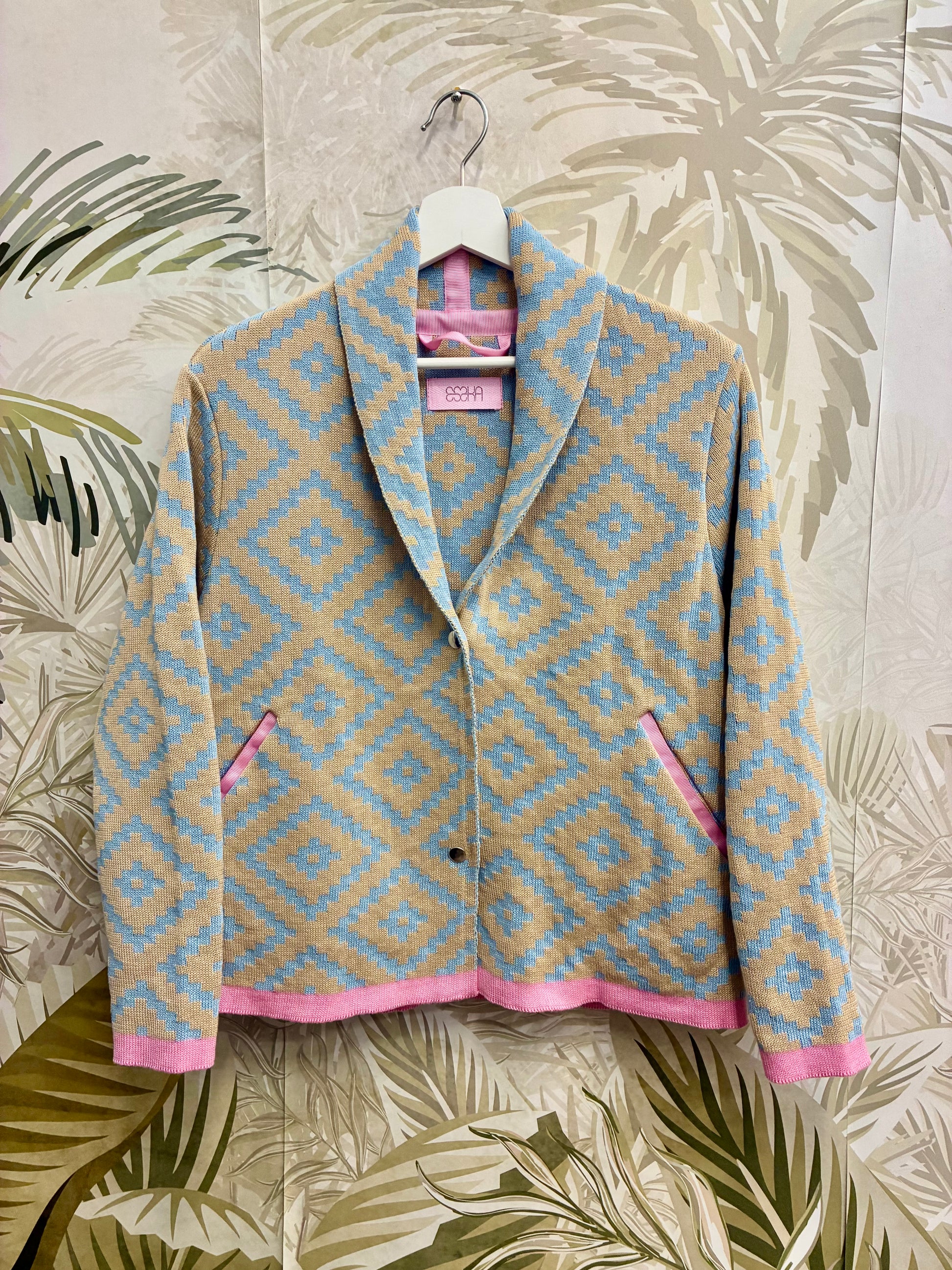 Knitted short coat with aztec geometric pattern. Has cut pockets and two silver snap fasteners at the waist.