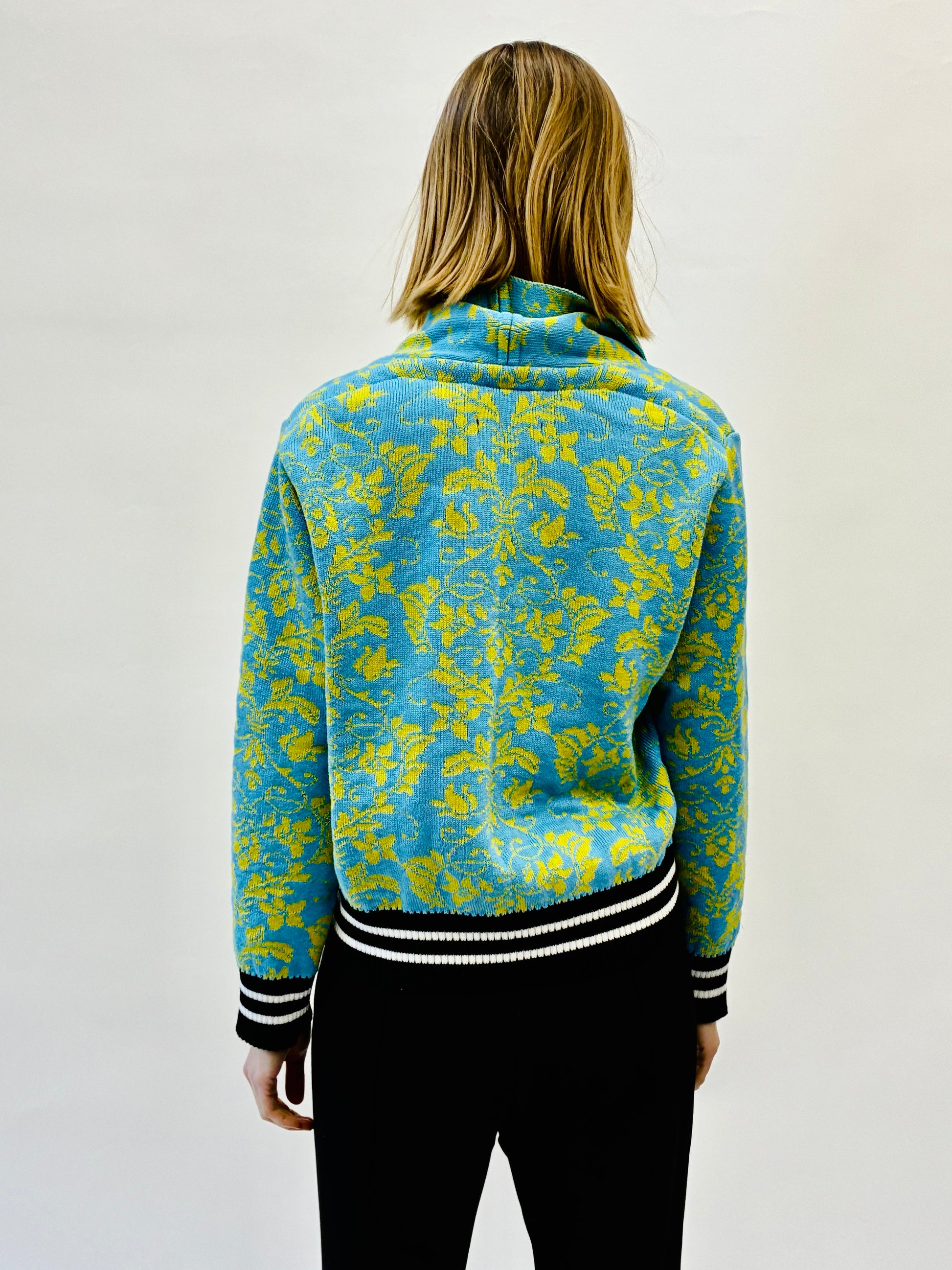 Short knitted bomber style jacket with baroque plant pattern. Has cut pockets and 4 silver snap fasteners at the waist. There is a BW striped yoke at the bottom, at the end of the sleeves.