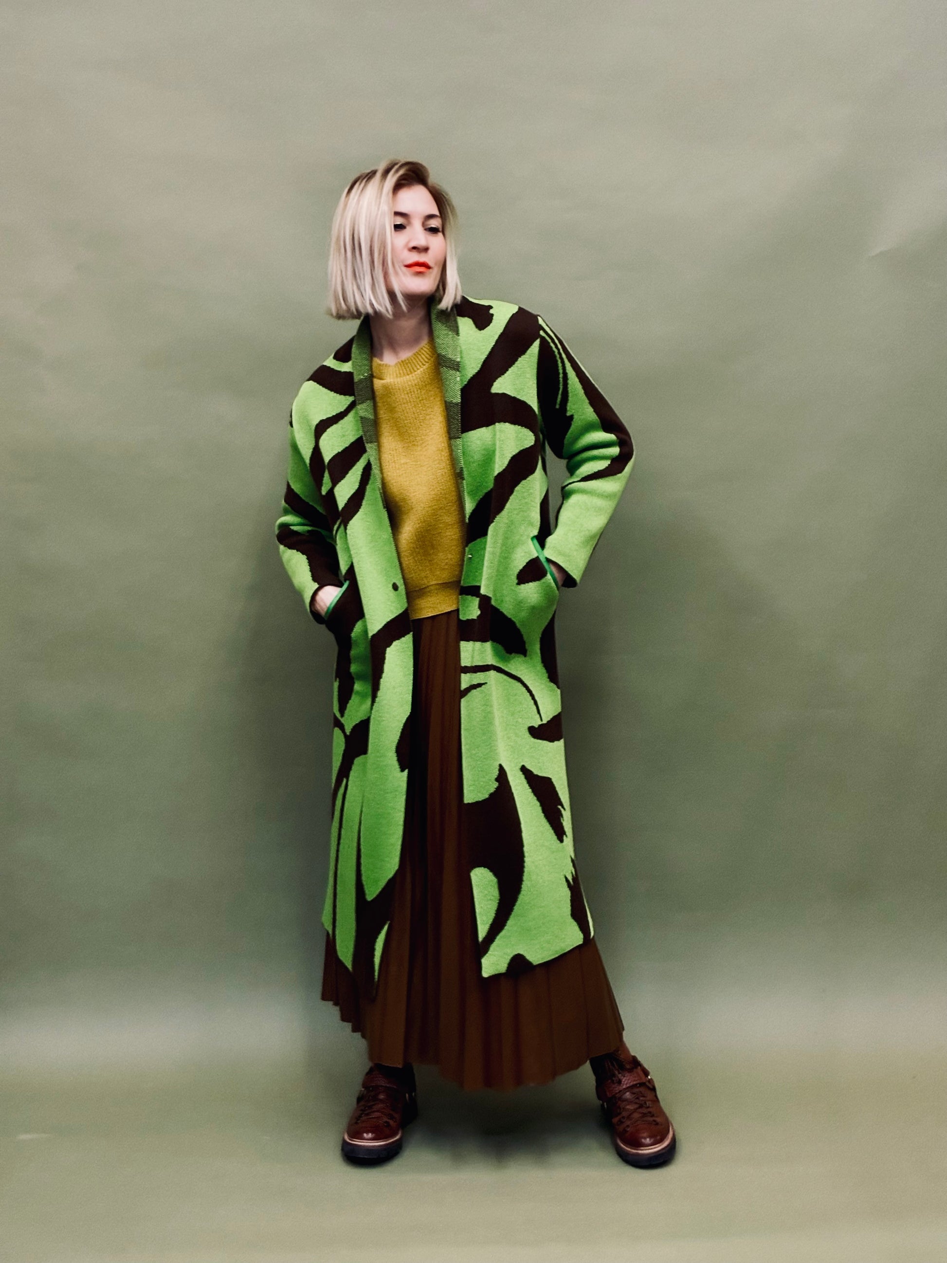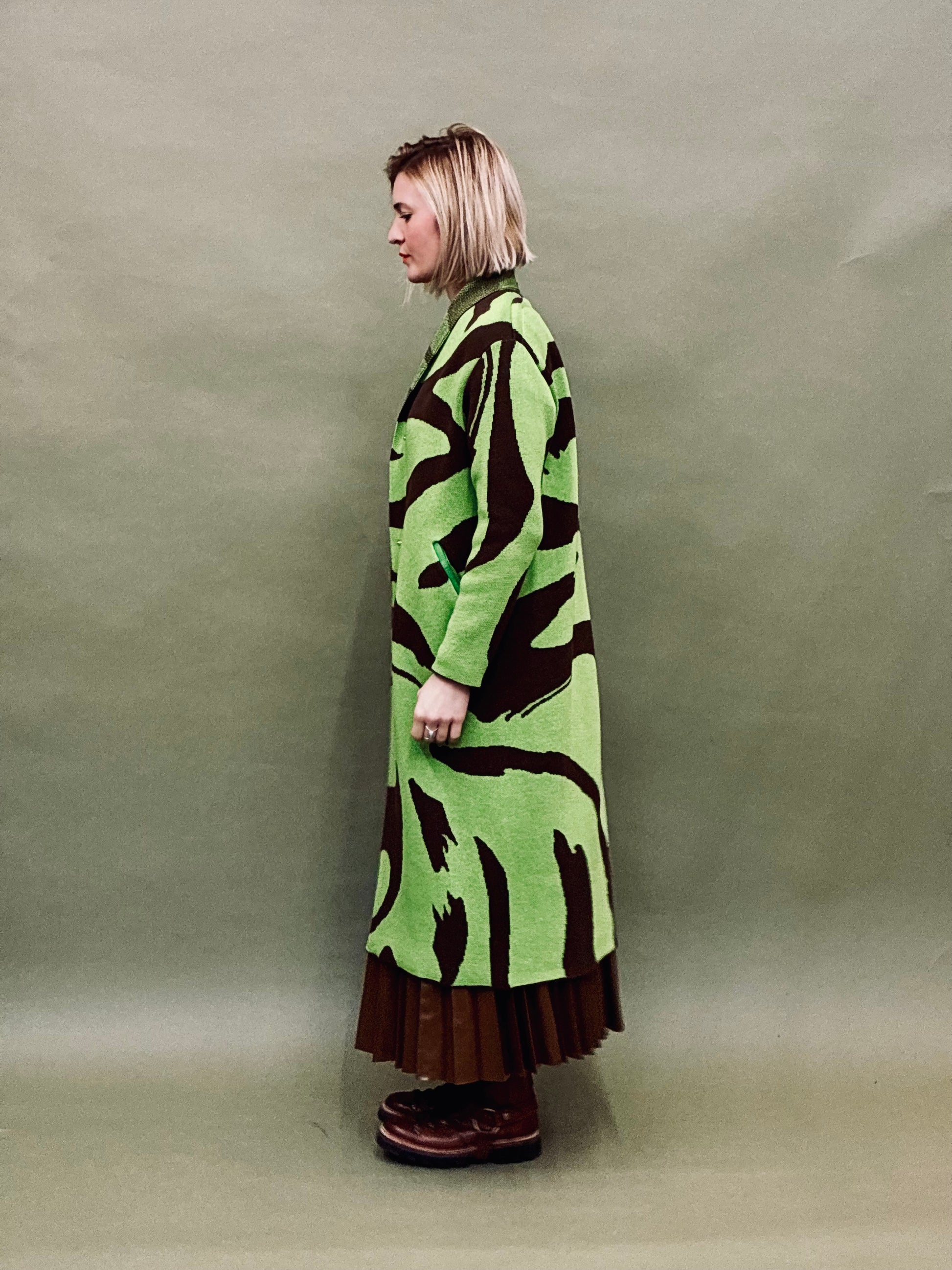 Warmer Knitted coat with a brush drawing pattern. Inspired by the Japanese fude painting. Has cut, pockets and two smoke silver snap fastener at the waist.