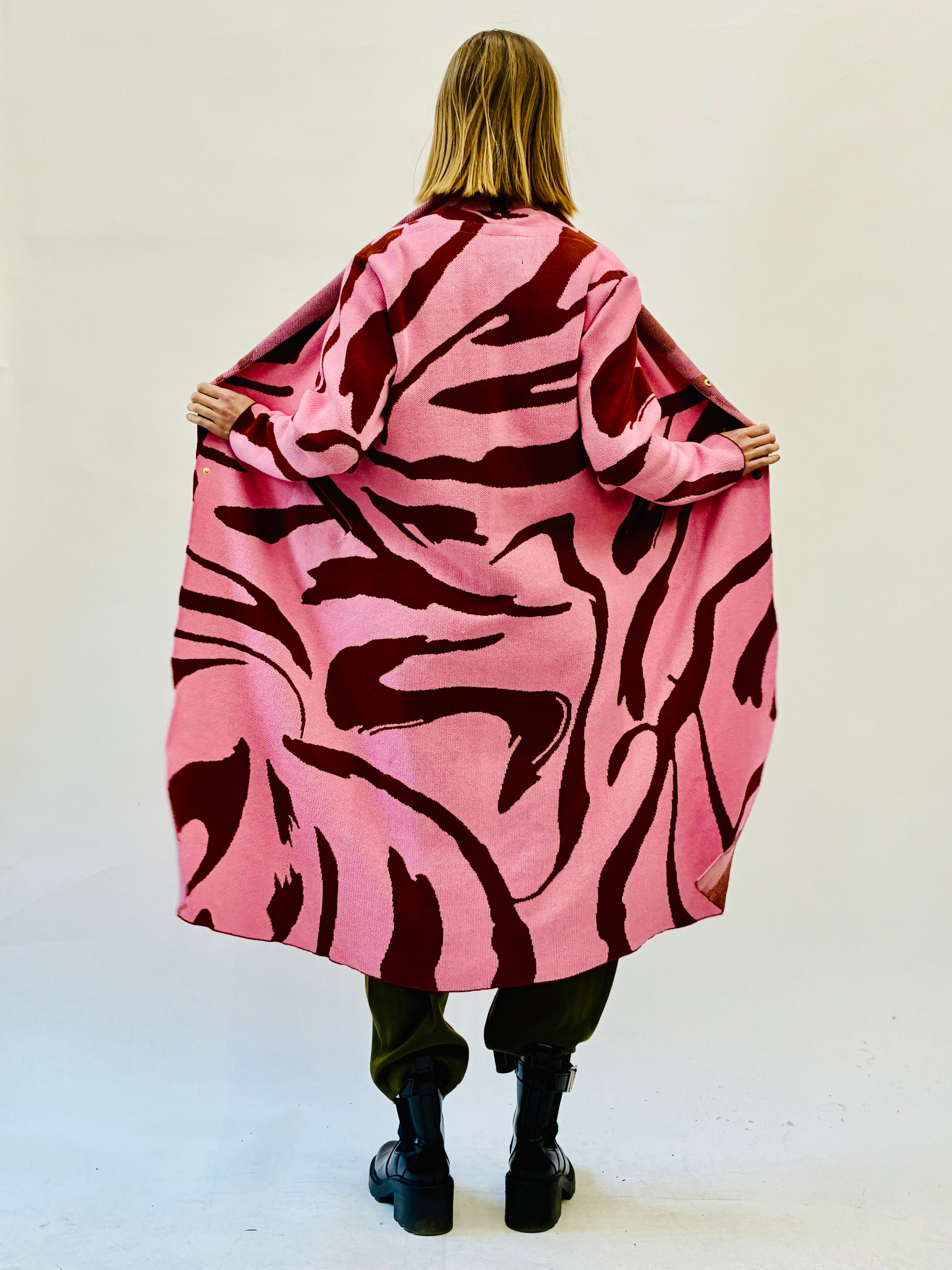 Knitted light coat with a brush drawing pattern. Inspired by the Japanese fude painting. Has cut, pockets and two copper snap fastener at the waist.