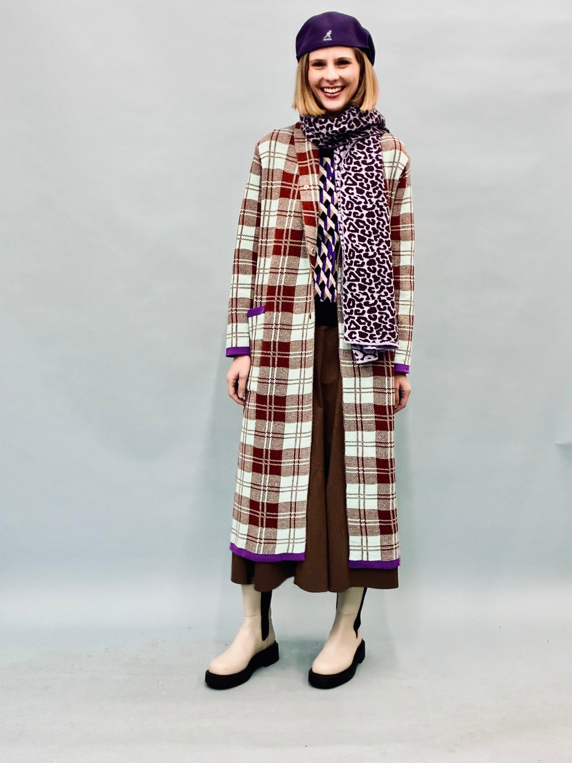 Knitted coat with a chackered pattern. Has big pockets and three gold snap fasteners at the waist. There is a chestnut and water green pattern, and purple border at the bottom and at the end of the sleeves, and a border at the top of the pockets.