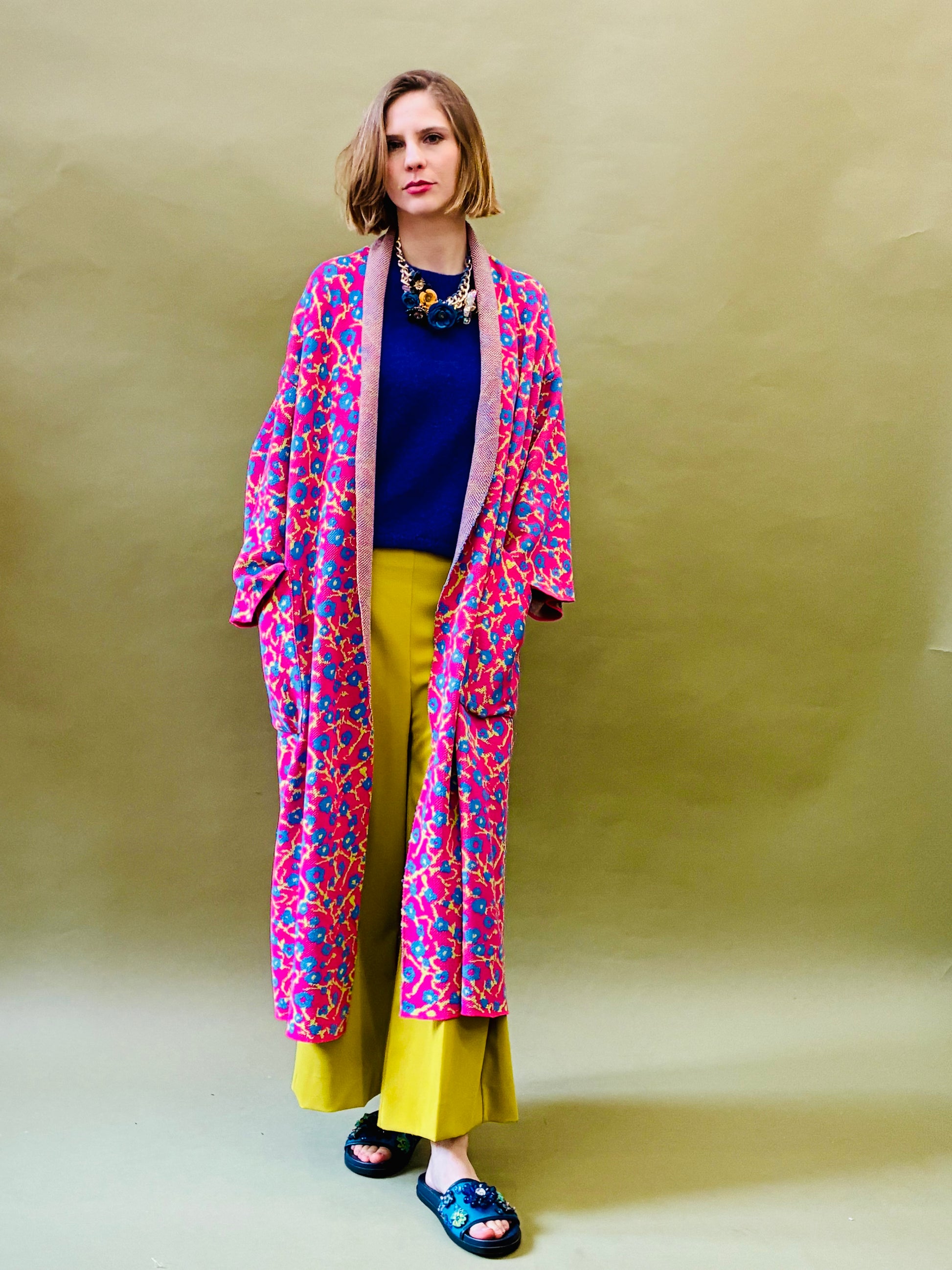 Knitted spring transitional kimono coat with 3/4 wider sleeves with a organic pattern reminiscent of cherry blossom. Has big, functional pockets. Inspired by the Japanese style.