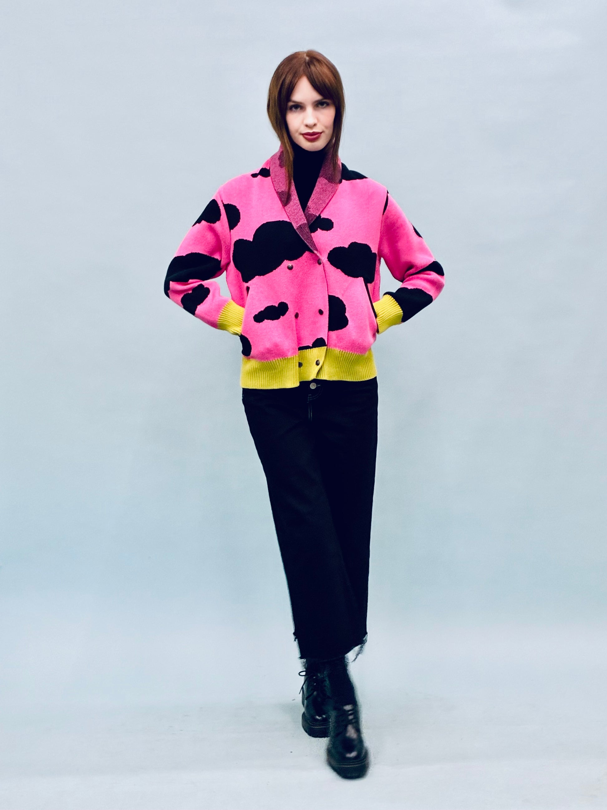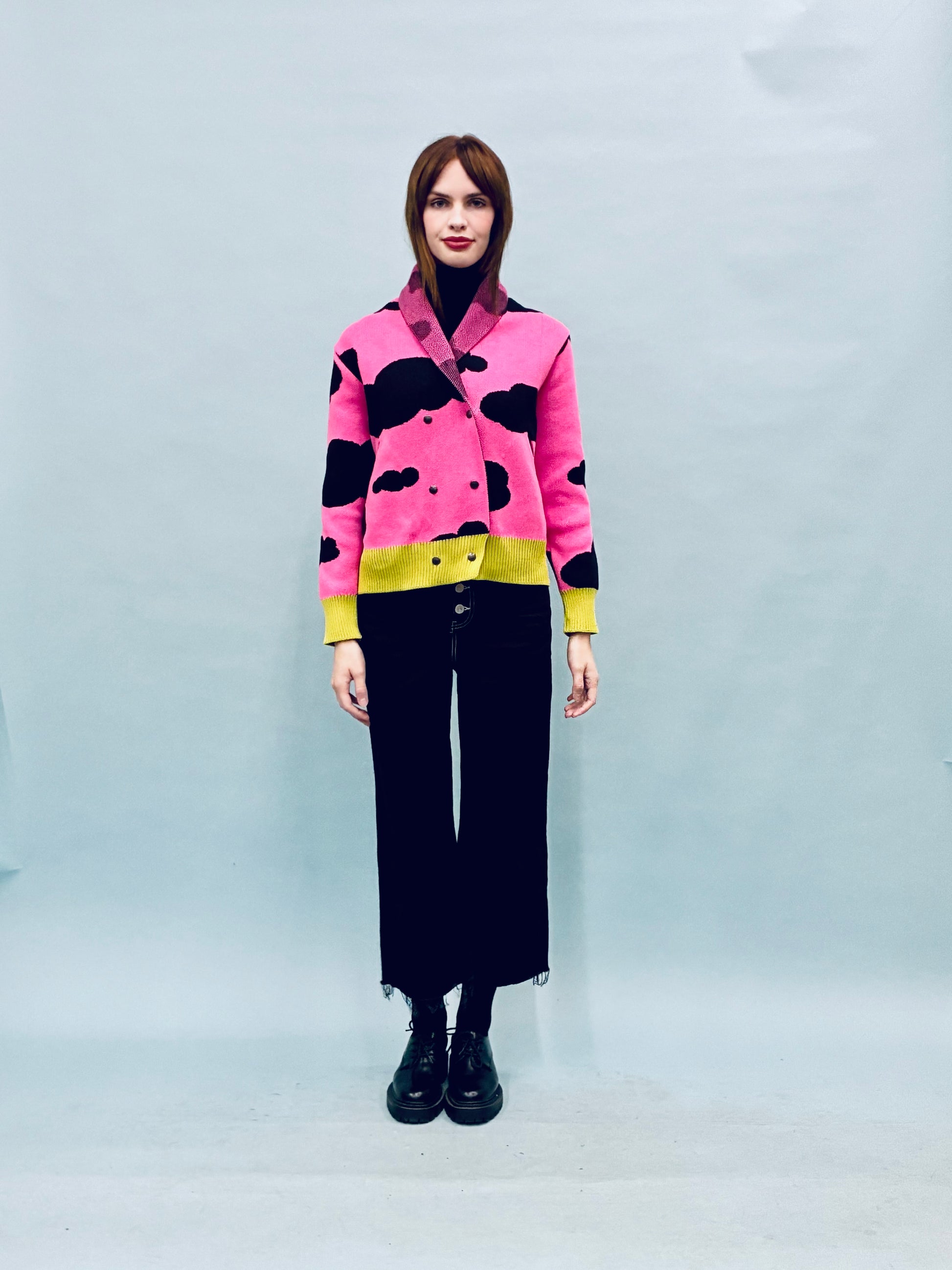 Short knitted bomber style jacket with clouds and type pattern. Has cut pockets and 6 smoke silver snap fasteners at the waist. There is a black yoke at the bottom.