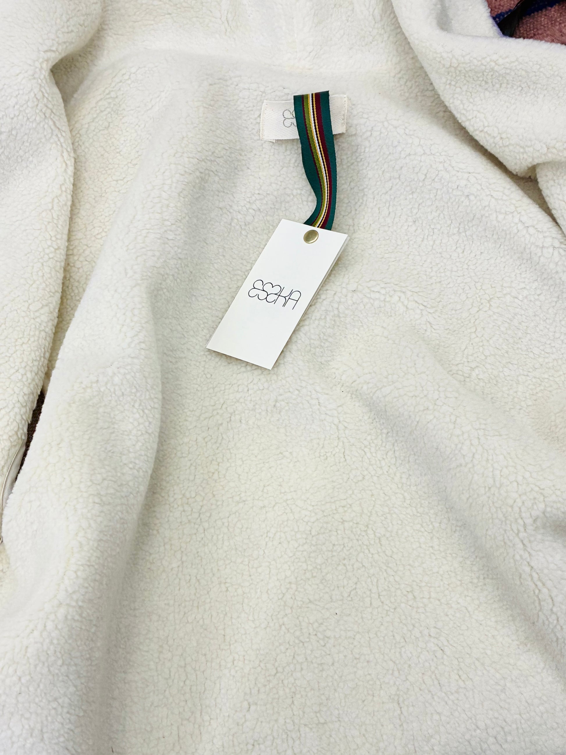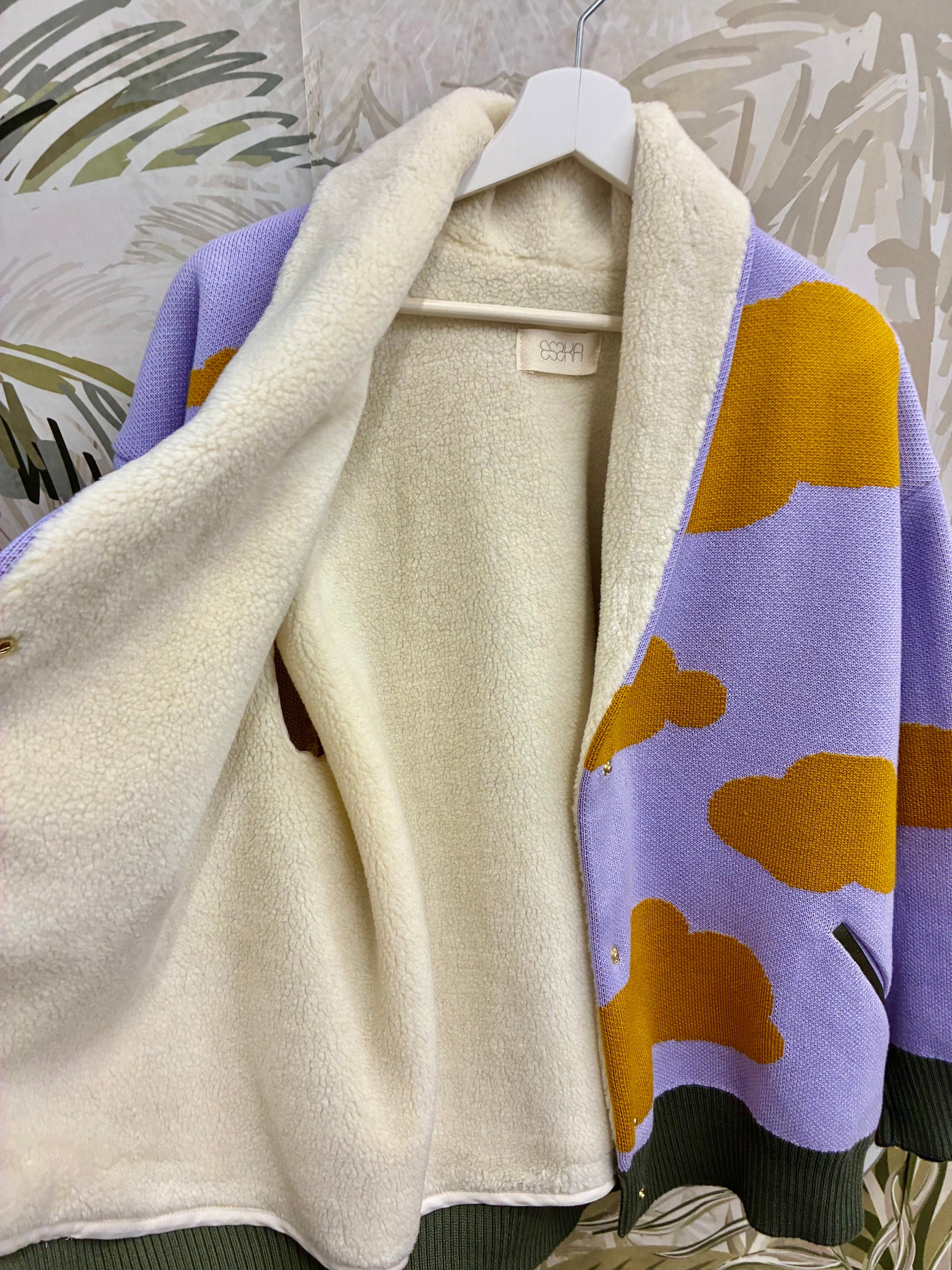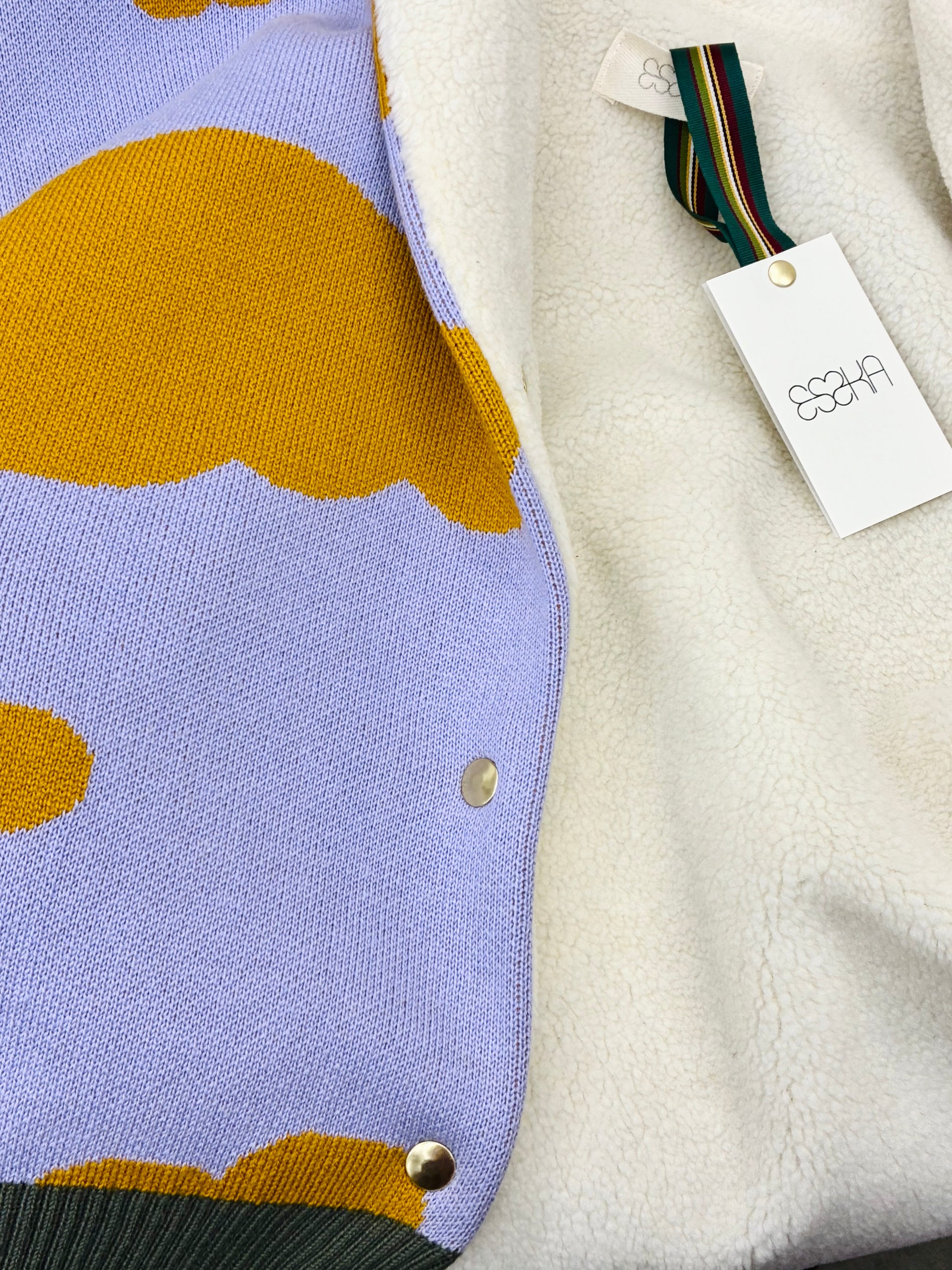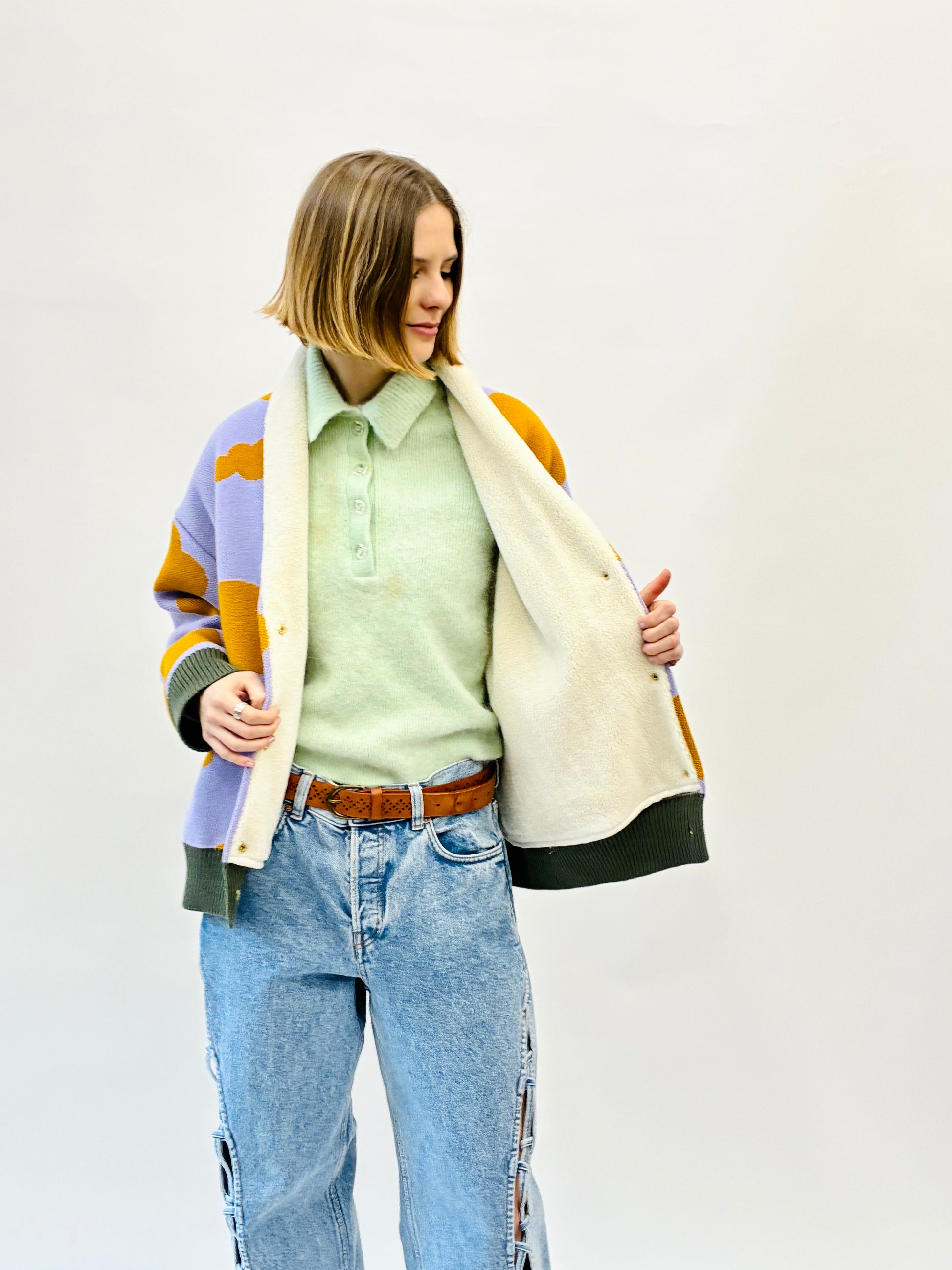 Short knitted baggy bomber jacket with clouds pattern. Has sherpa lining, and cut pockets and 4 gold snap fasteners at the waist. There is a khaky yoke at the bottom.