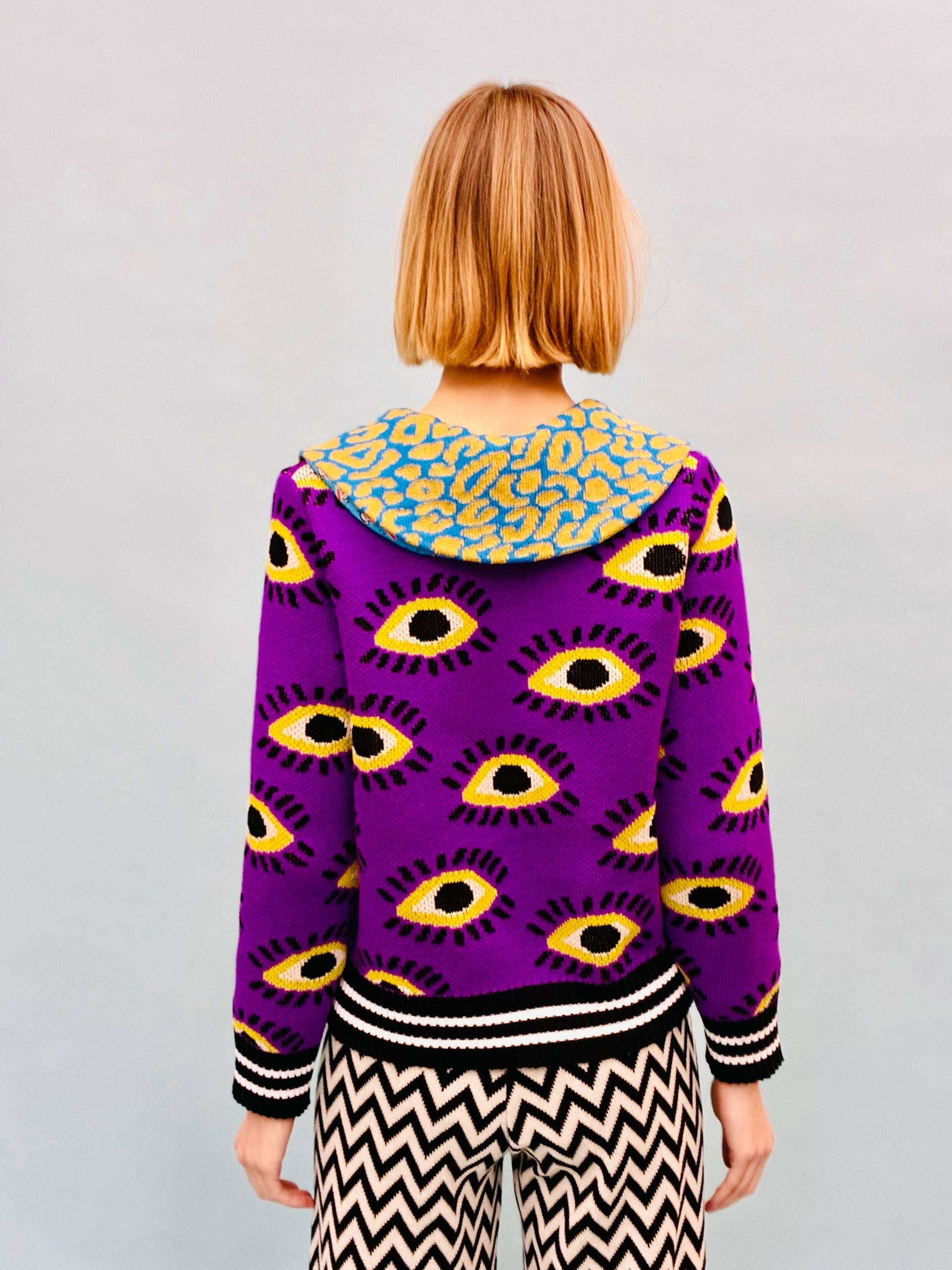 Limited edition knitted patchwork sweater with collar. A one-of-a-kind fusion of bold colors and signature patterns from our coat collection. Effortlessly comfortable, designed for everyday wear for a total unique look.