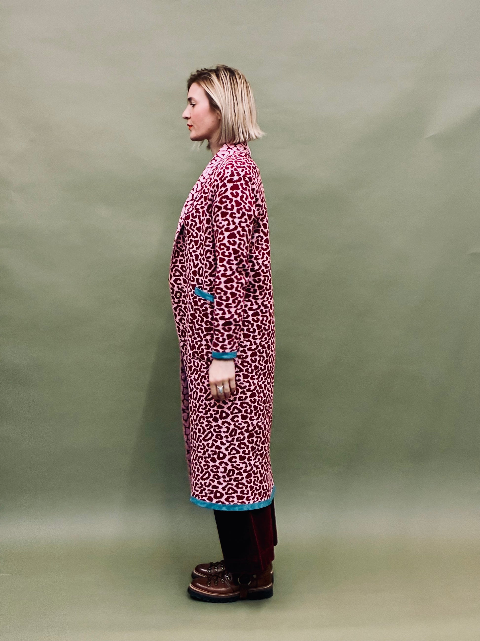 This warmer knitted coat features a bold leopard pattern, making it a perfect choice for adding a touch of wildness to your cozy wardrobe. Has cut pockets and two copper snap fasteners at the waist.