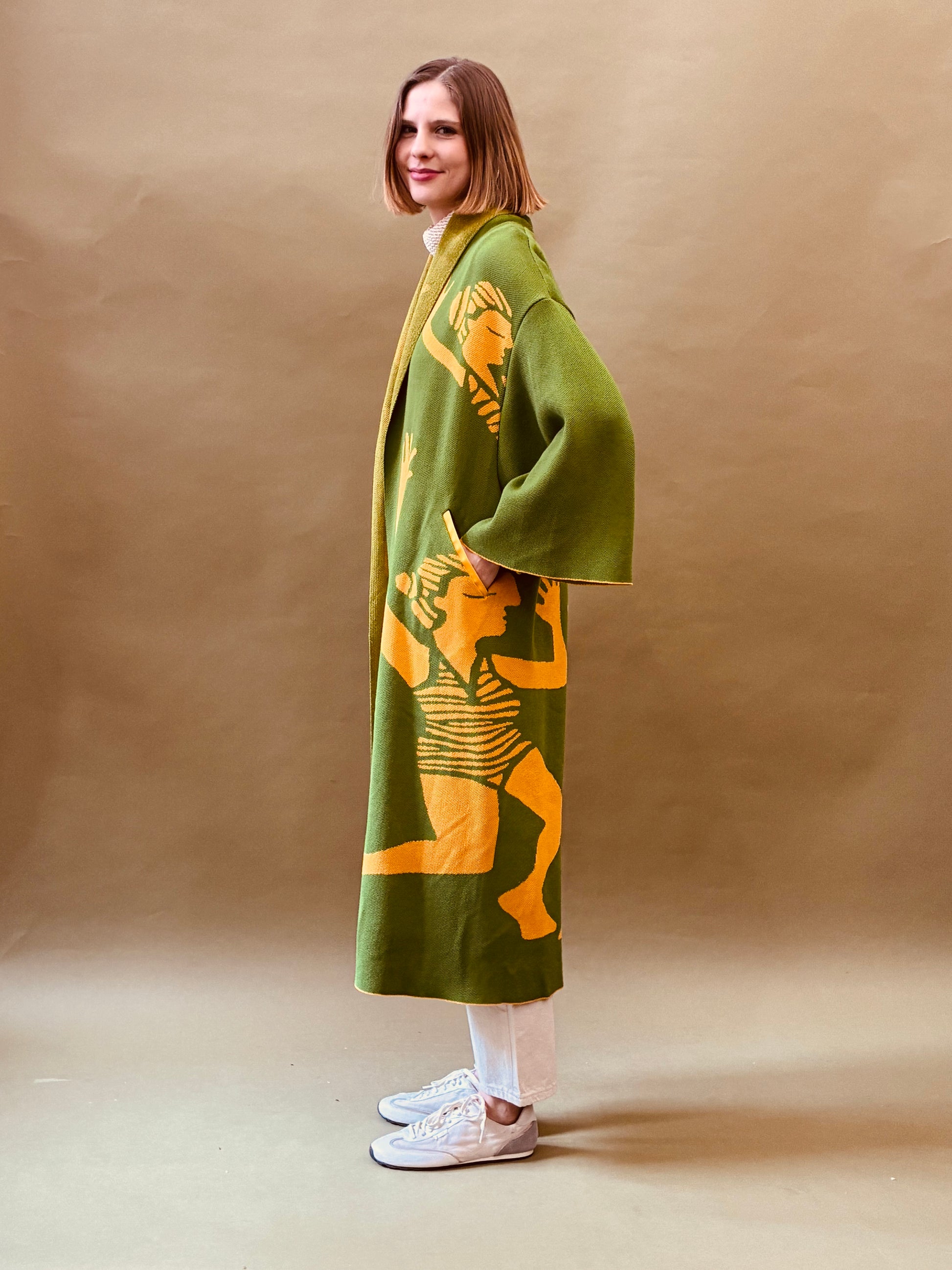 The Susan Coat features a special pattern based on the artwork of Zsuzsanna Péger. Her illustration of dancing women brings a playful, artistic rhythm to the piece, which we reimagined on our signature coat silhouette.