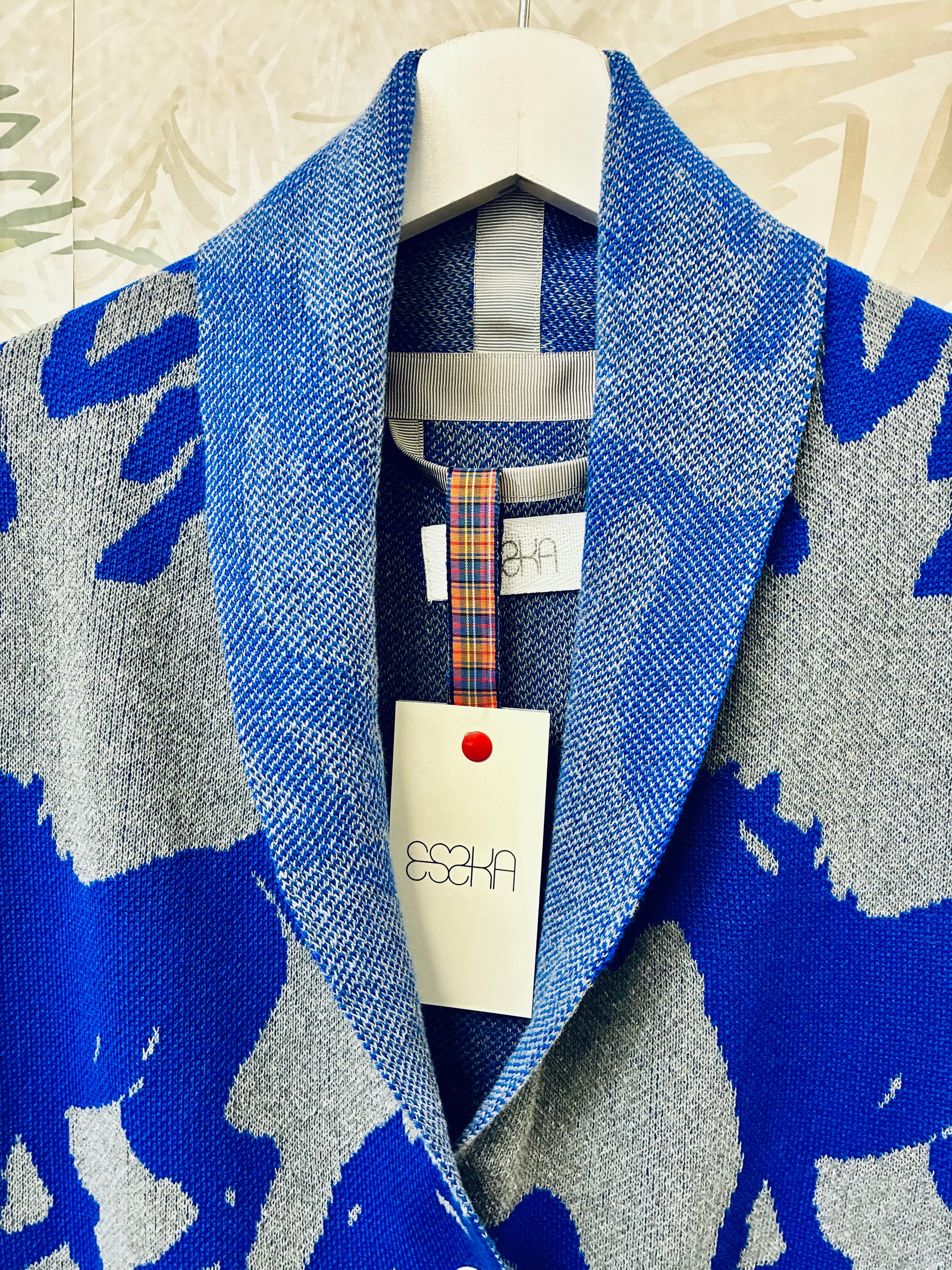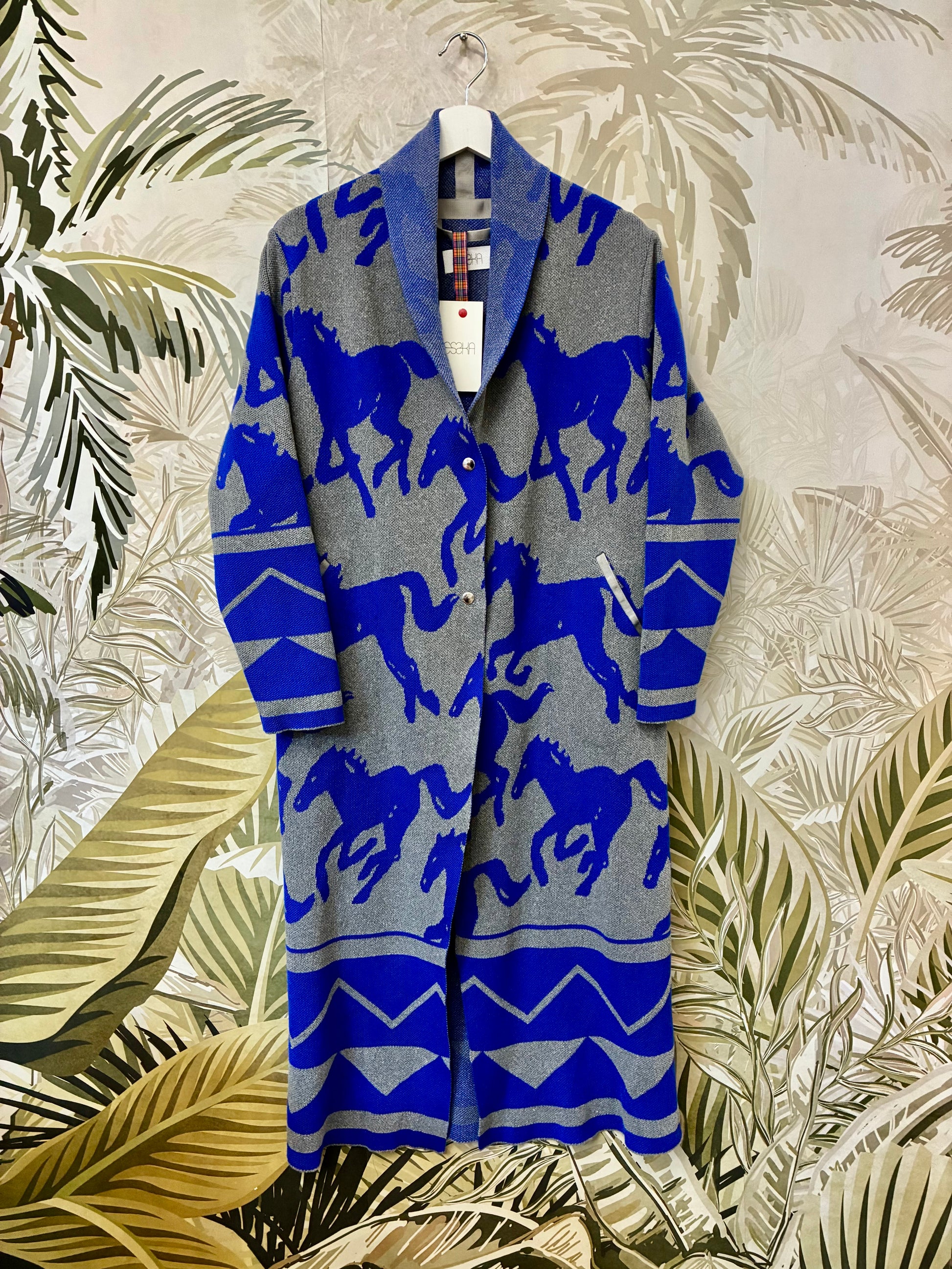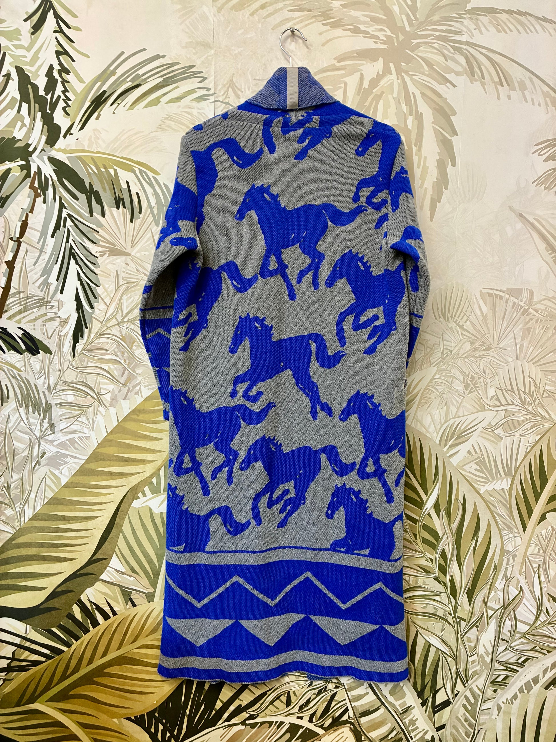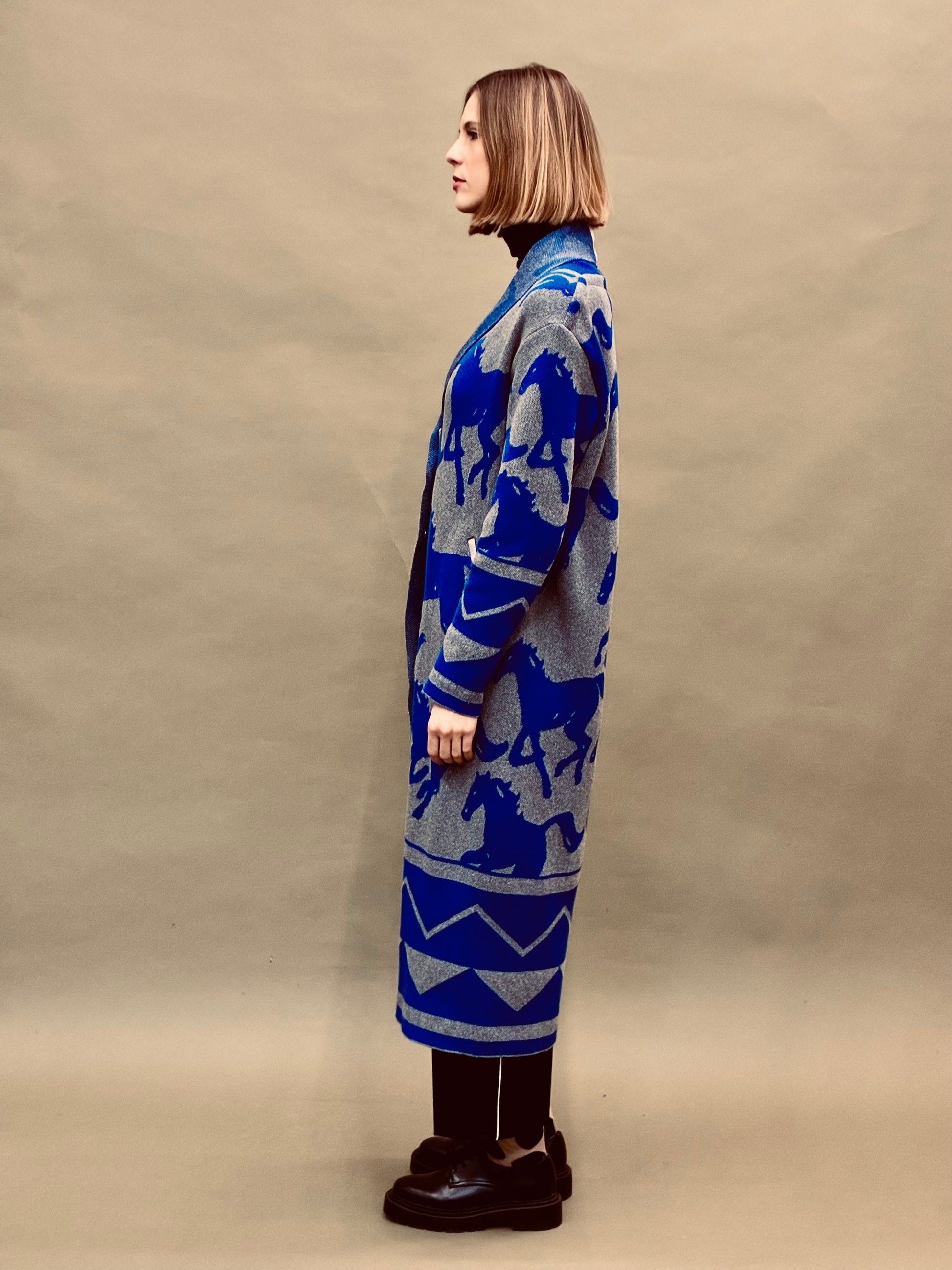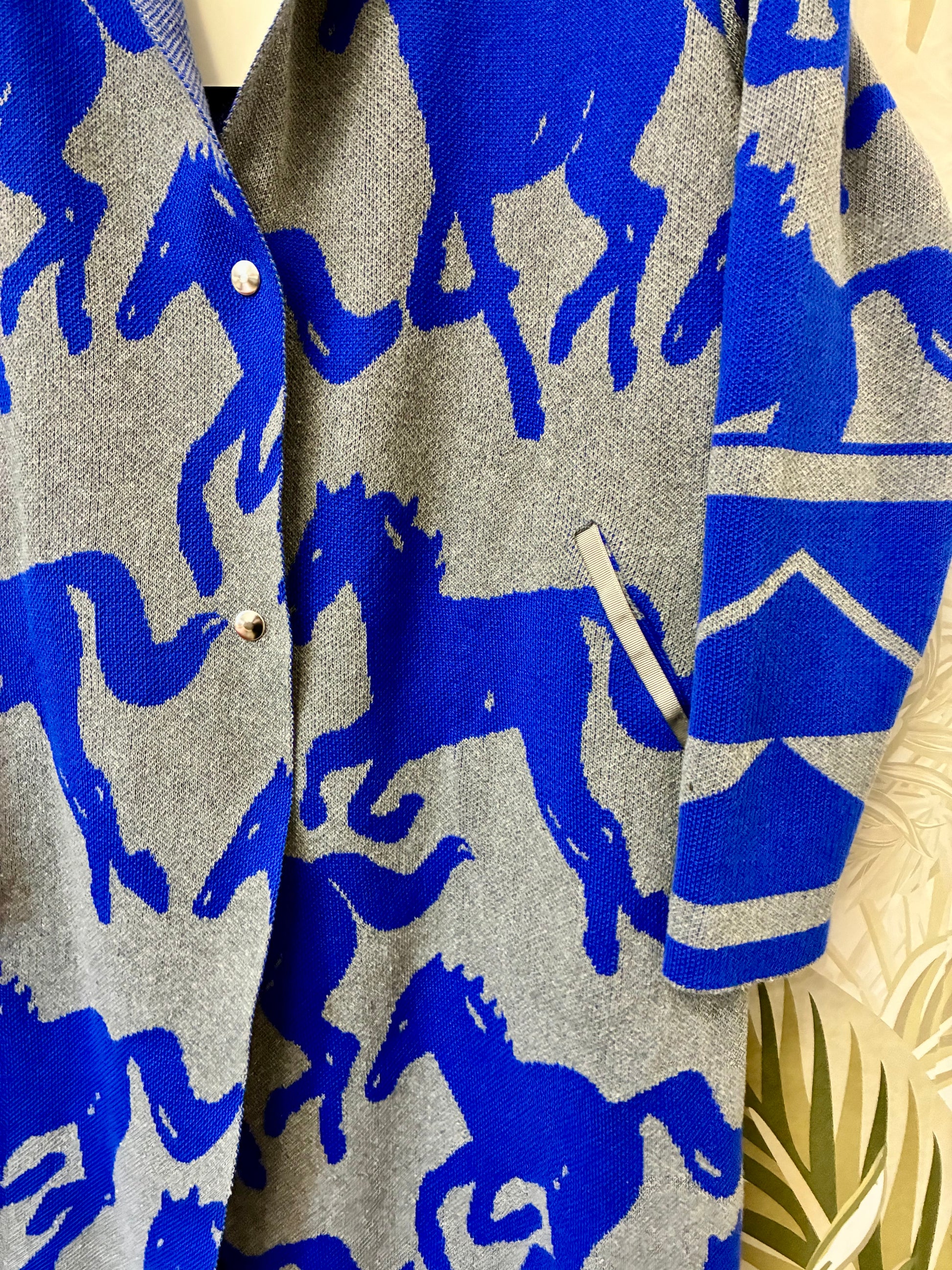 Knitted transitional light coat with aztec and horse pattern. Vibrant stylish colours, easy to wear. Has cut pockets and two smoke silver snap fastener at the waist.