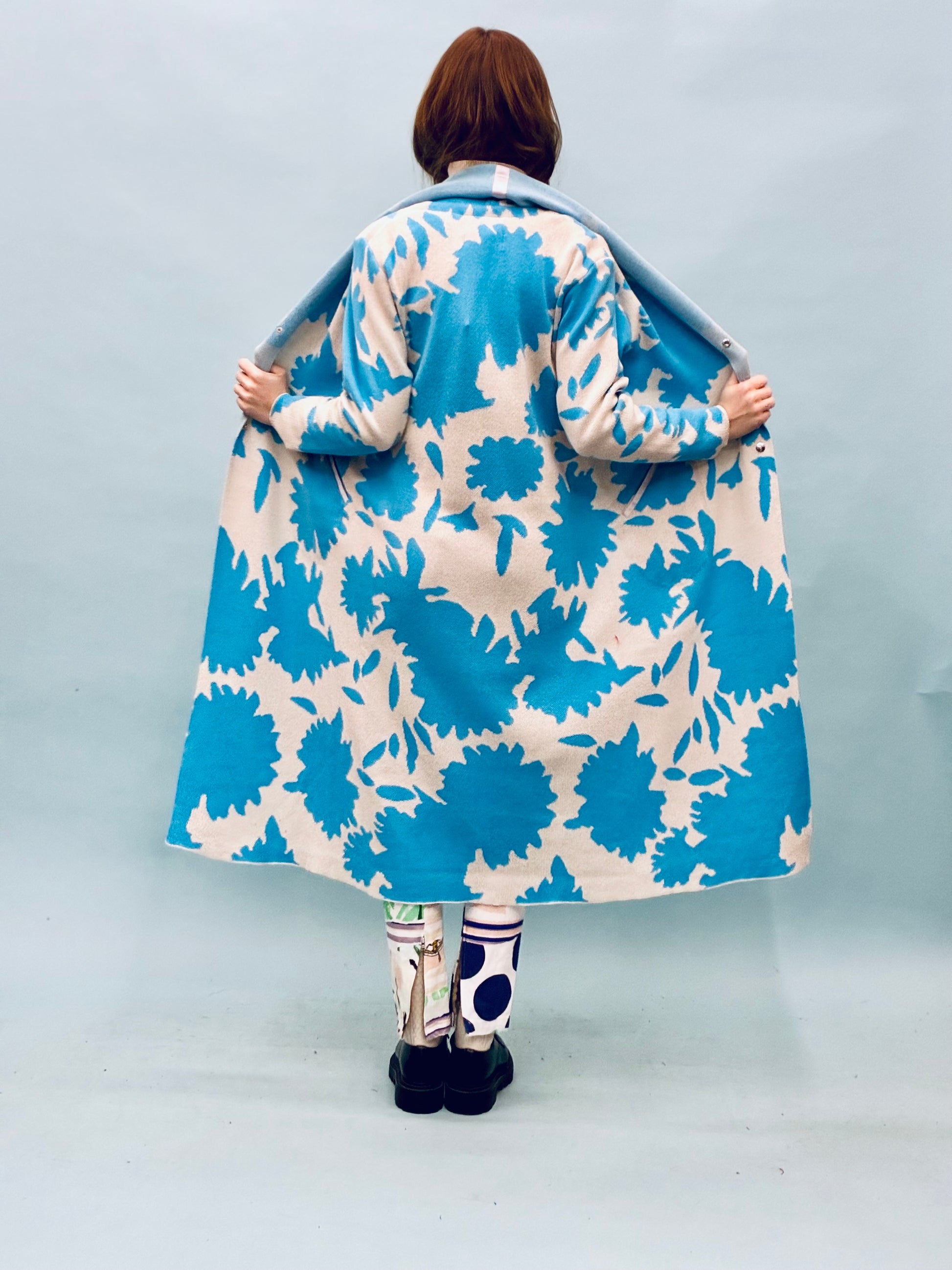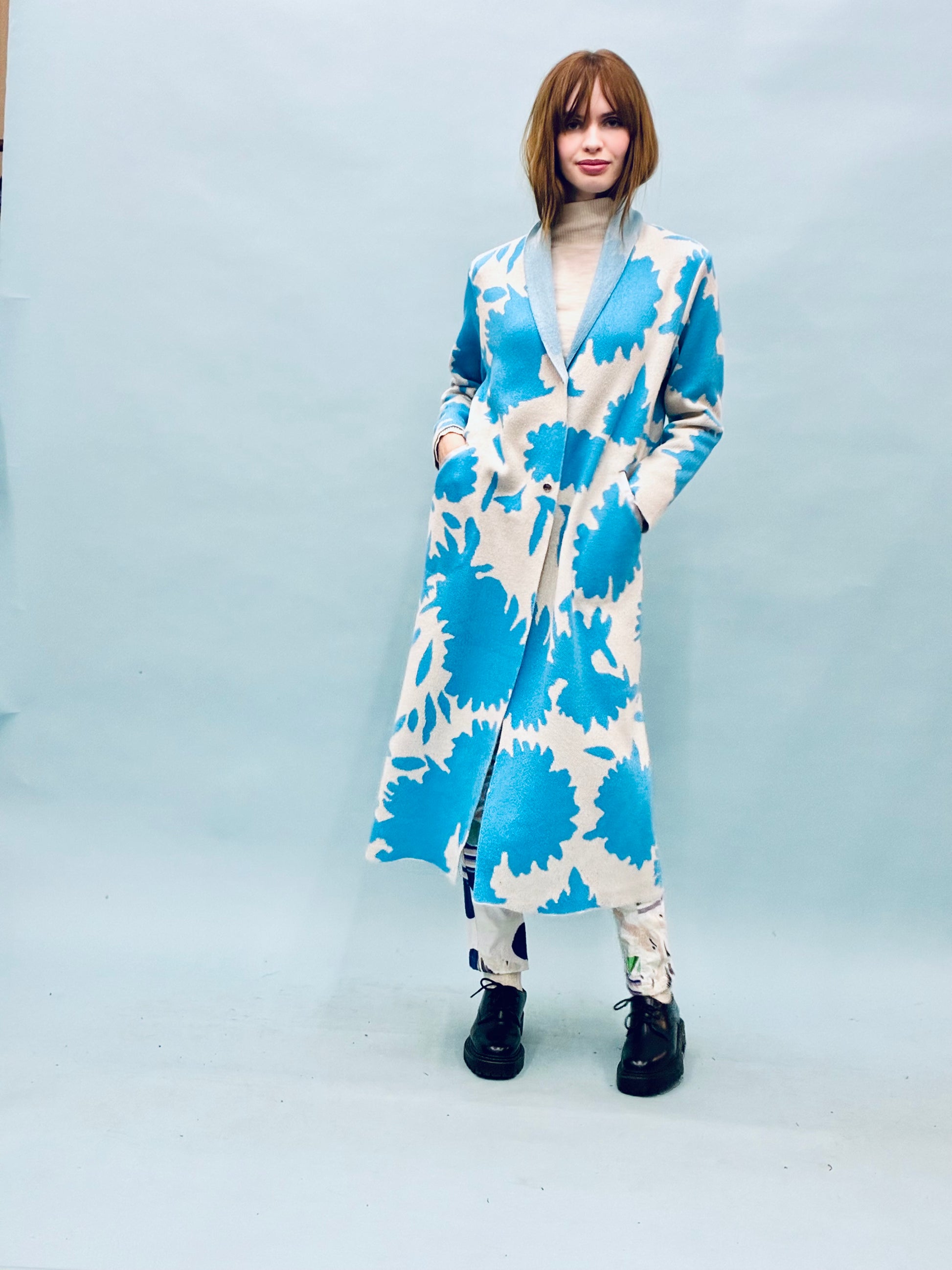 Light knitted coat with flower pattern. Has cut pockets and 2 silver snap fastener at the waits.
