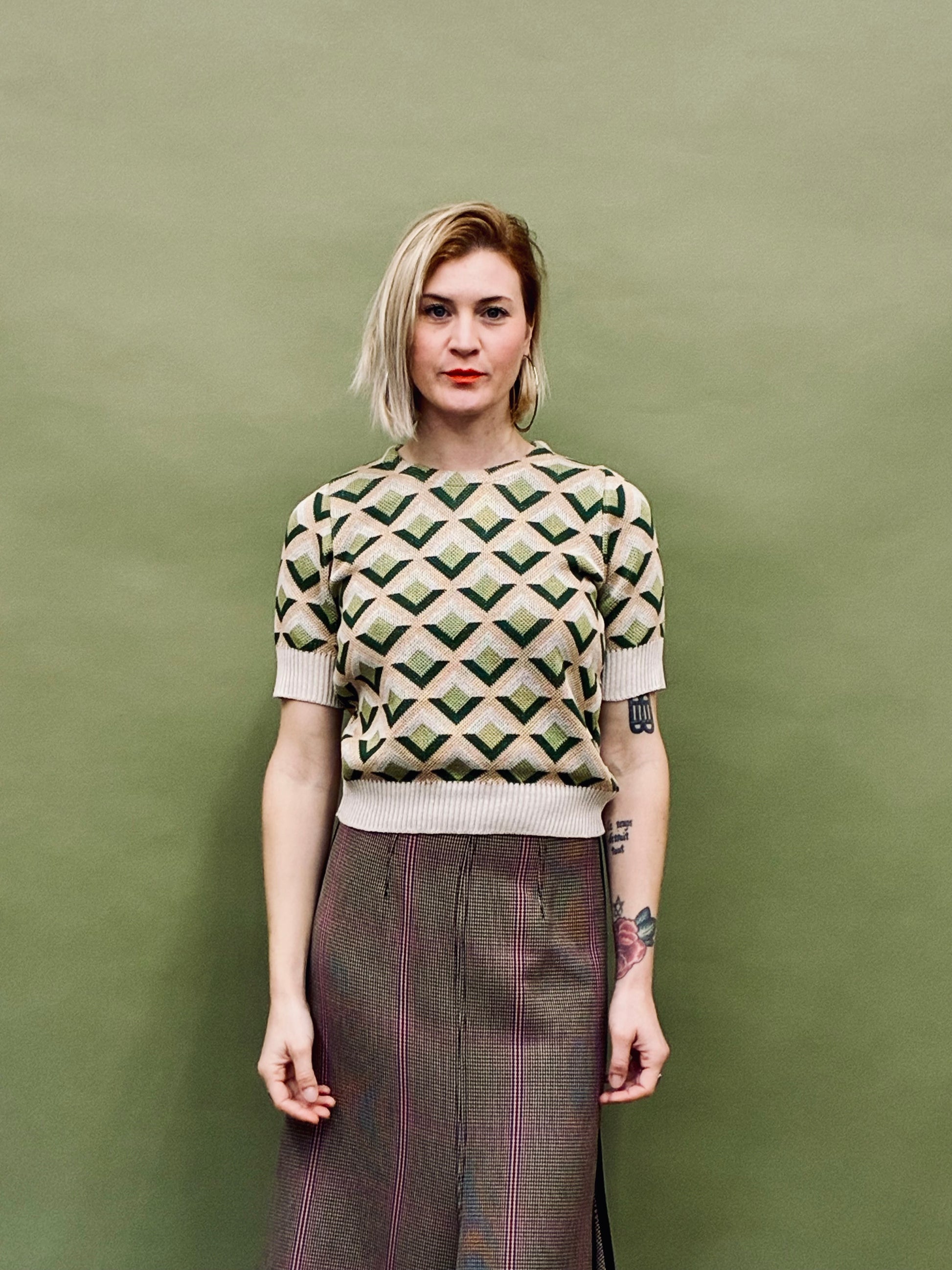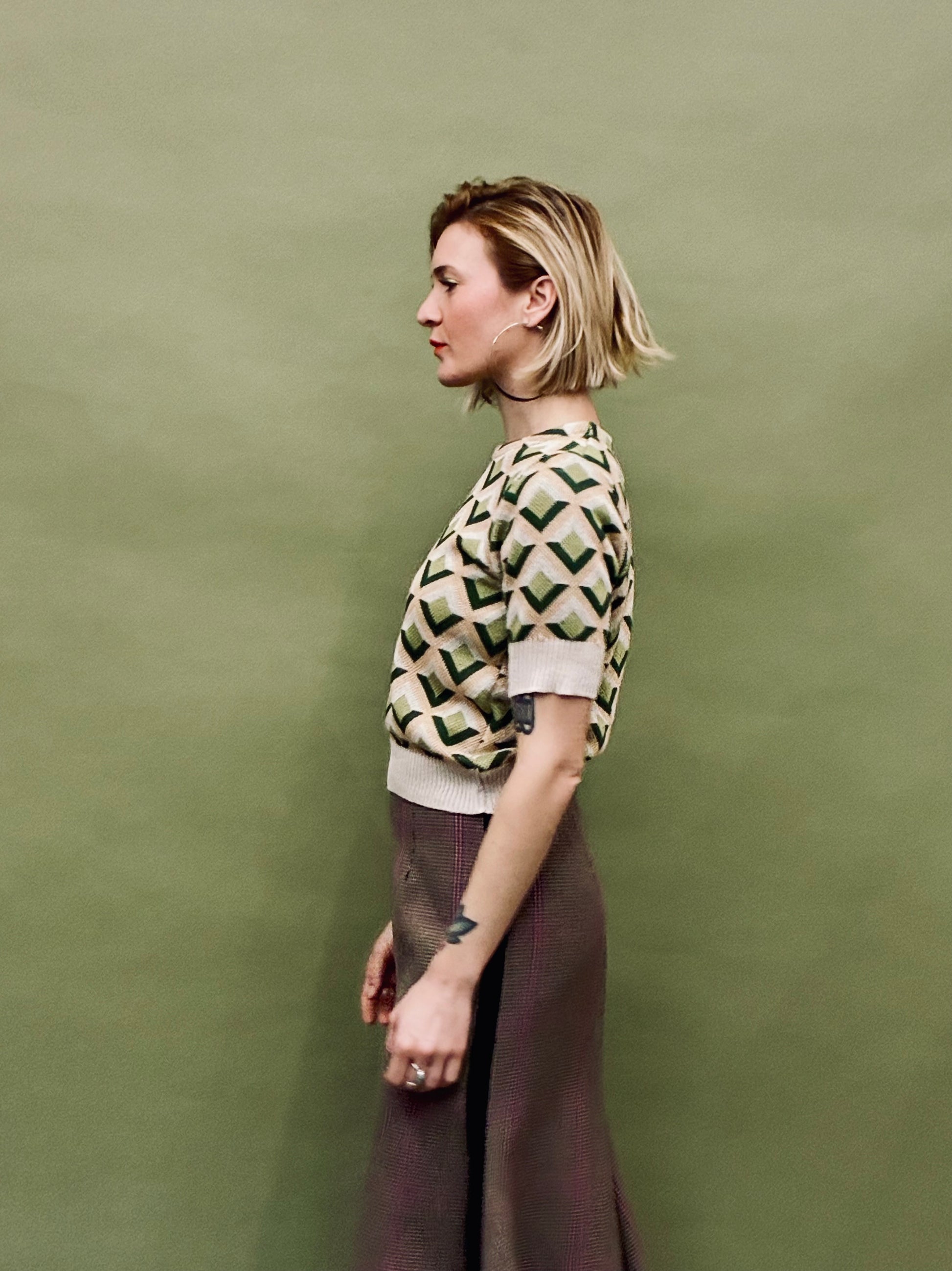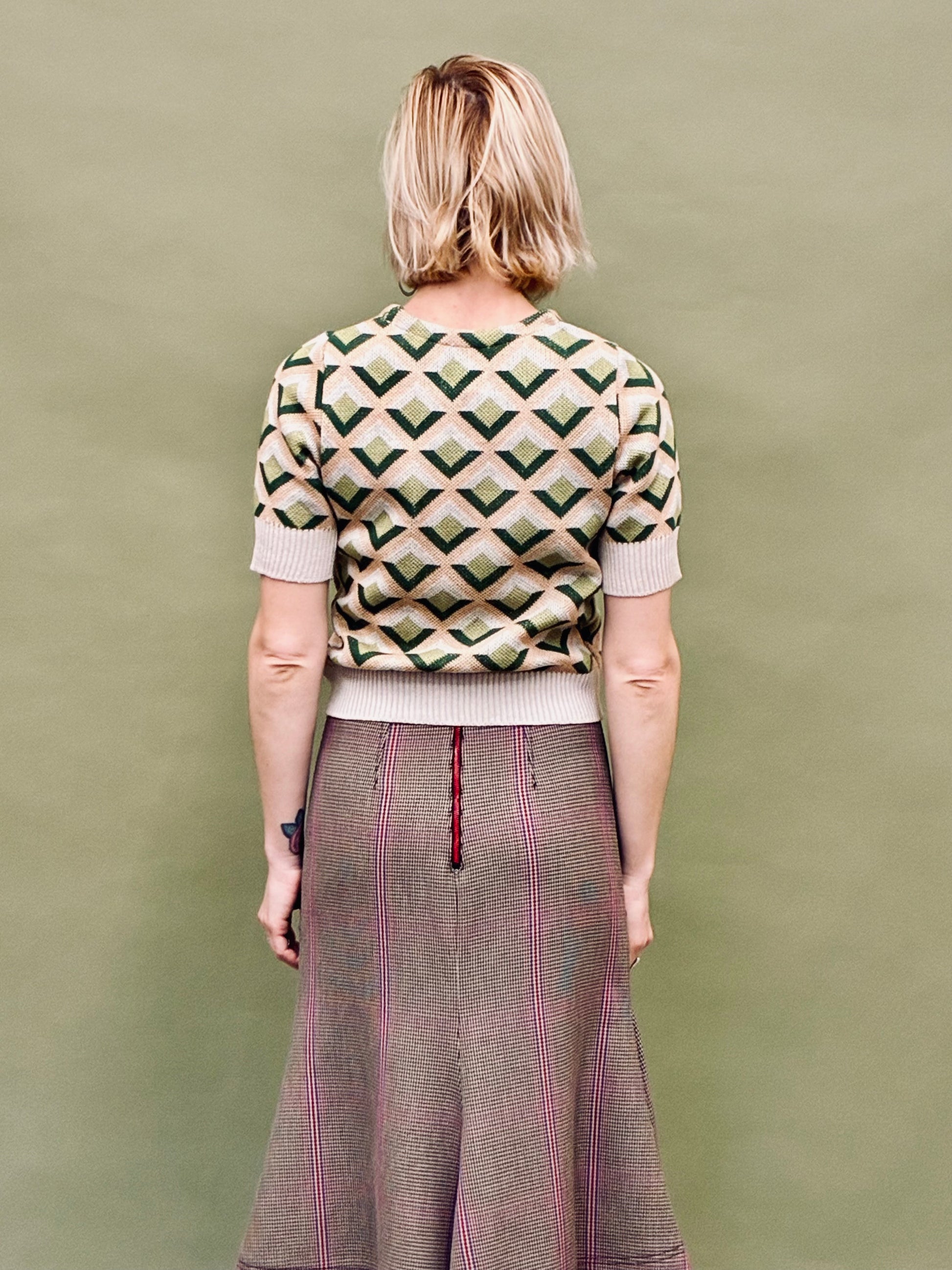 Knitted top with a geometric pattern. Four colored cozy knitted jumper with rib.