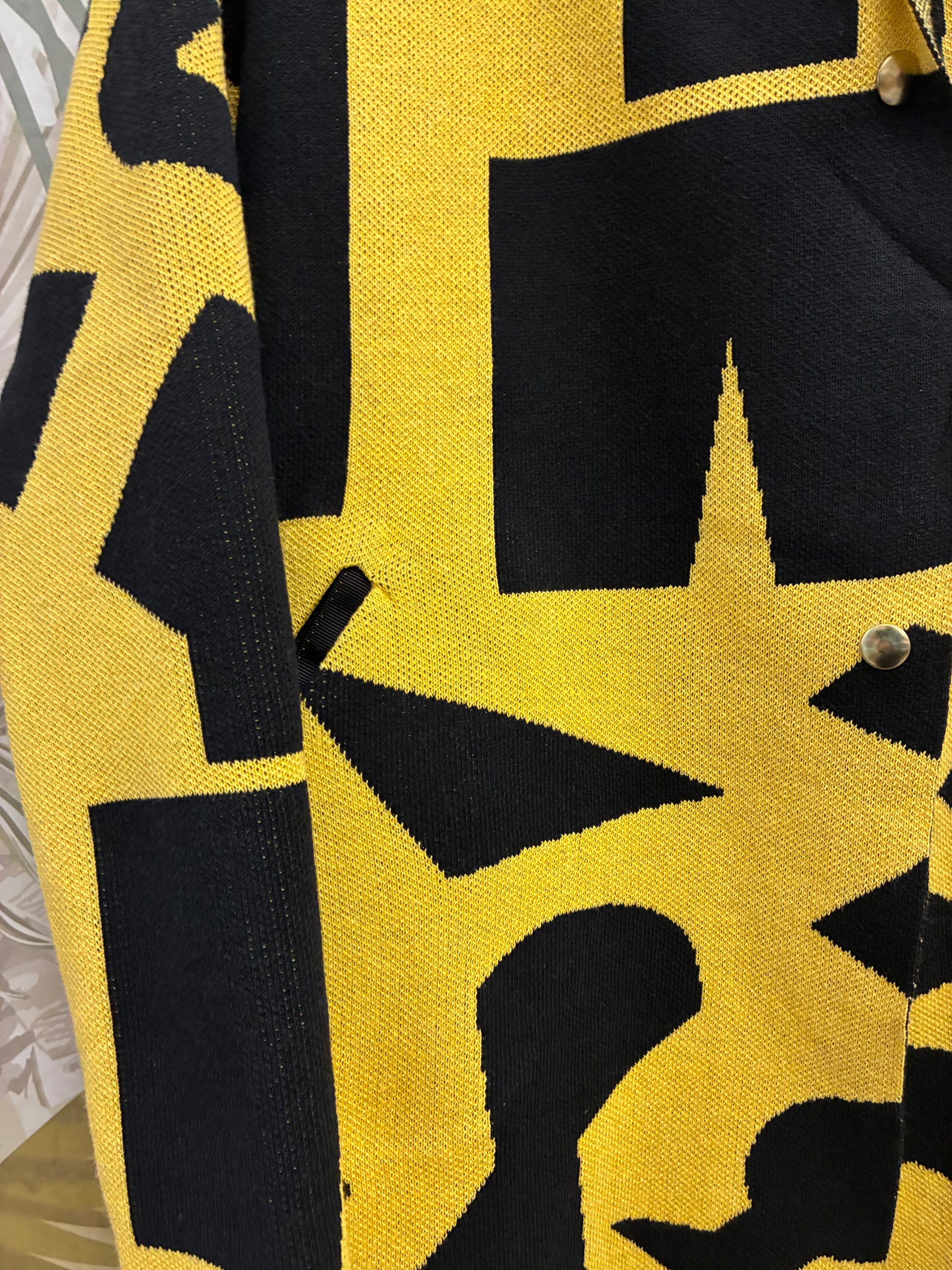 This pattern inspired by the african house painting.Light knitted coat, has cut pockets with black borders, and two smoke silver snap fasteners at the waist.