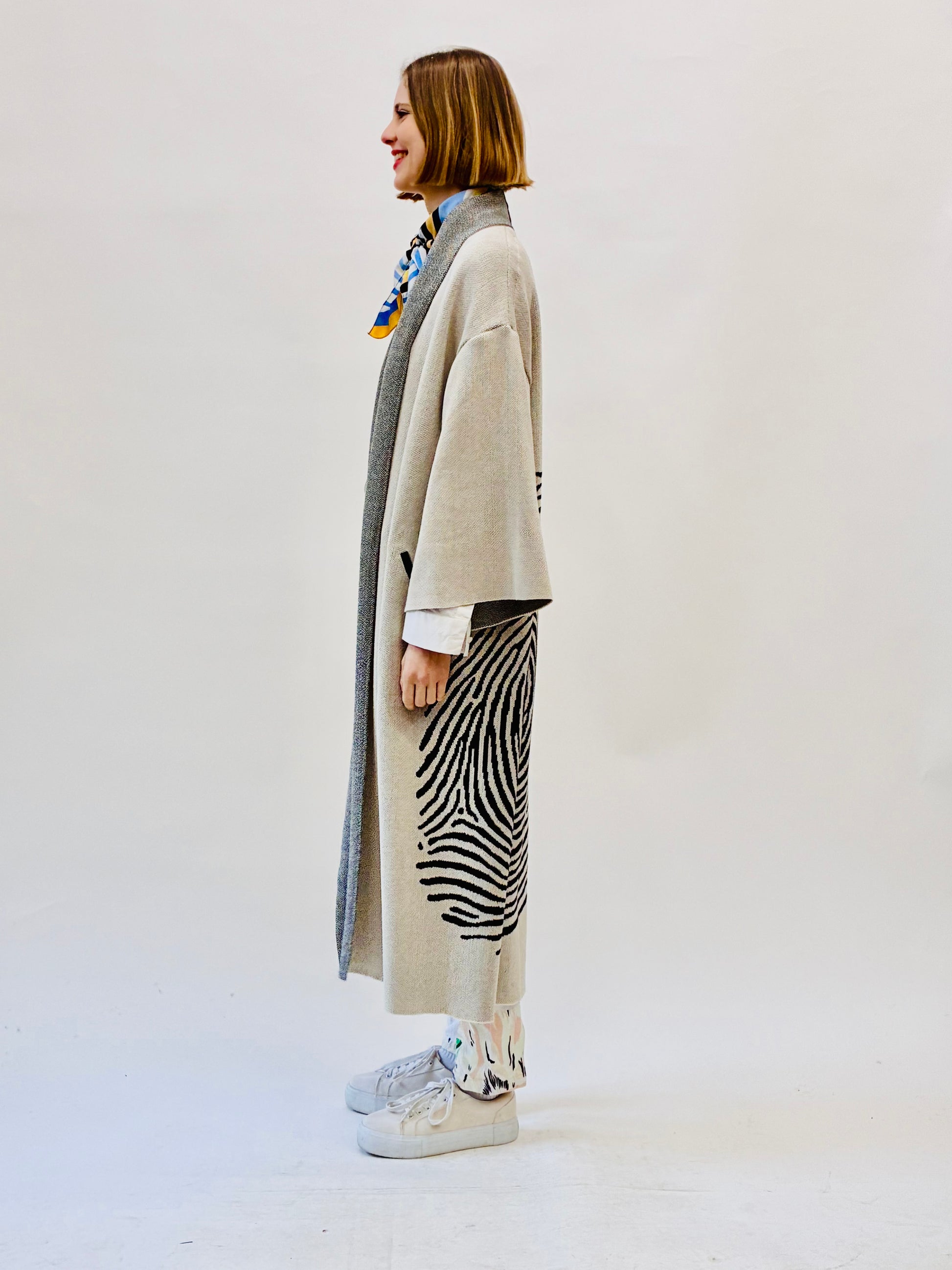 Knitted kimono shape coat with fingerprint pattern. Has cut pockets.