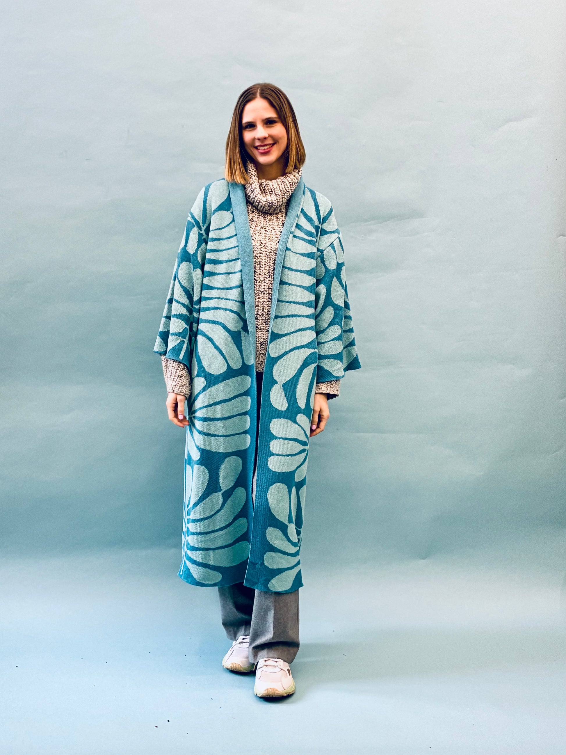 Knitted transitional kimono coat with 3/4 wide sleeves