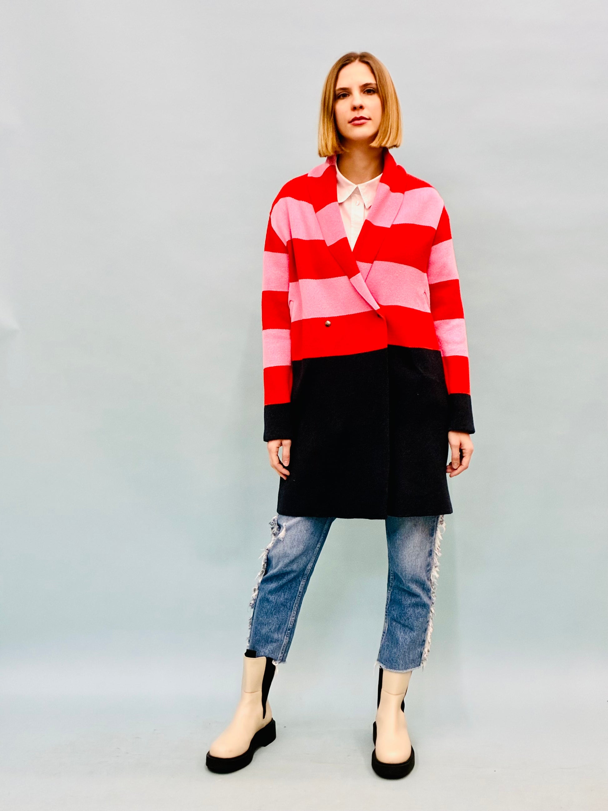 Knitted coat with stripes and color block. Easy to wear. Has cut pockets and silver snap fasteners at the waist.