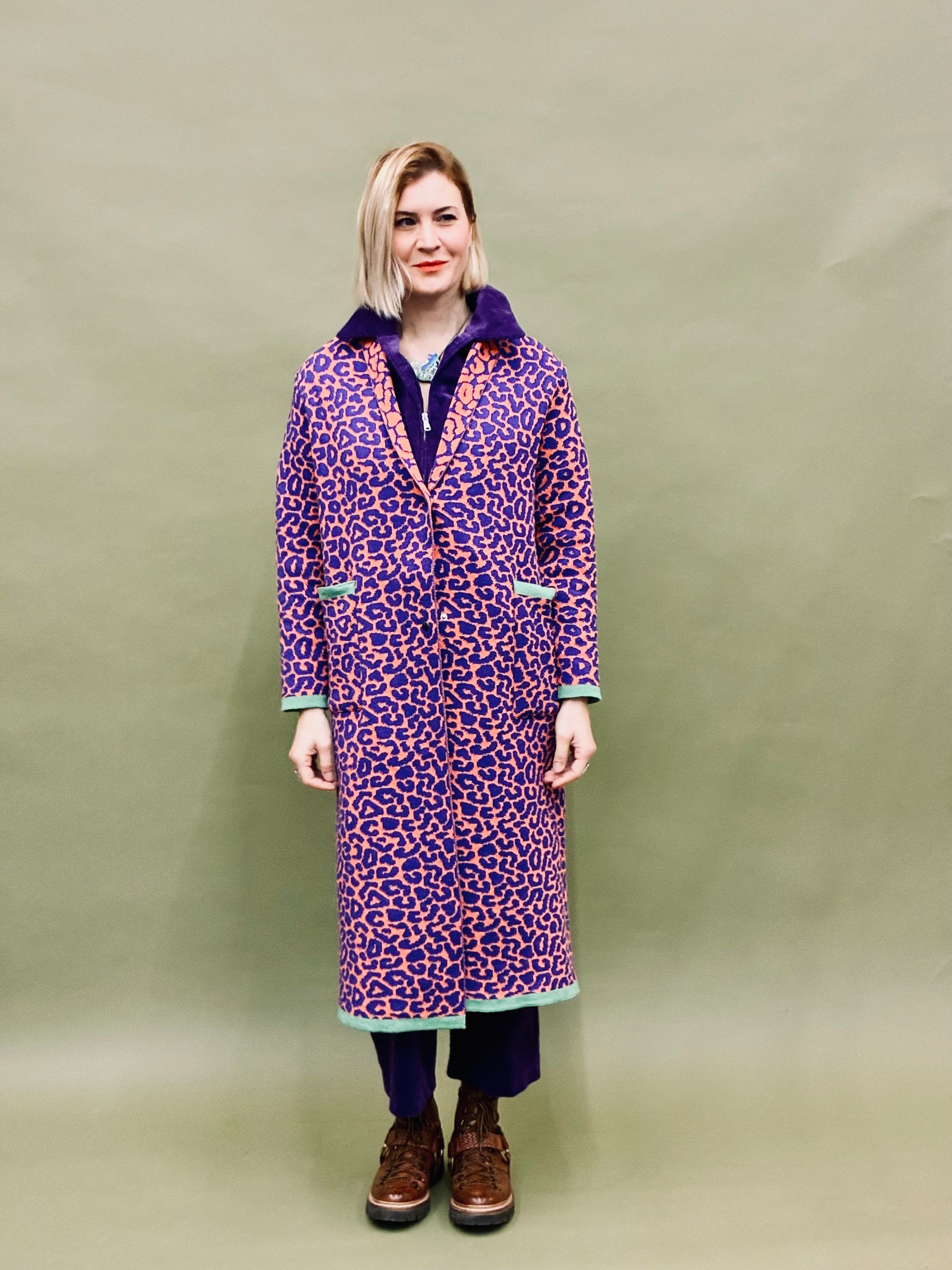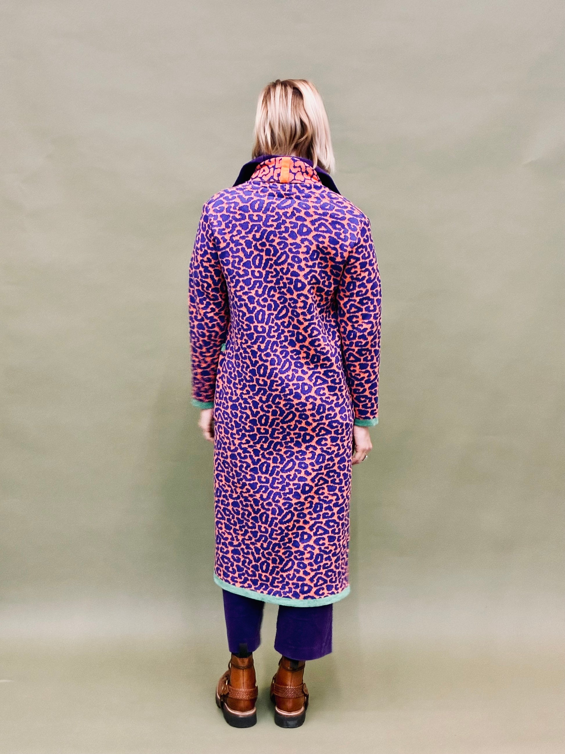 This warmer knitted coat features a bold leopard pattern, making it a perfect choice for adding a touch of wildness to your cozy wardrobe. Has cut pockets and two gold snap fasteners at the waist.