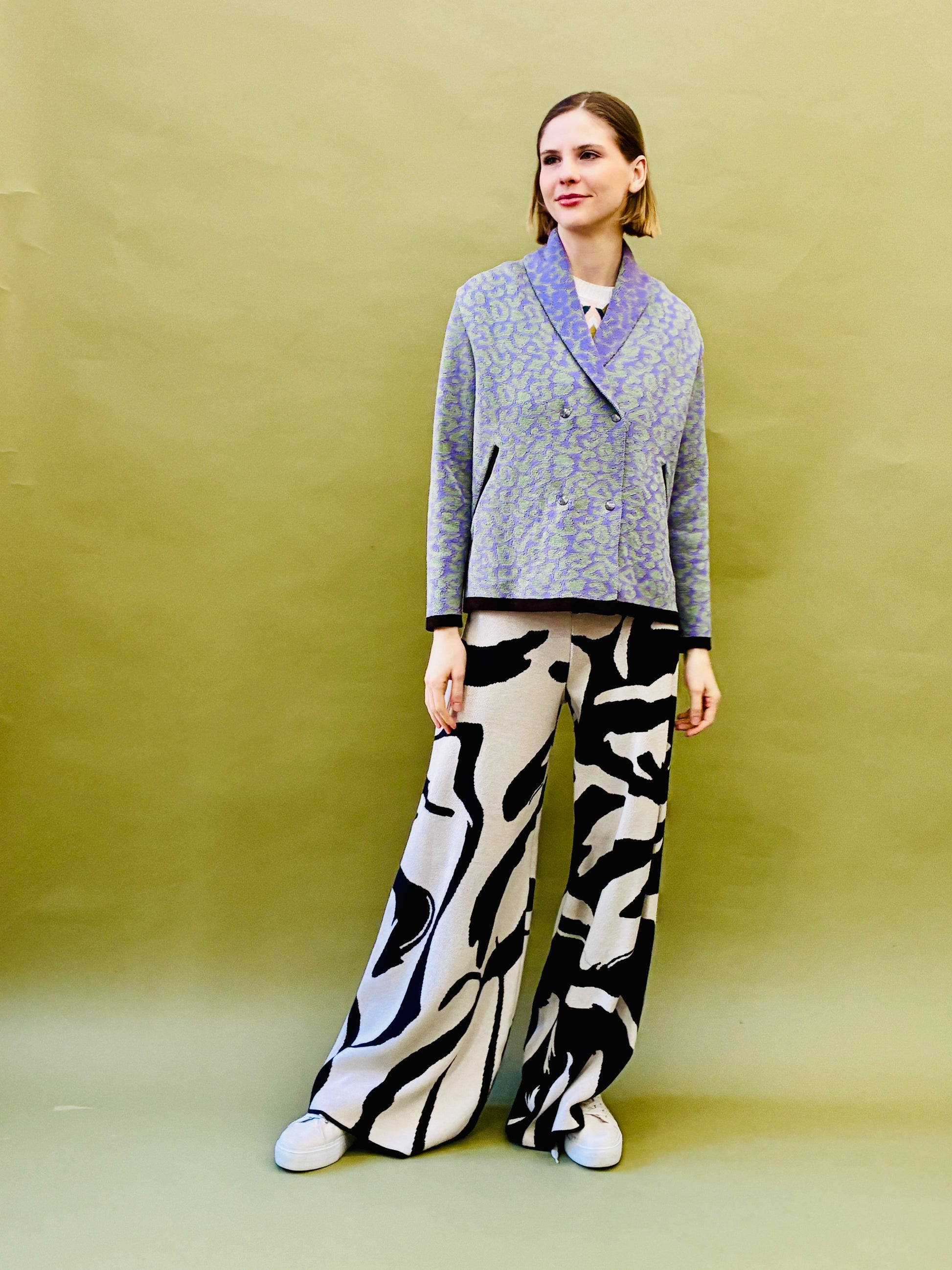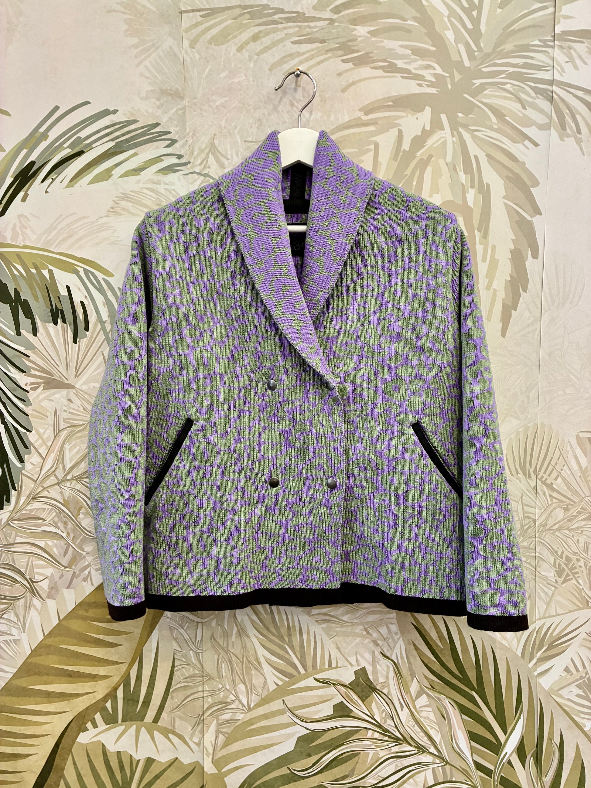Short knitted coat with leopard pattern. It has four snap fastener at the waist. There is a brown border at the bottom, at the end of the sleeves and at the top of the pockets.