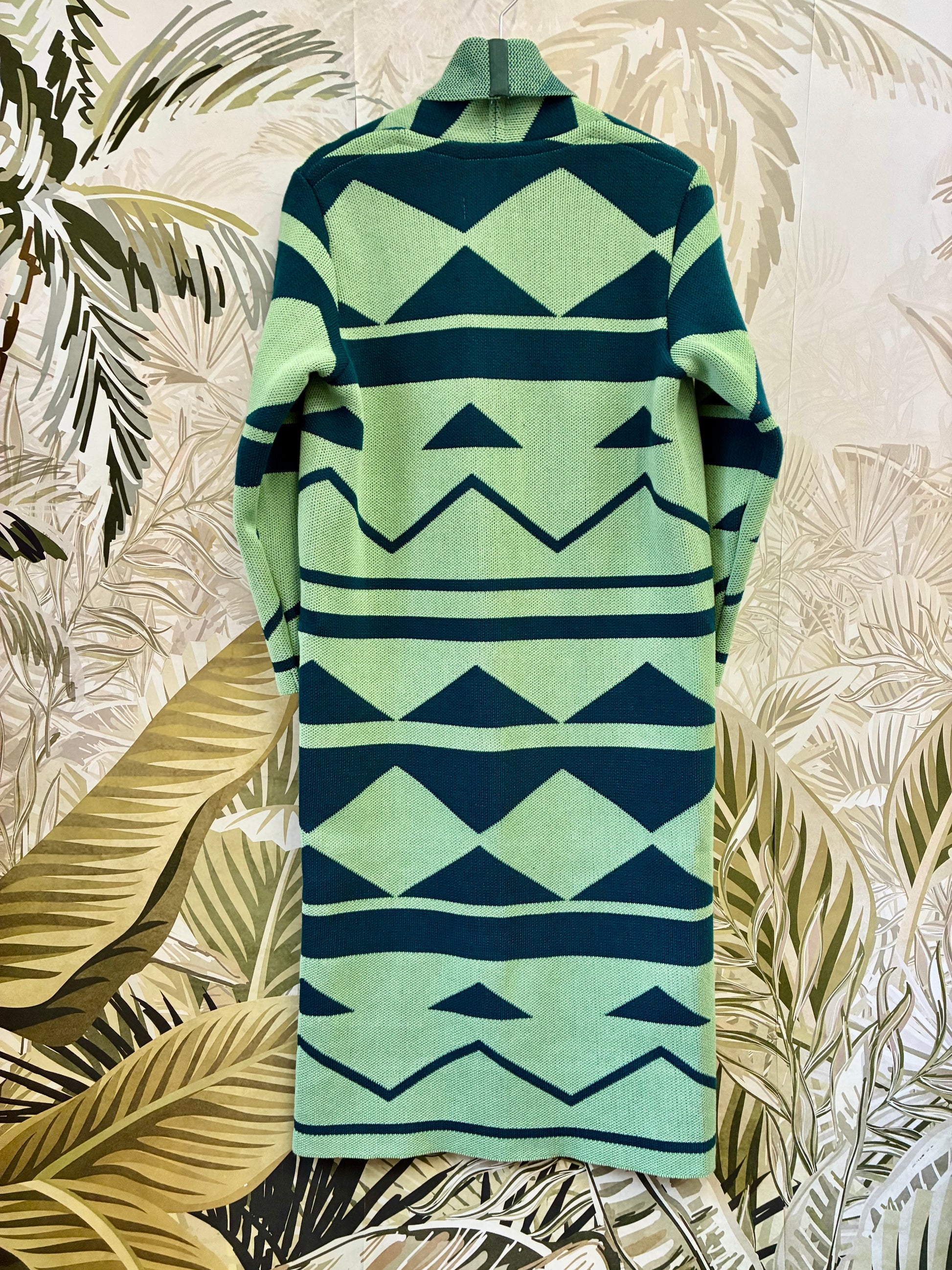 Knitted coat with aztec pattern. Nice pastel colours, easy to wear. Has cut pockets, and two smoke silver snap fastener at the waist.
