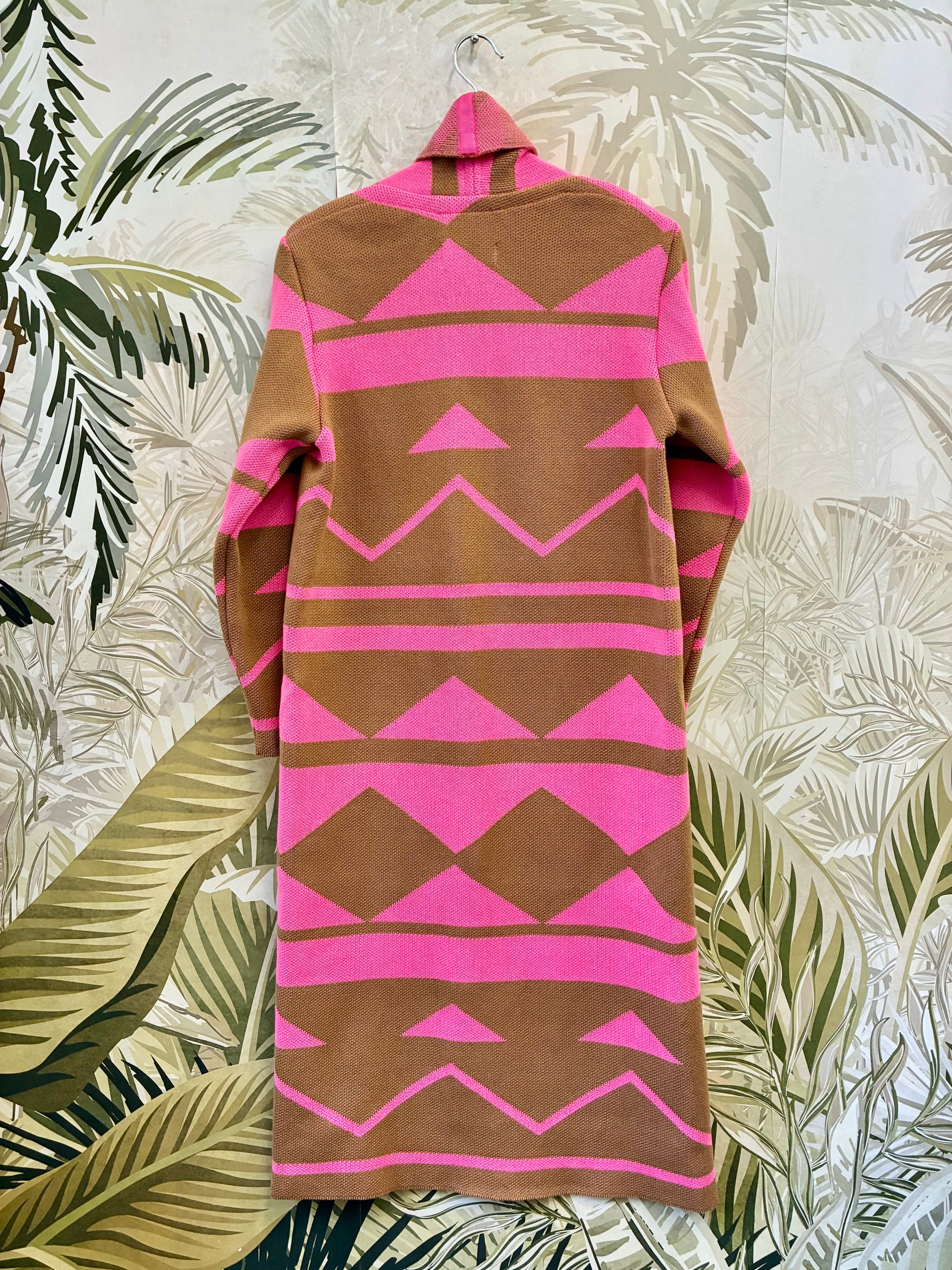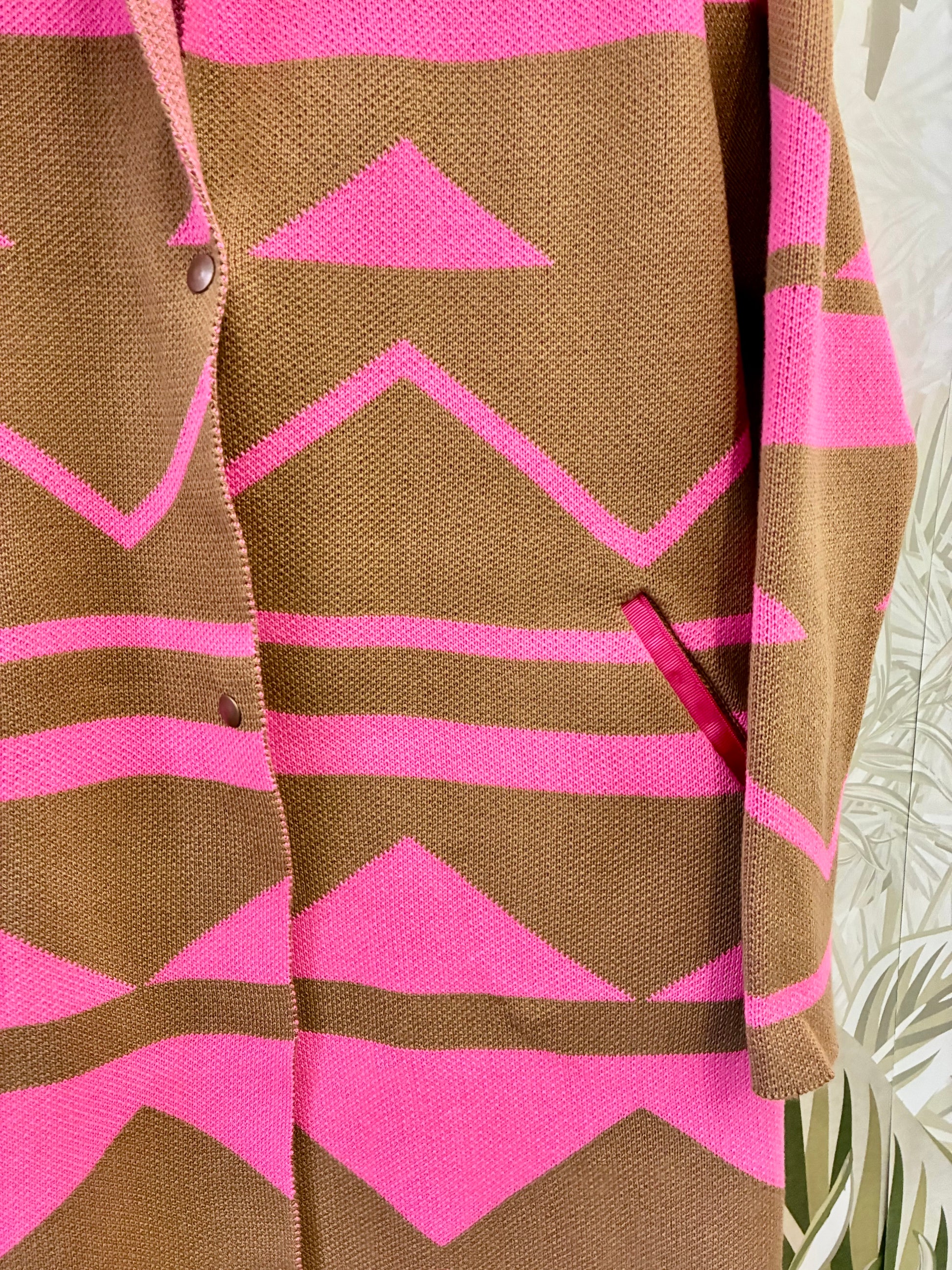 Knitted coat with aztec pattern. Nice pastel colours, easy to wear. Has cut pockets, and two copper snap fastener at the waist.