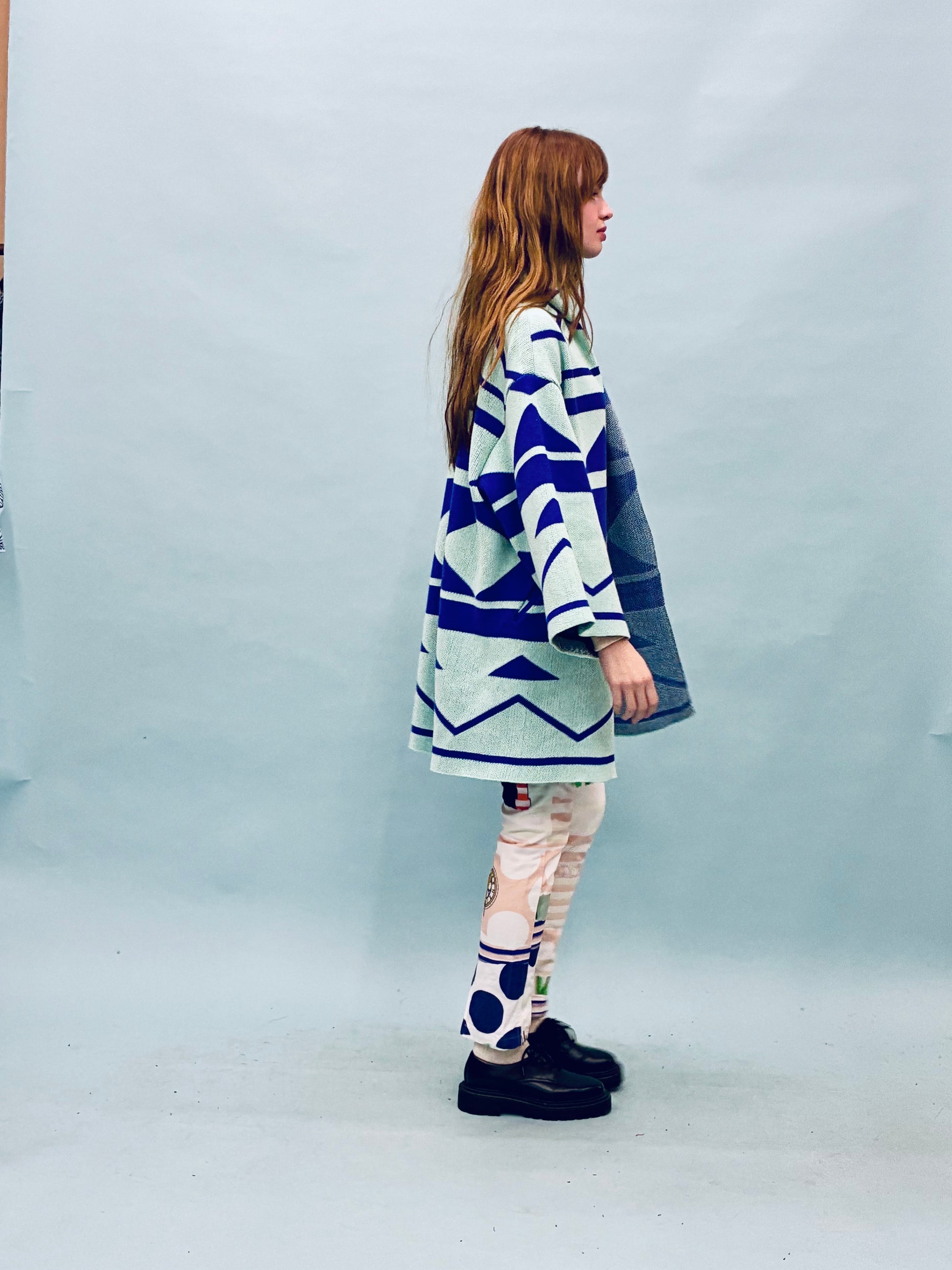 Knitted kimono coat with aztec pattern. Nice pastel colours, easy to wear. Has cut pockets, and two silver snap fastener at the waist.