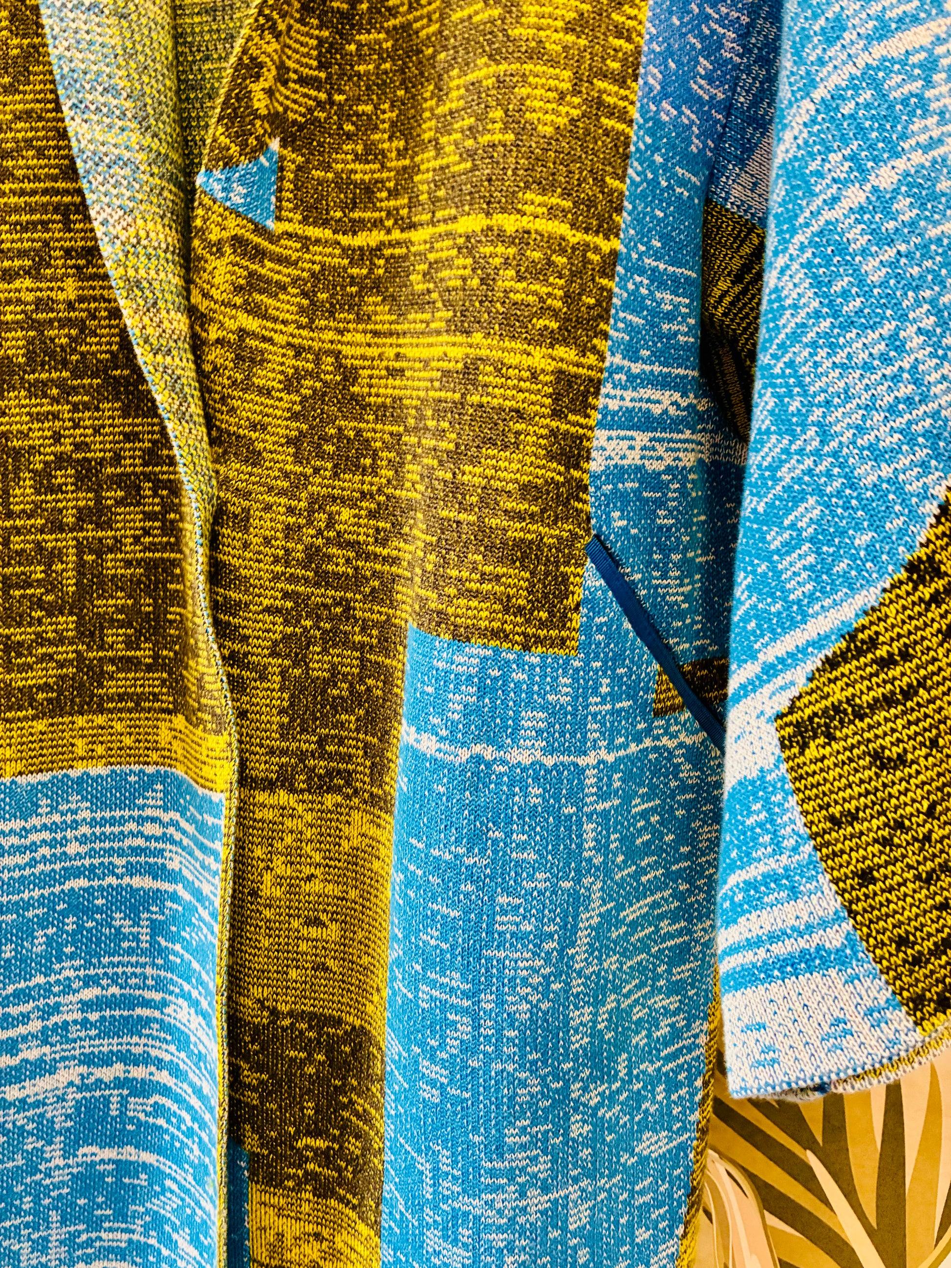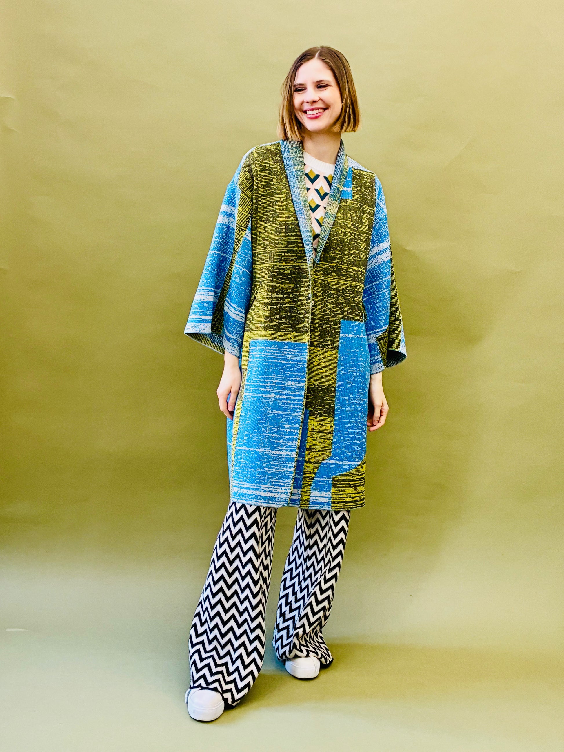 This pattern inspired by the bauhaus art. Warmer knitted kimono coat. Has cut pockets with blue borders, and one silver snap fastener at the waist.