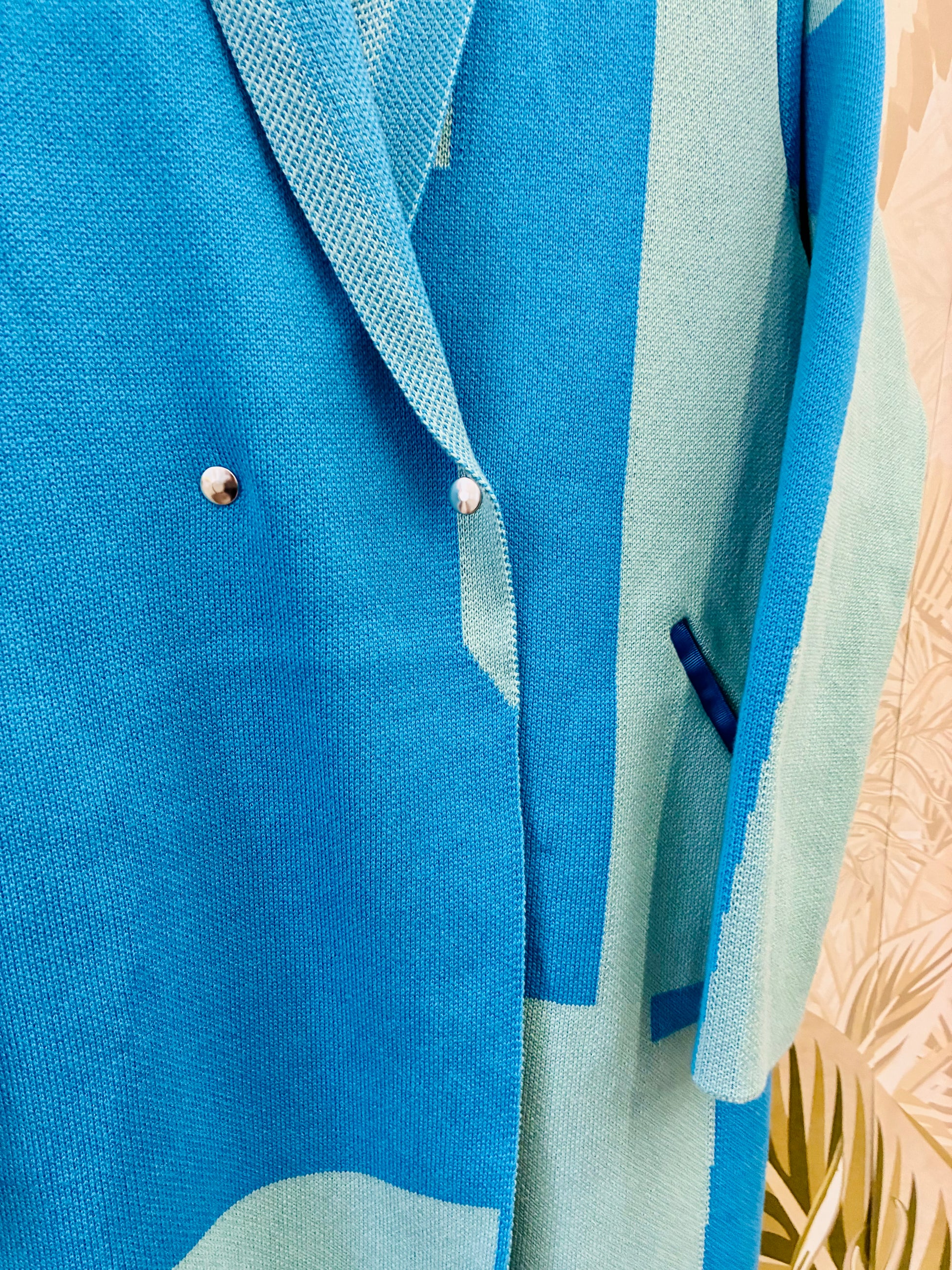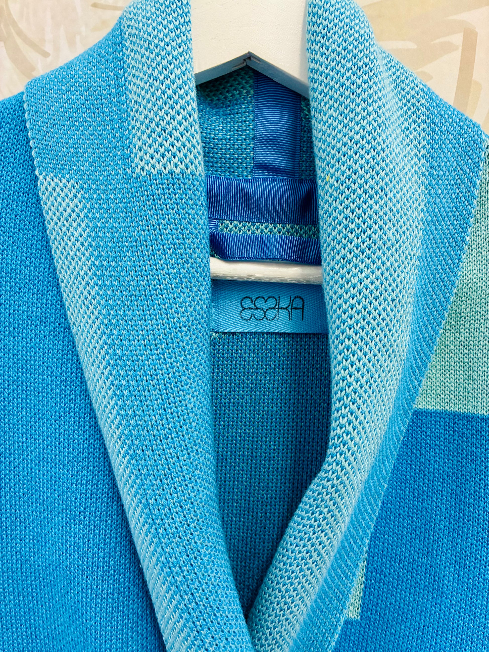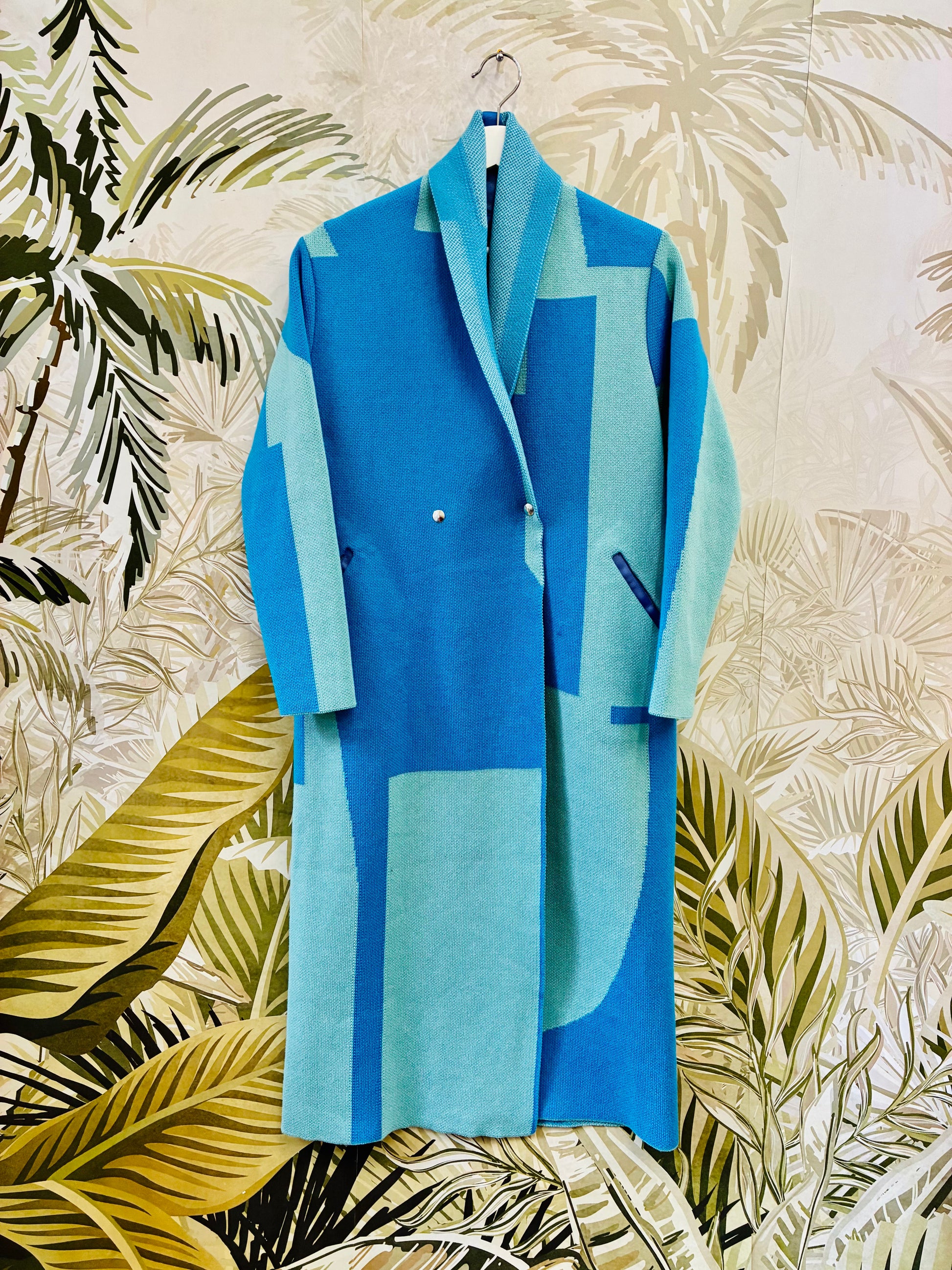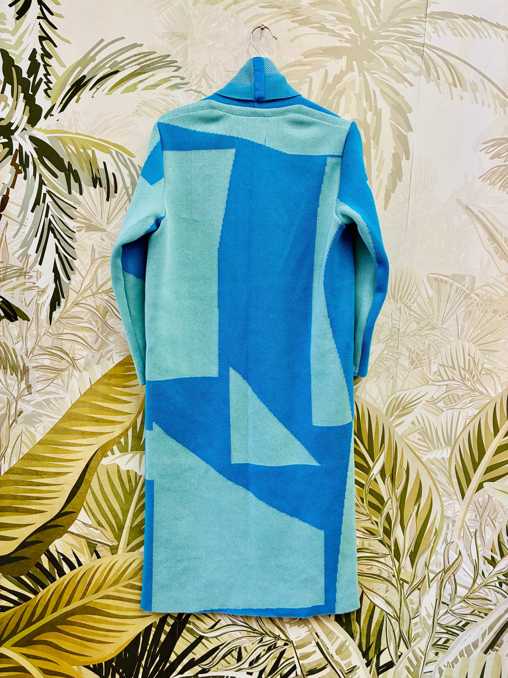 This pattern inspired by the bauhaus art. Warmer knitted coat. Has cut pockets with blue borders, and two silver snap fasteners at the waist.
