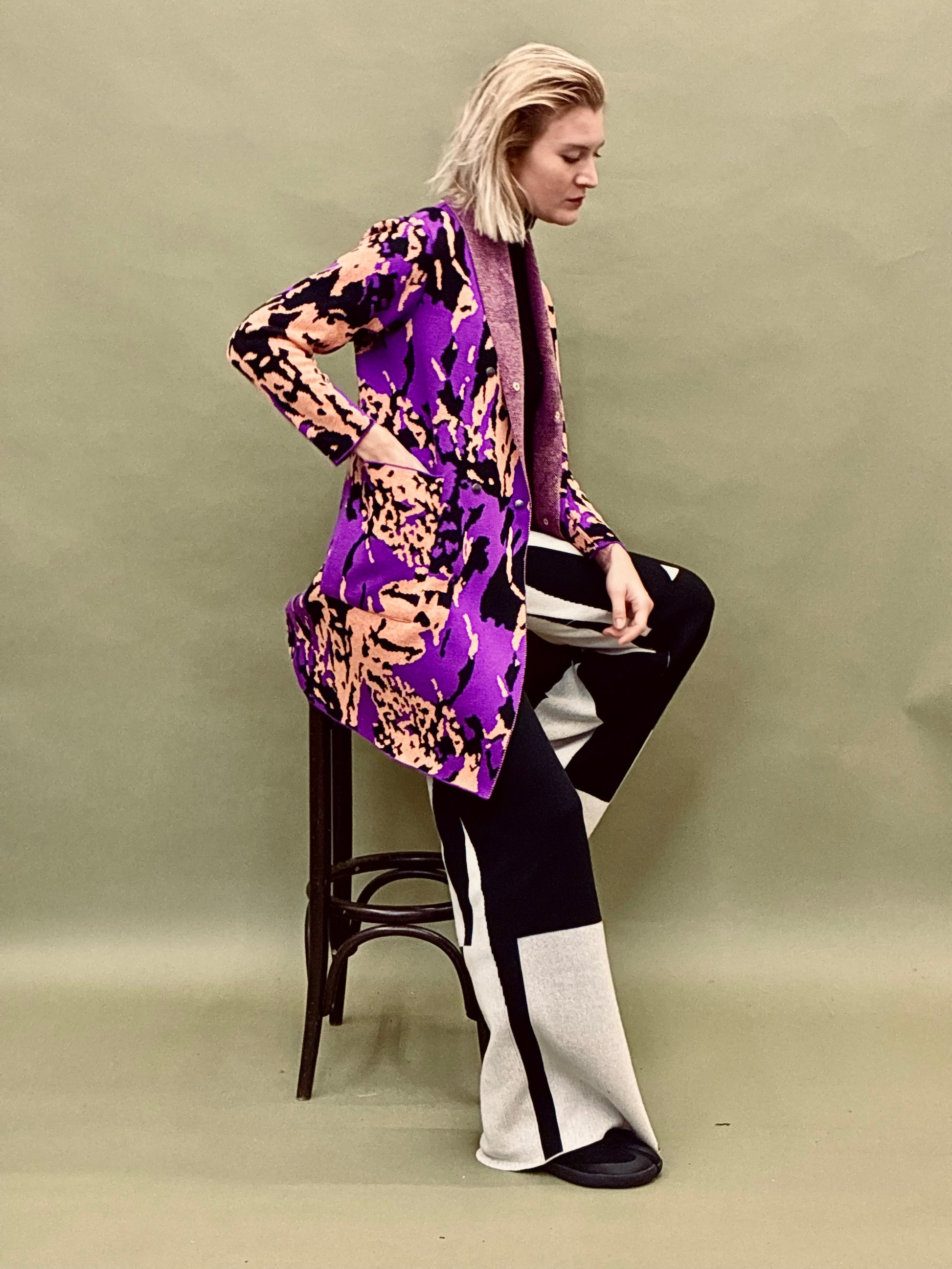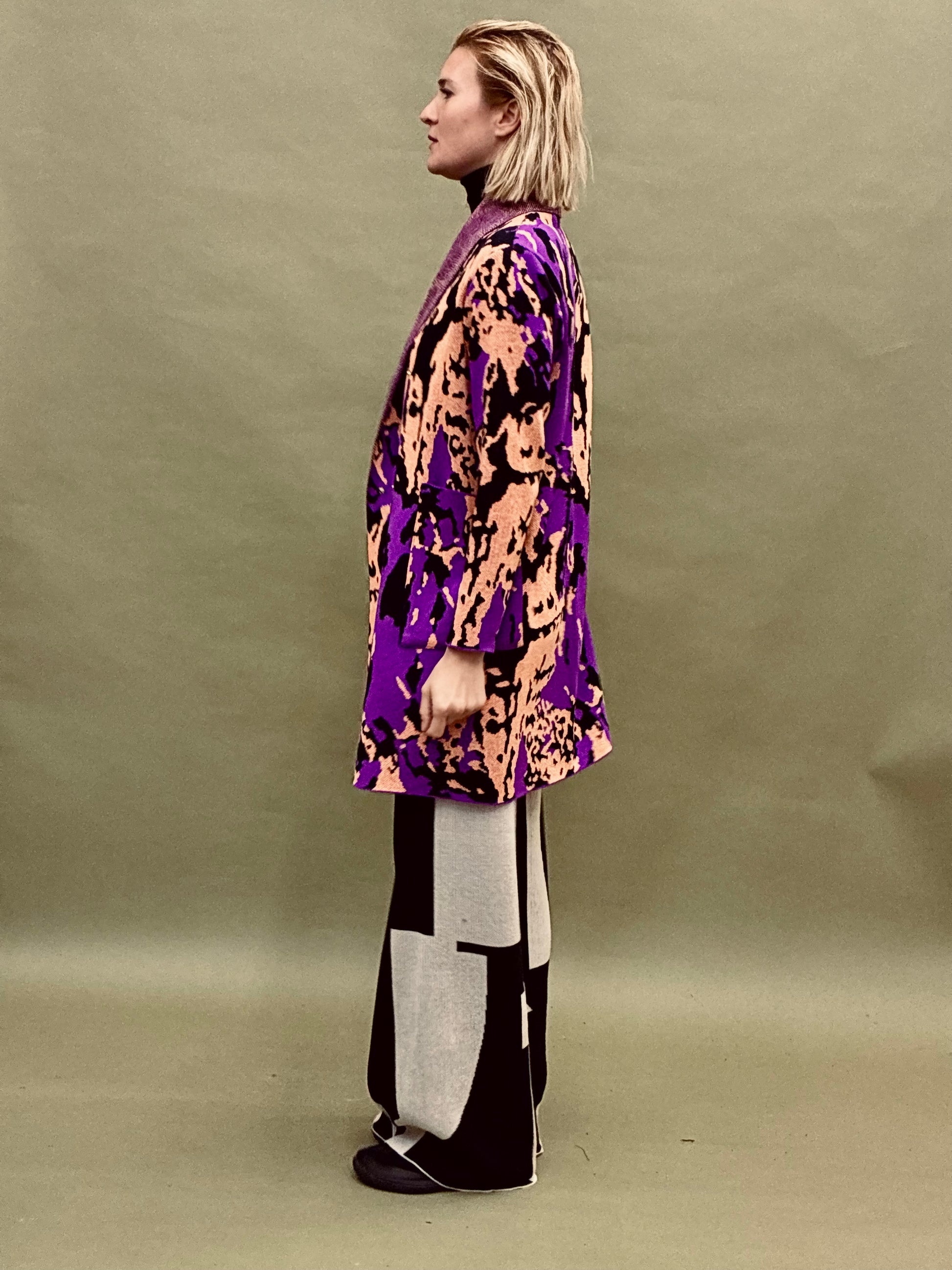Autumn knitted coat with a paint splatter pattern. Has cut pockets and four snap fasteners at the waist.