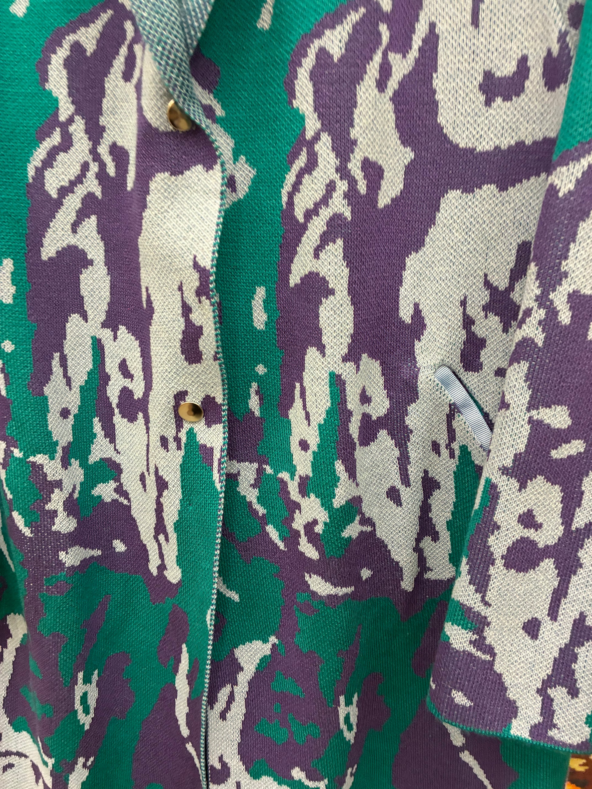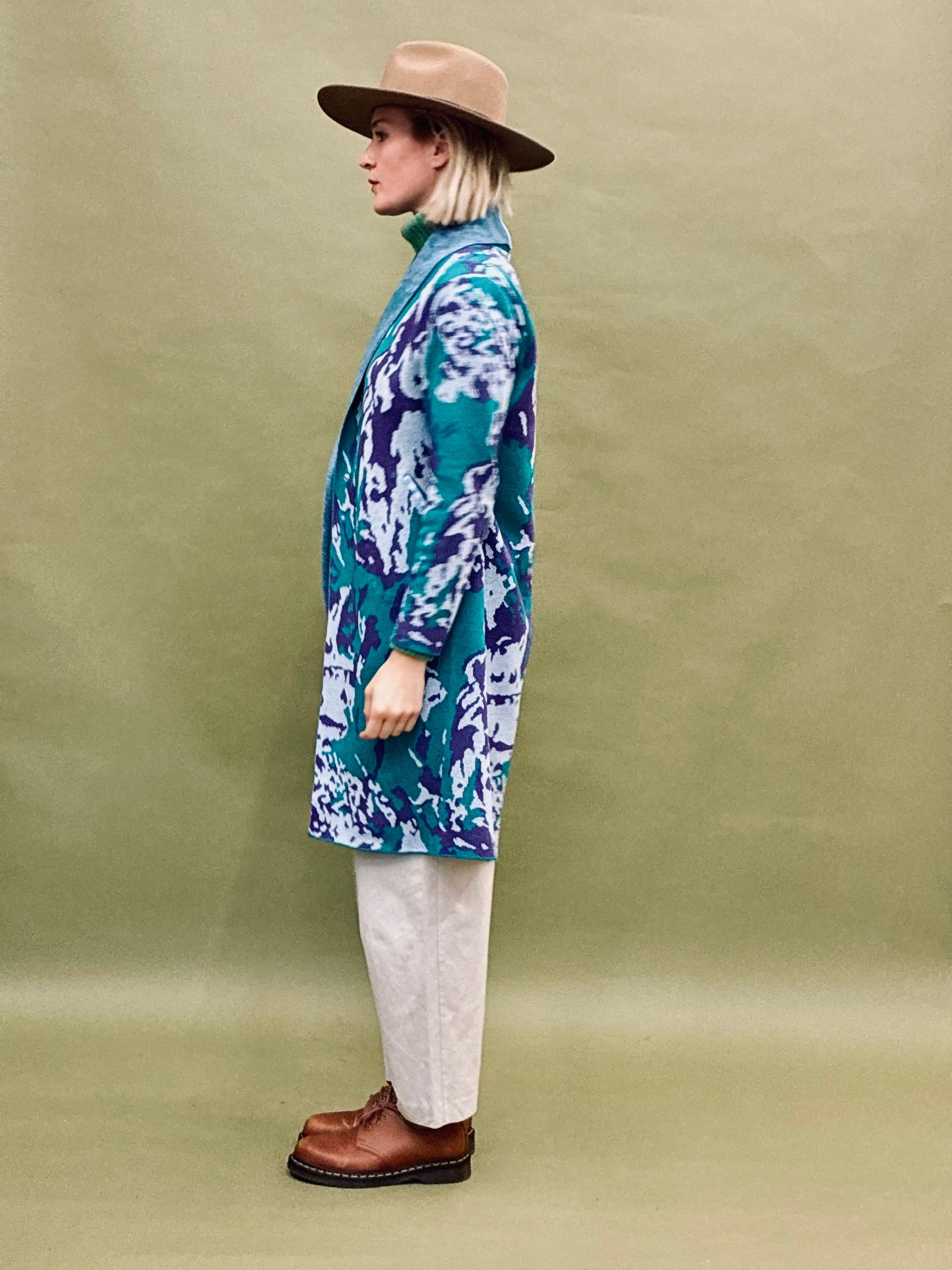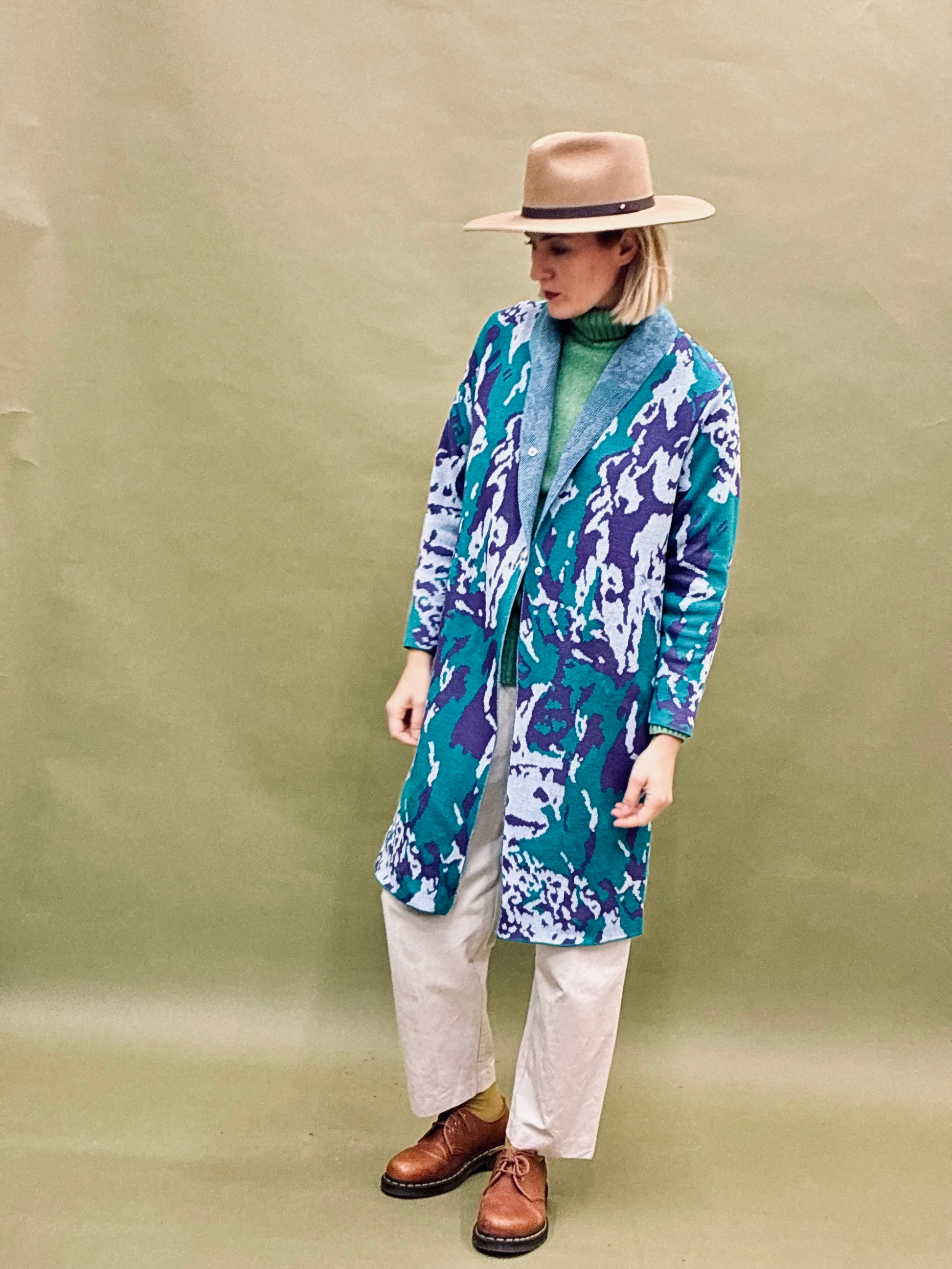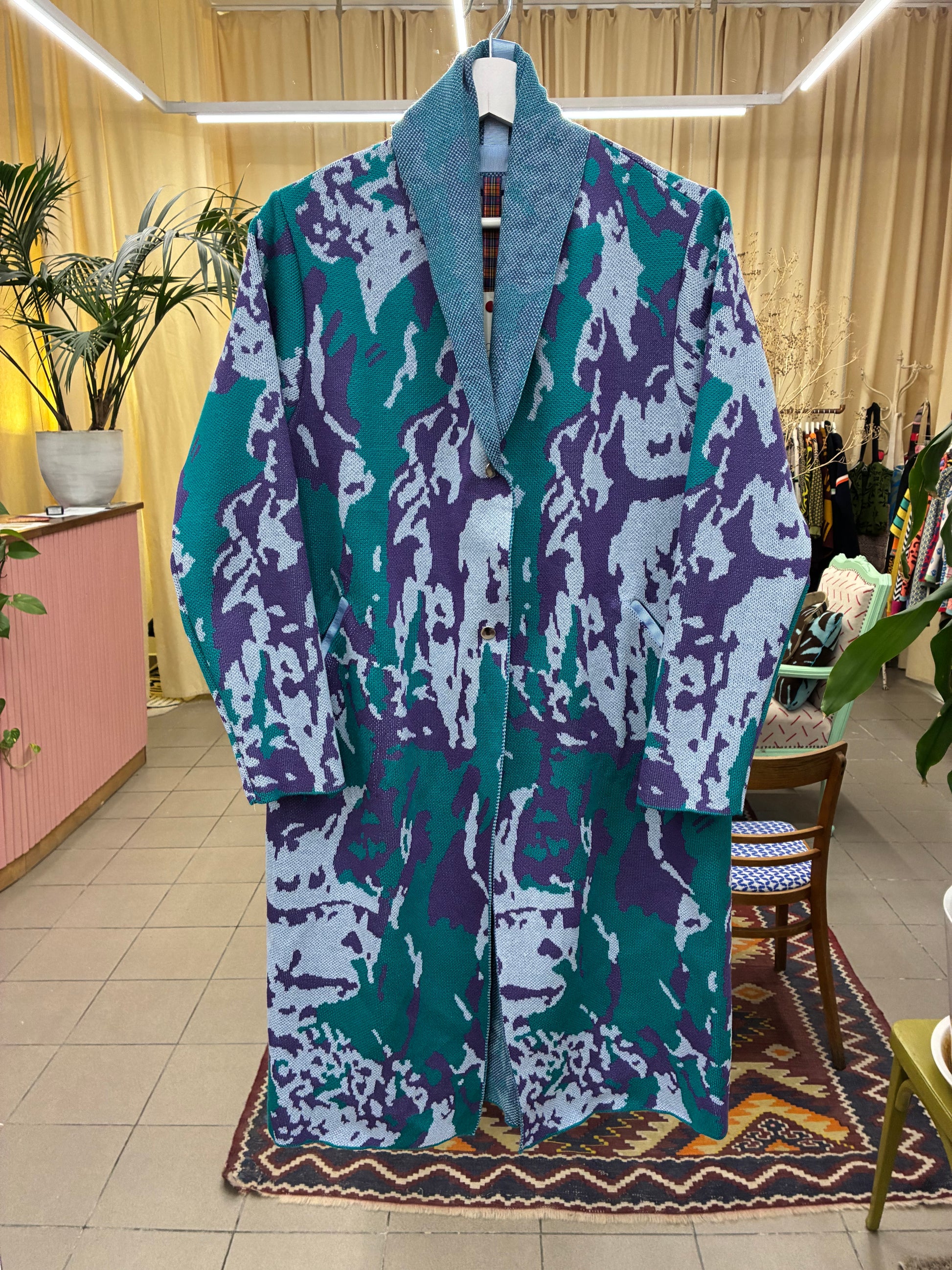 Autumn knitted coat with a paint splatter pattern. Has cut pockets and 2 snap fasteners at the waist.