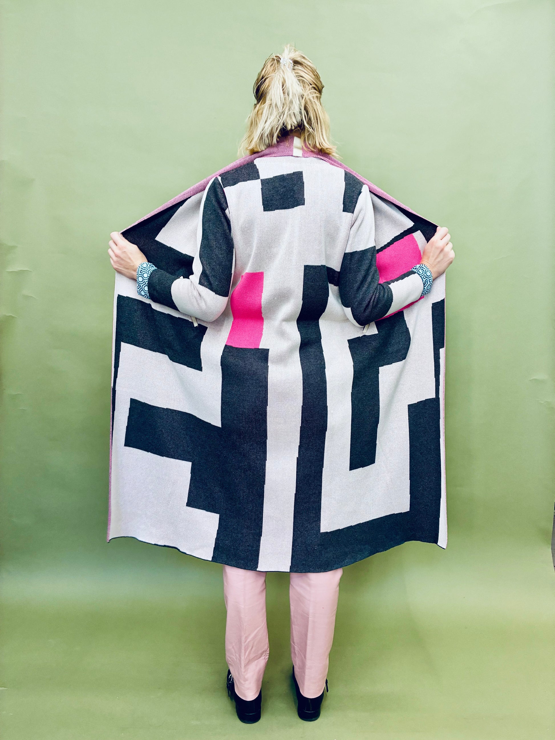 Warmer knitted coat with geometric pattern. Nice colours, easy to wear. Has cut pockets and two smoke silver snap fastener at the waist.