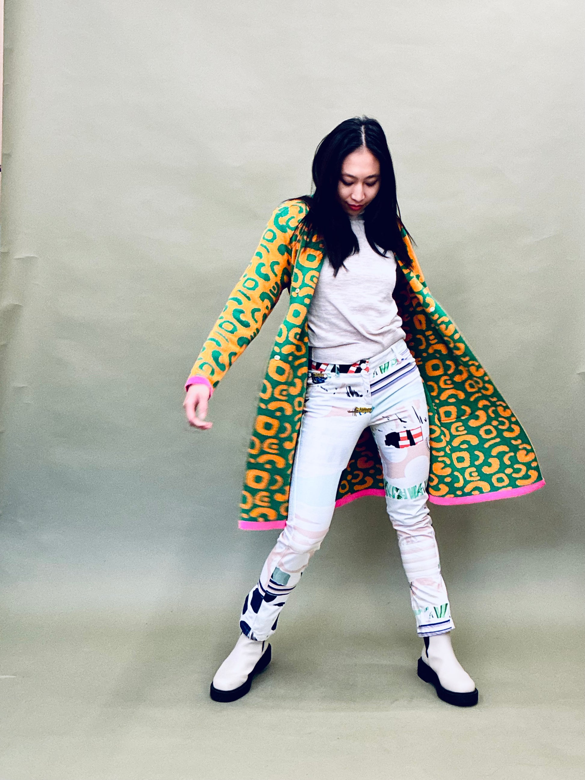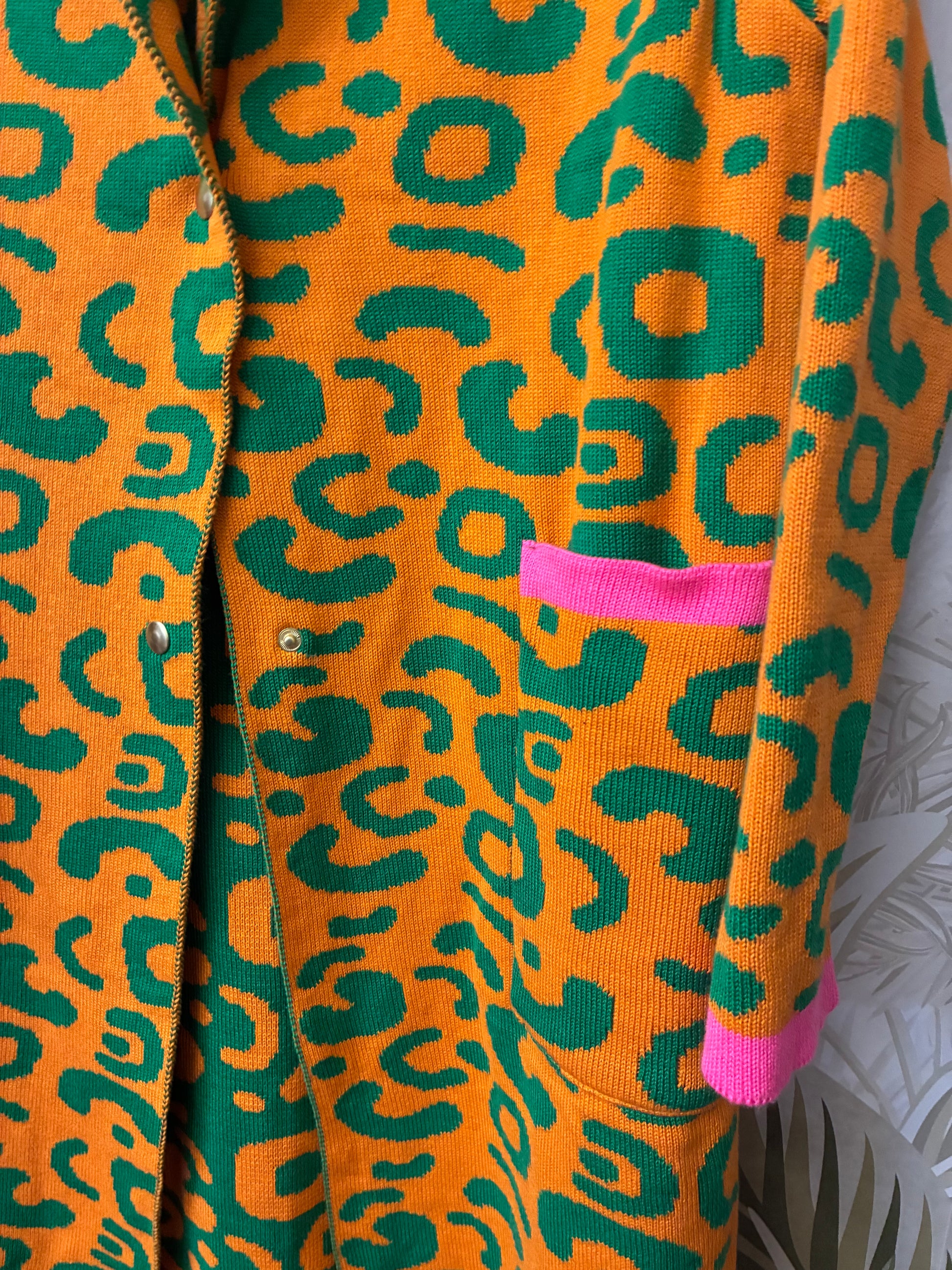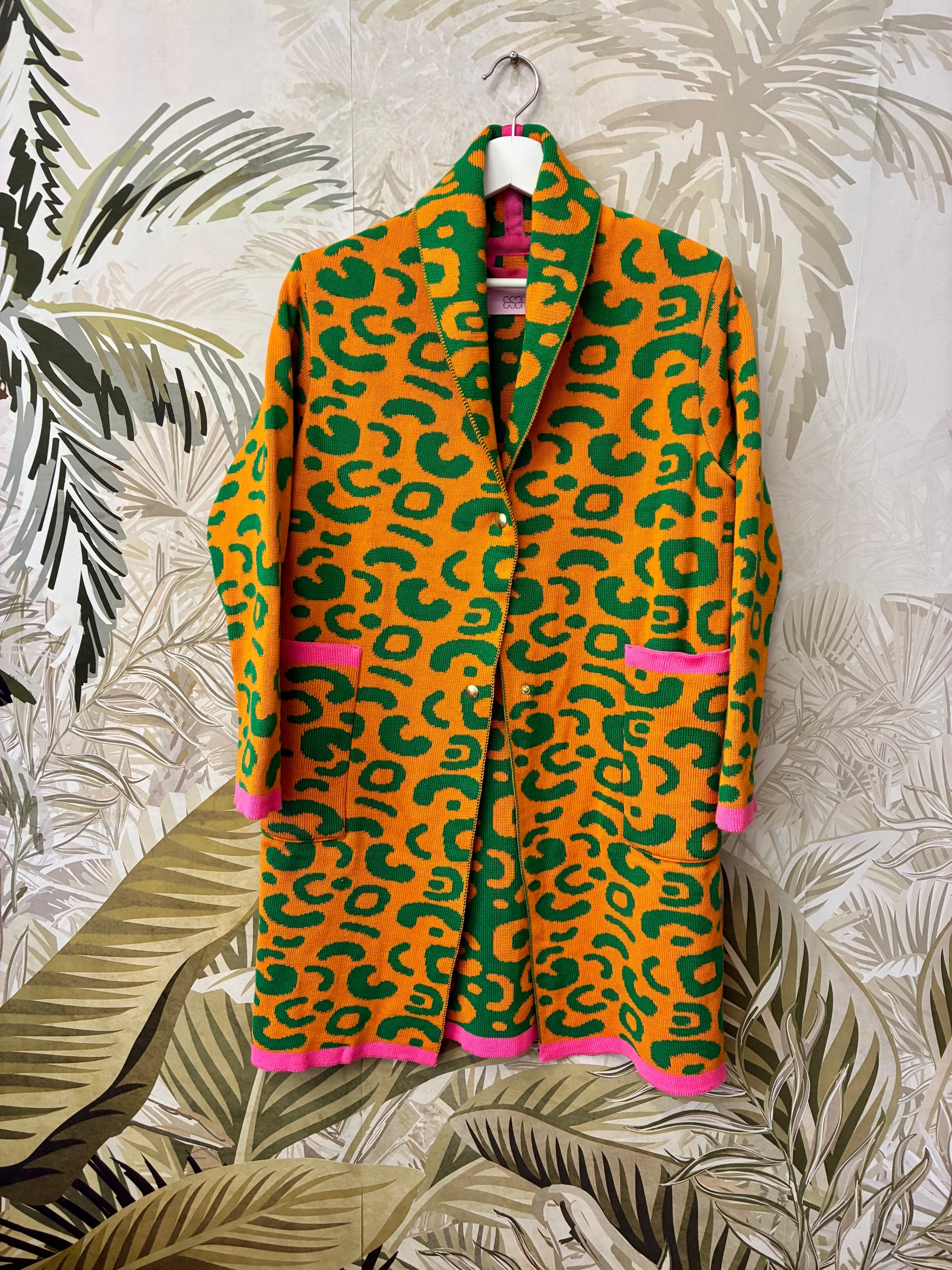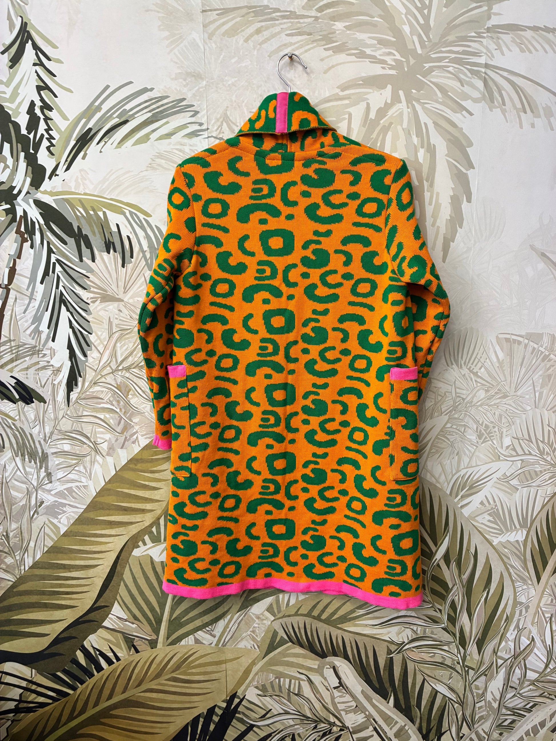 Warmer knitted coat with panther pattern. Has big, functional patch pockets and two gold snap fastener at the waist. There is a pink border at the bottom, at the end of the sleeves and at the top of the pockets.