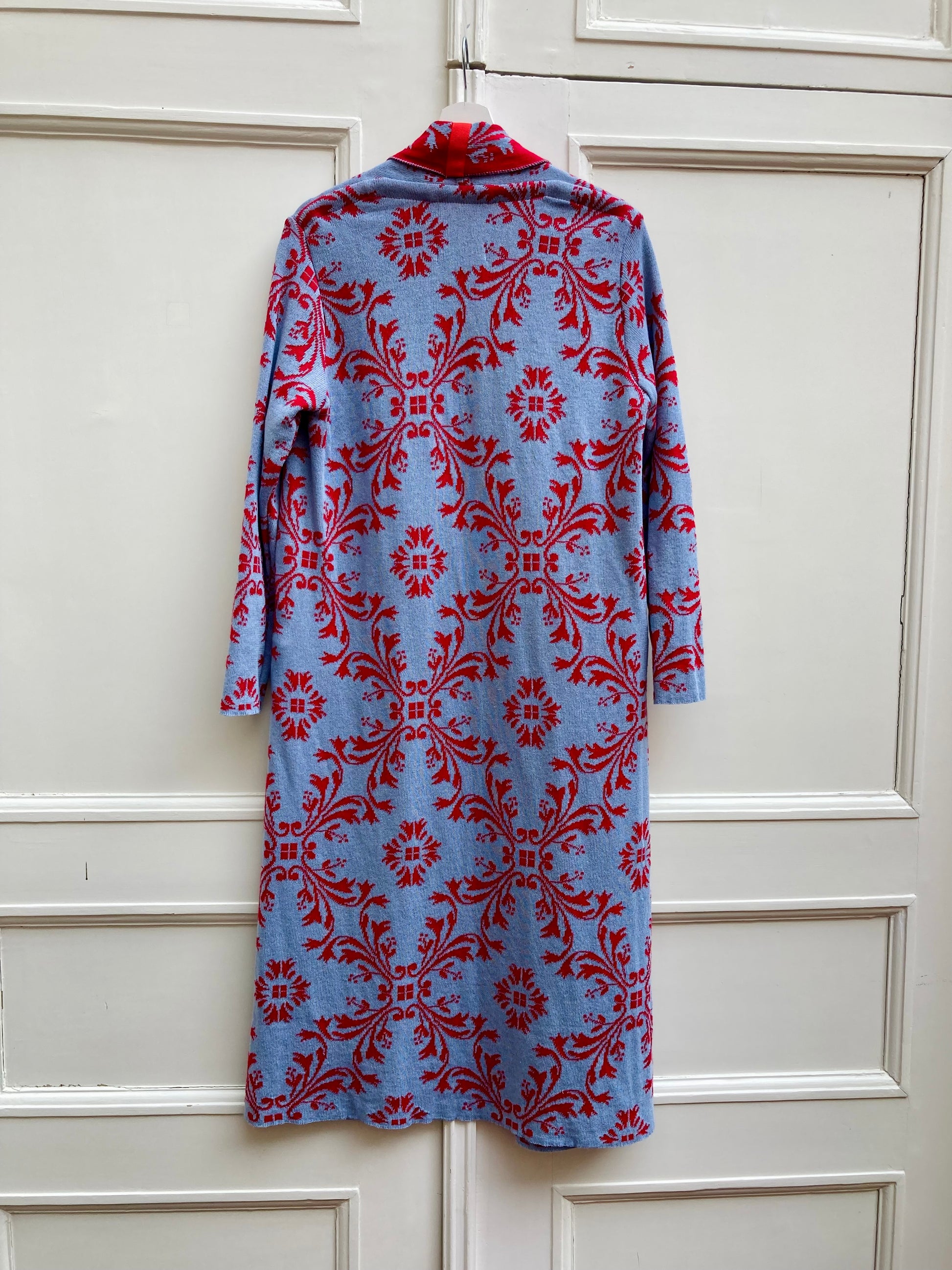 Spring knitted coat. This pattern inspired by the Portuguese tile painting. Has cut pockets, and two snap fasteners at the waist.