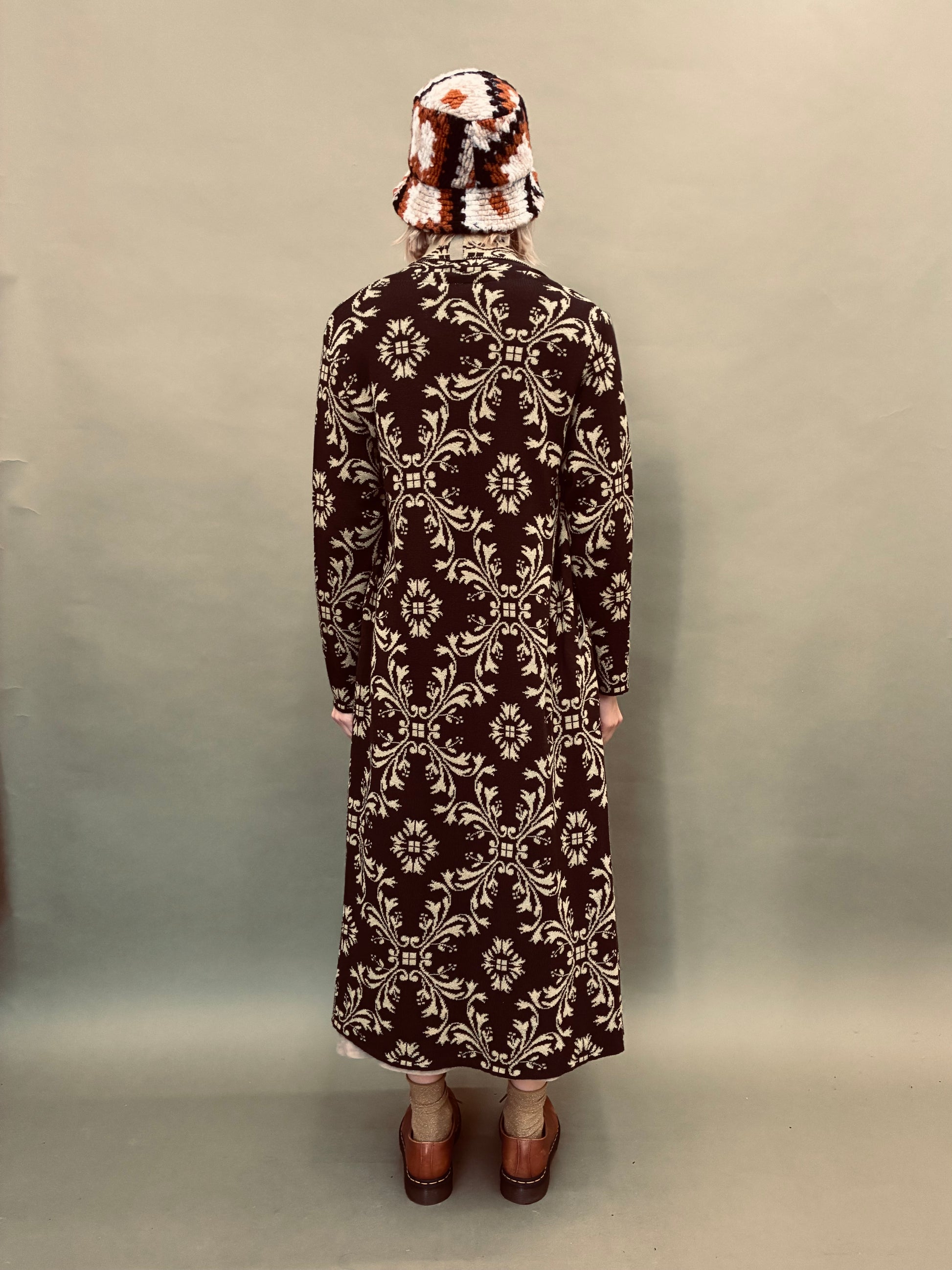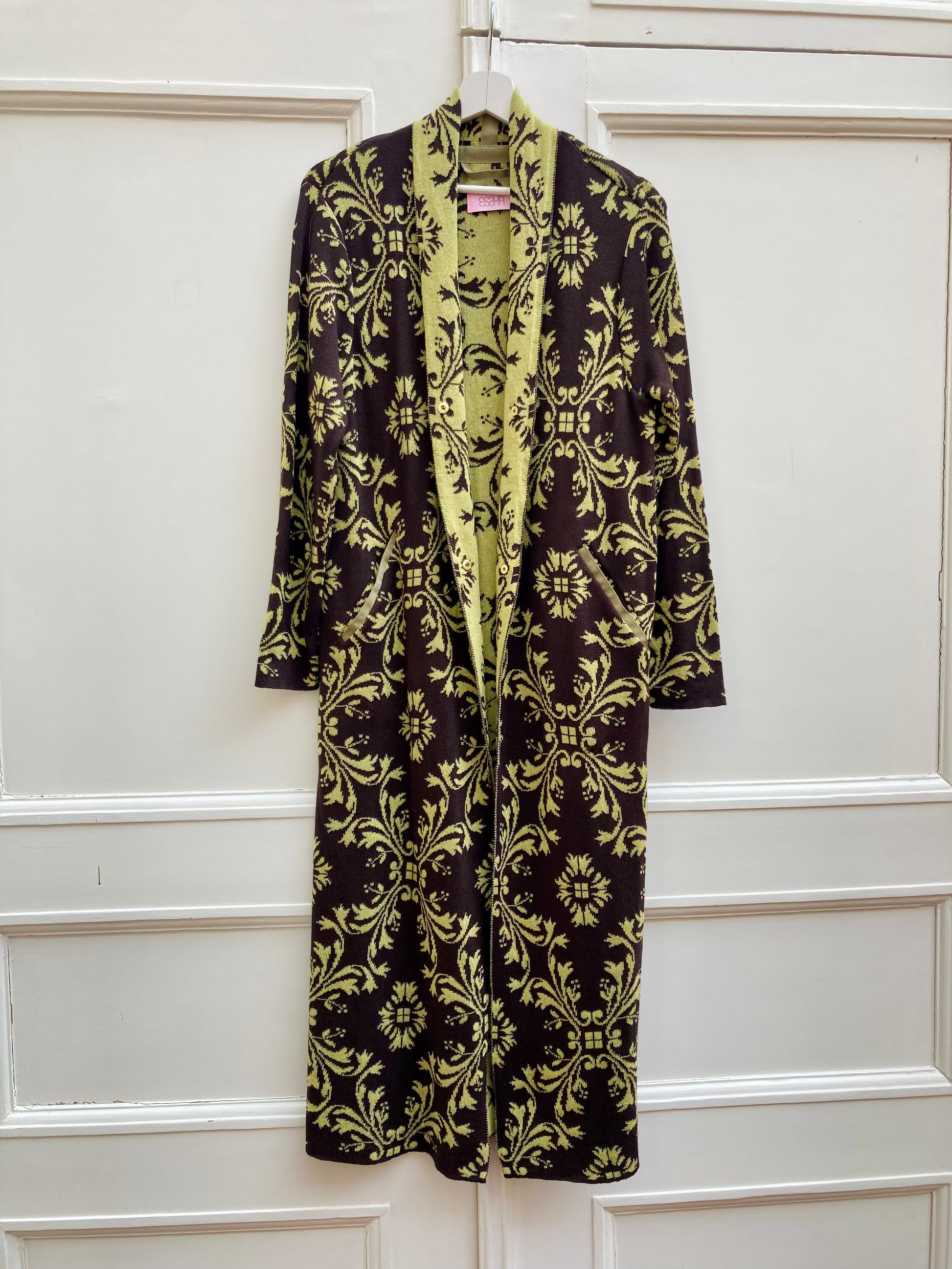 Spring knitted coat. This pattern inspired by the Portuguese tile painting. Has cut pockets, and two snap fasteners at the waist.