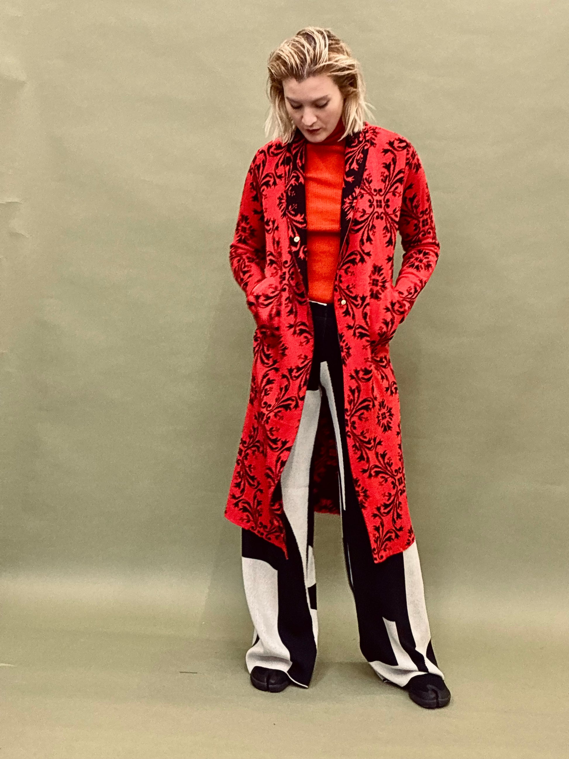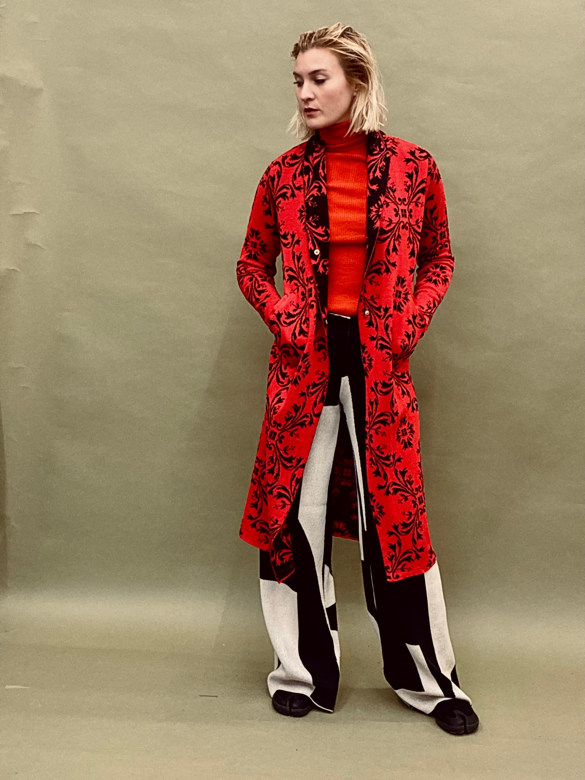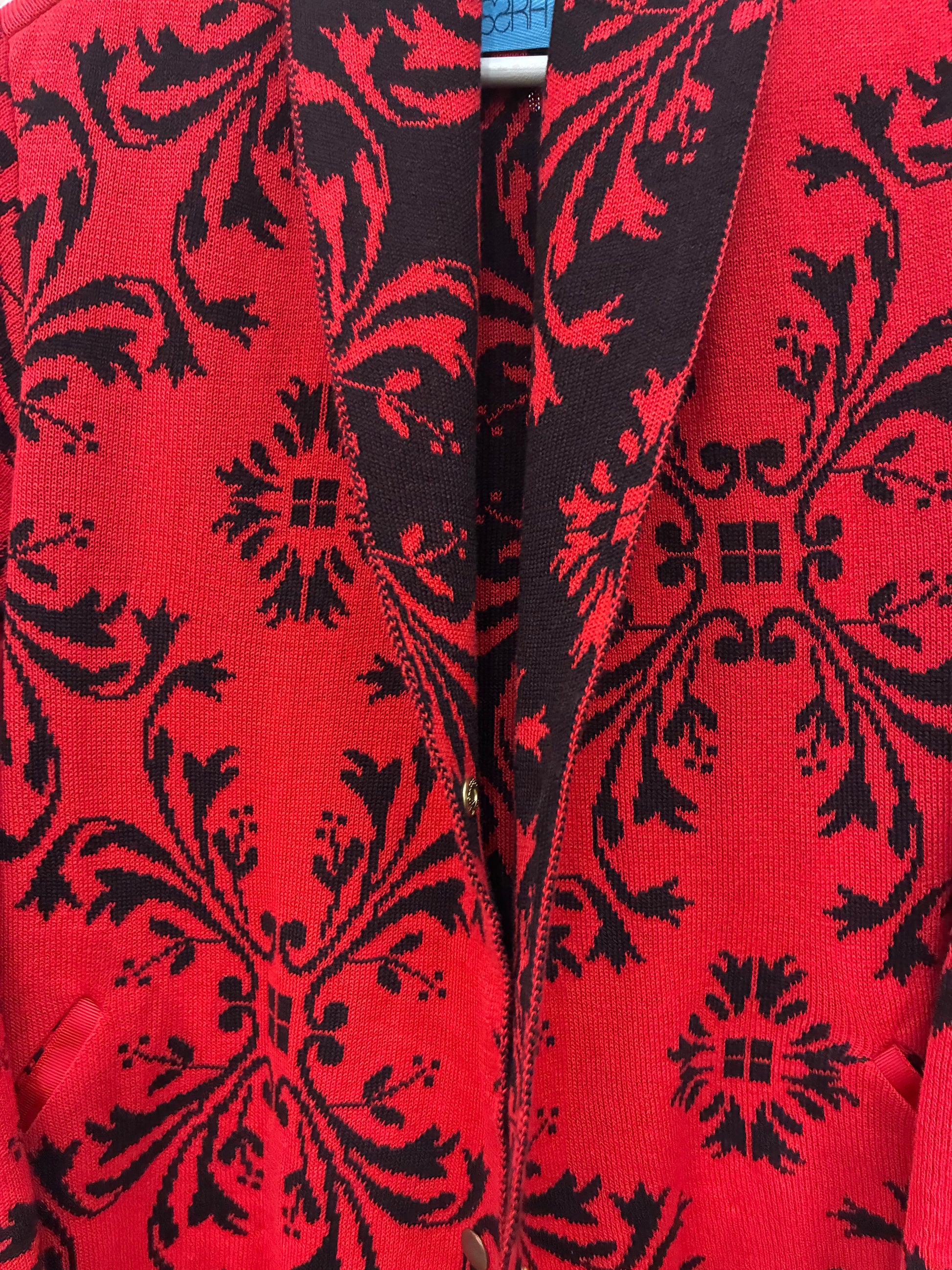 Spring knitted coat. This pattern inspired by the Portuguese tile painting. Has cut pockets, and two snap fasteners at the waist.