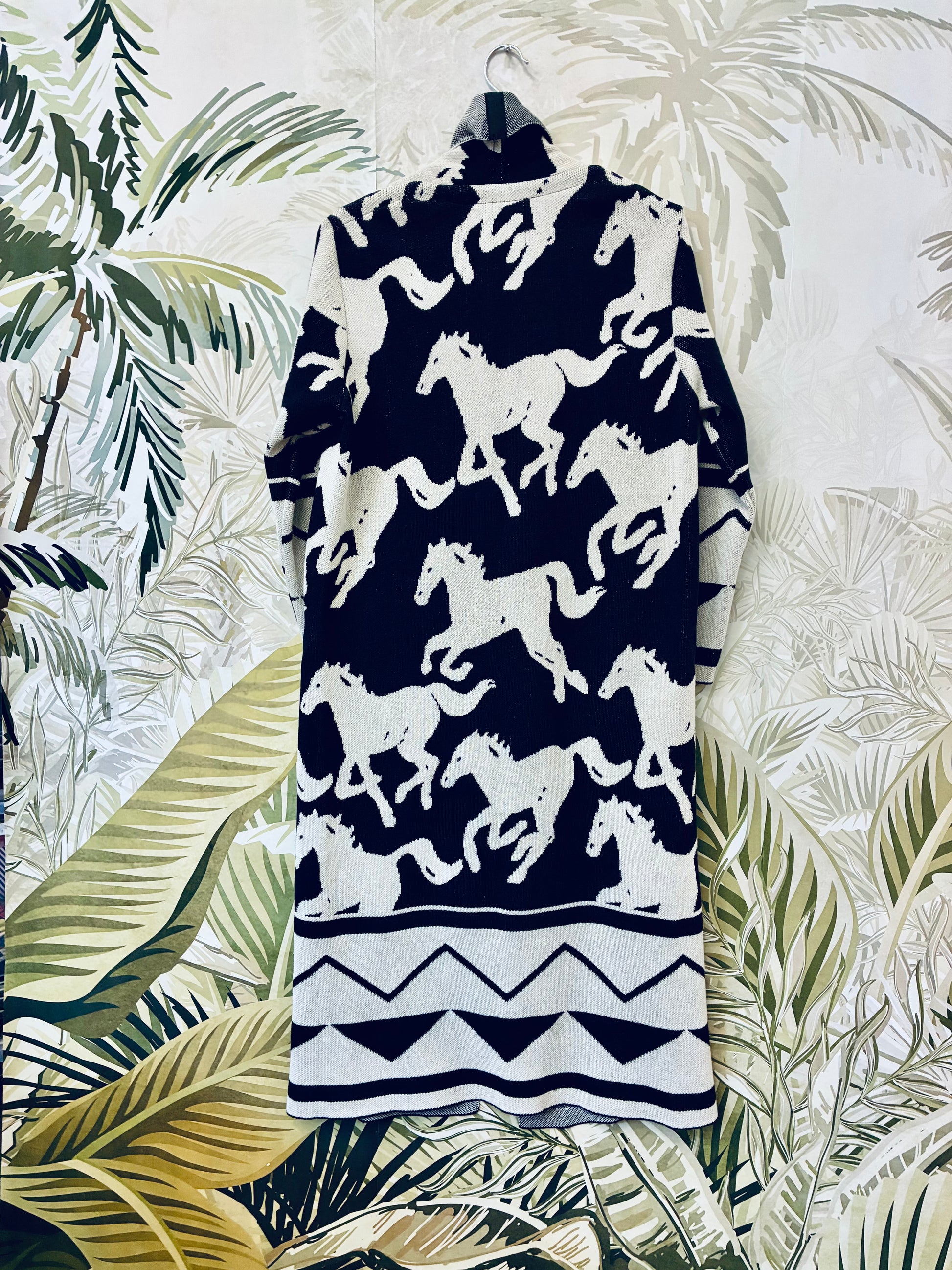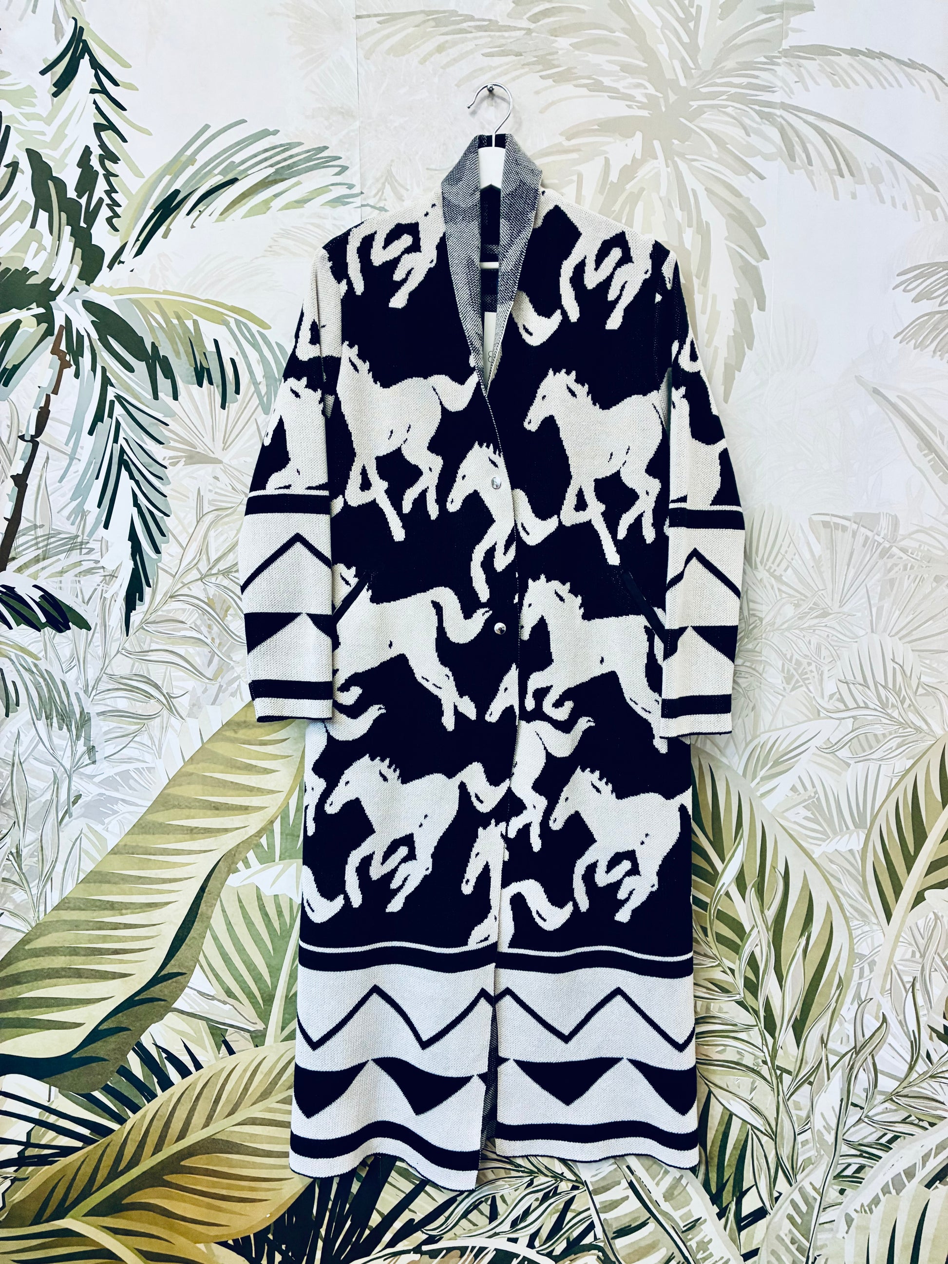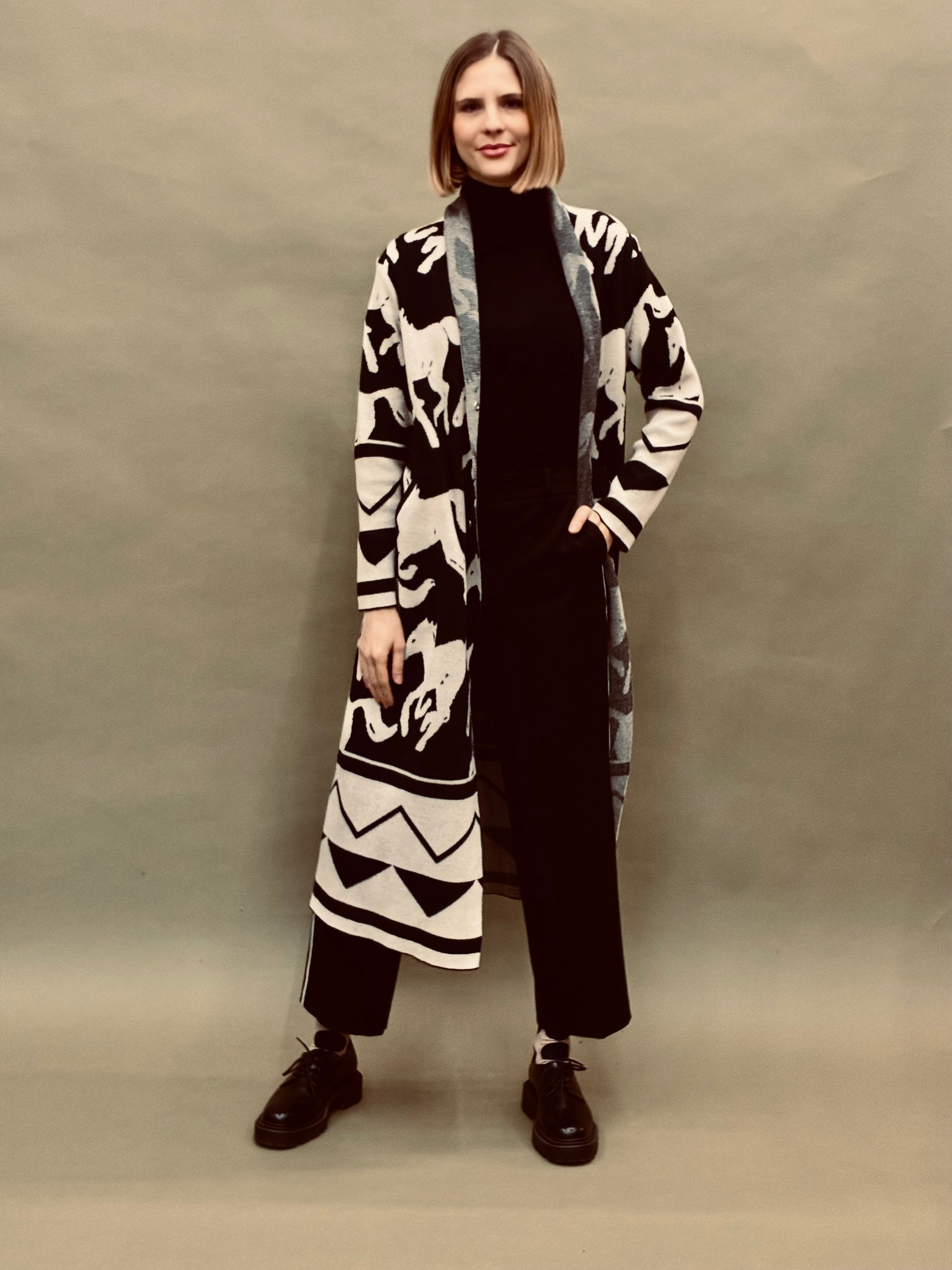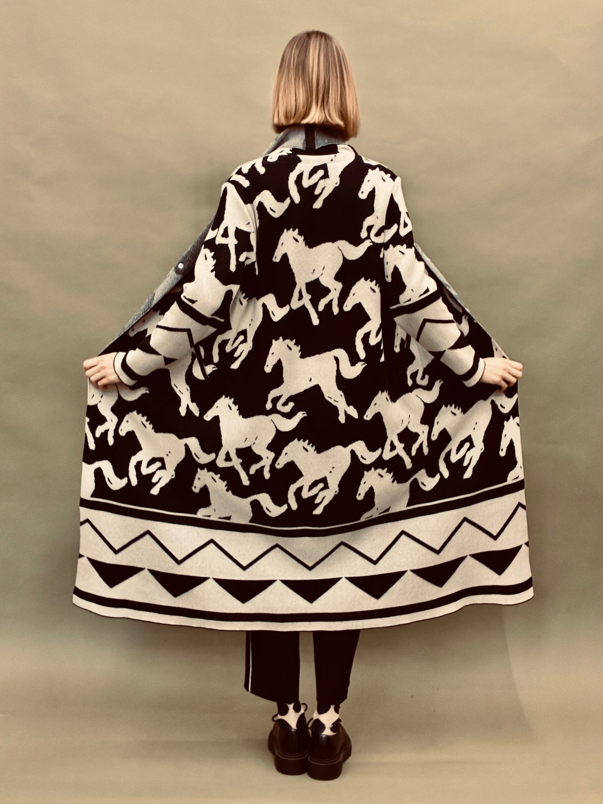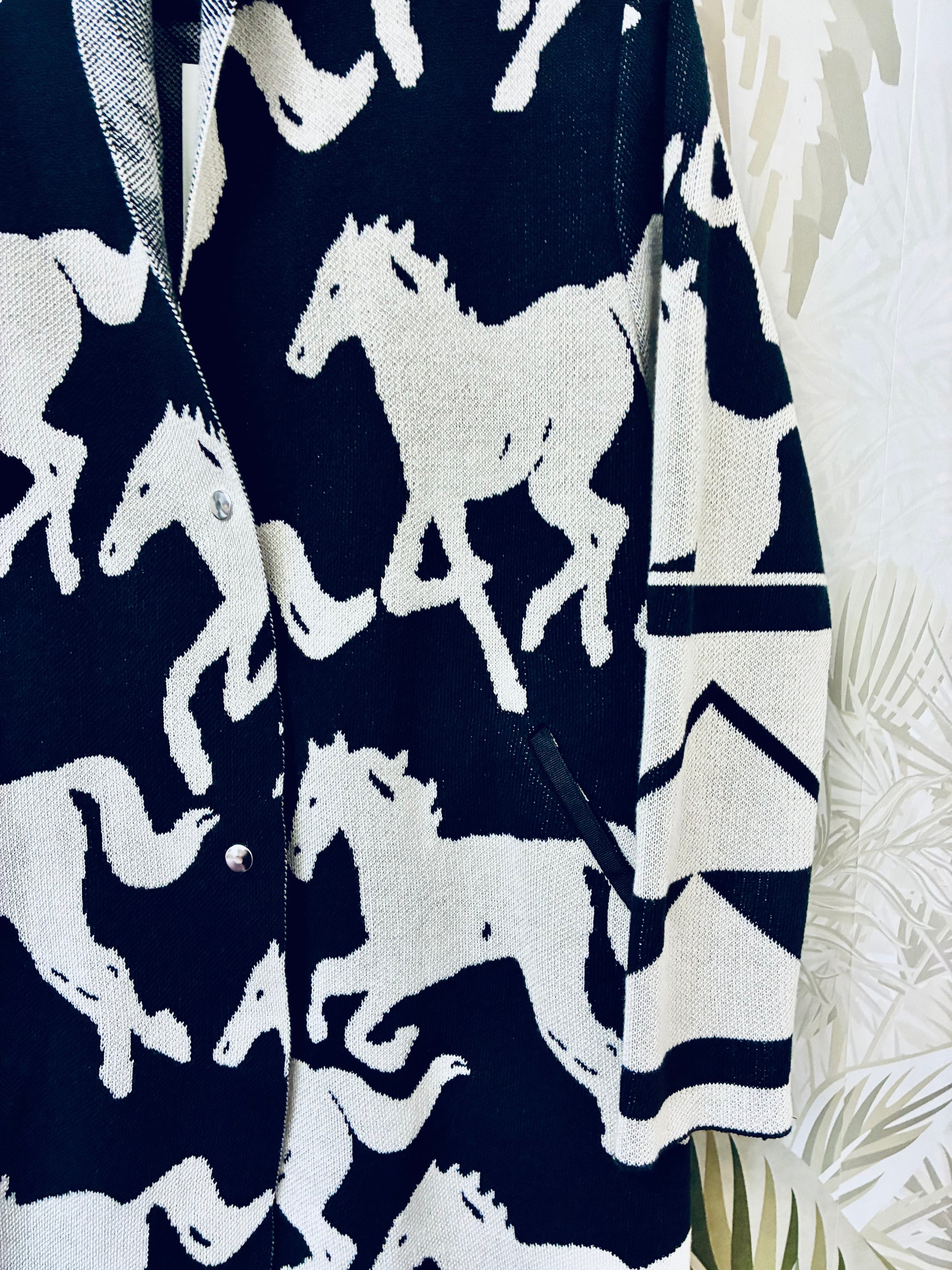 Knitted transitional light coat with aztec and horse pattern. Vibrant stylish colours, easy to wear. Has cut pockets and two silver snap fastener at the waist.