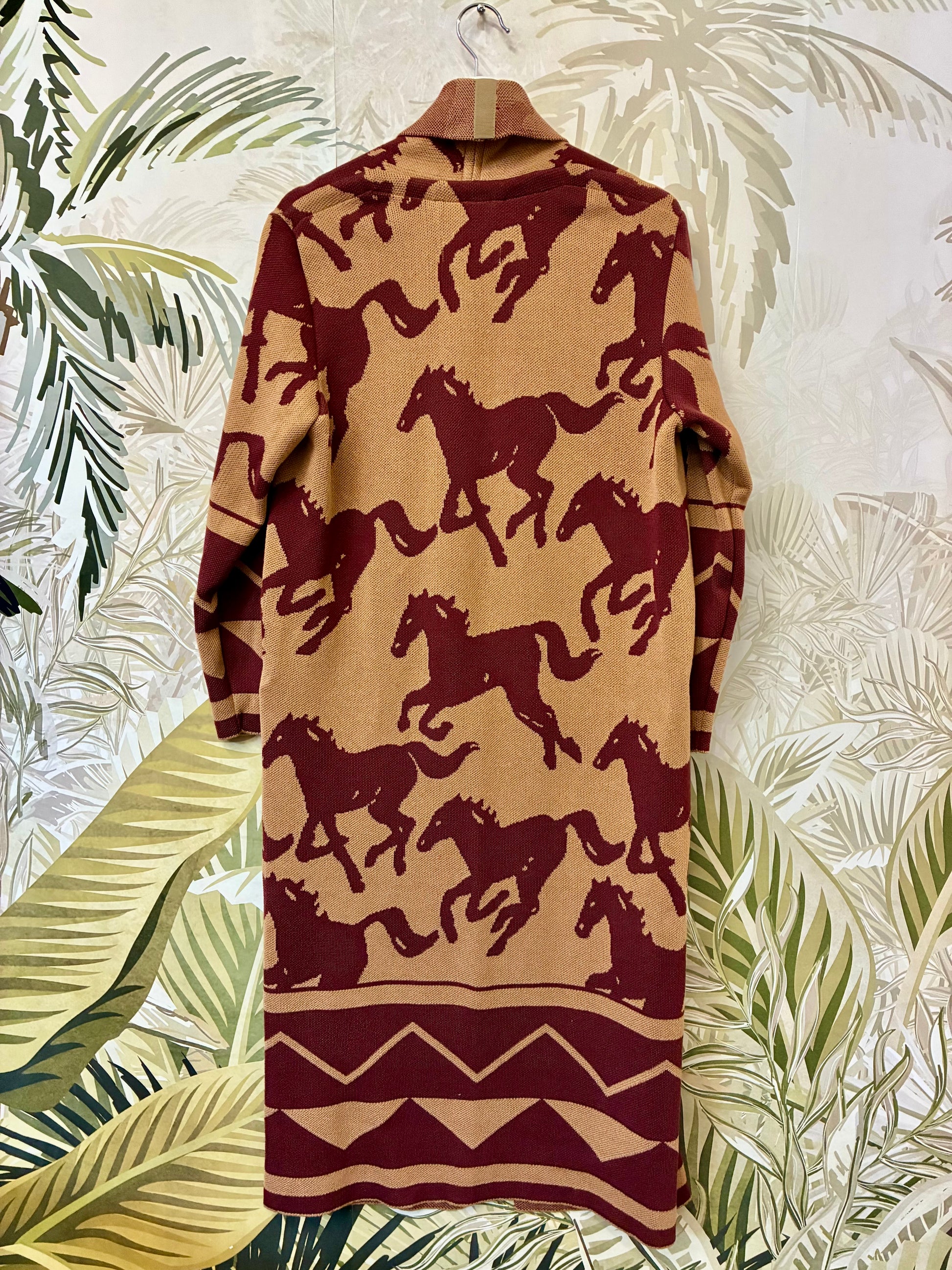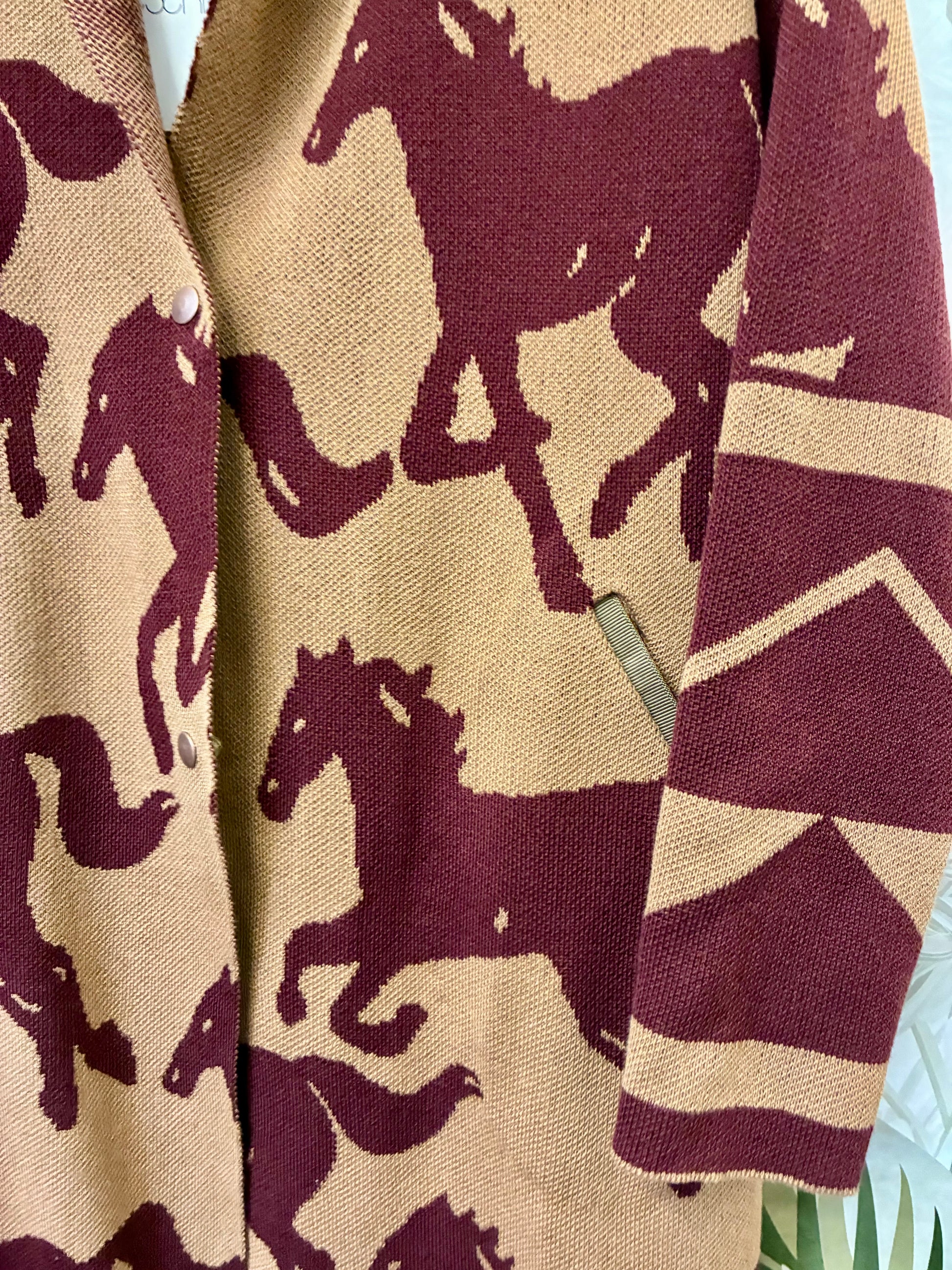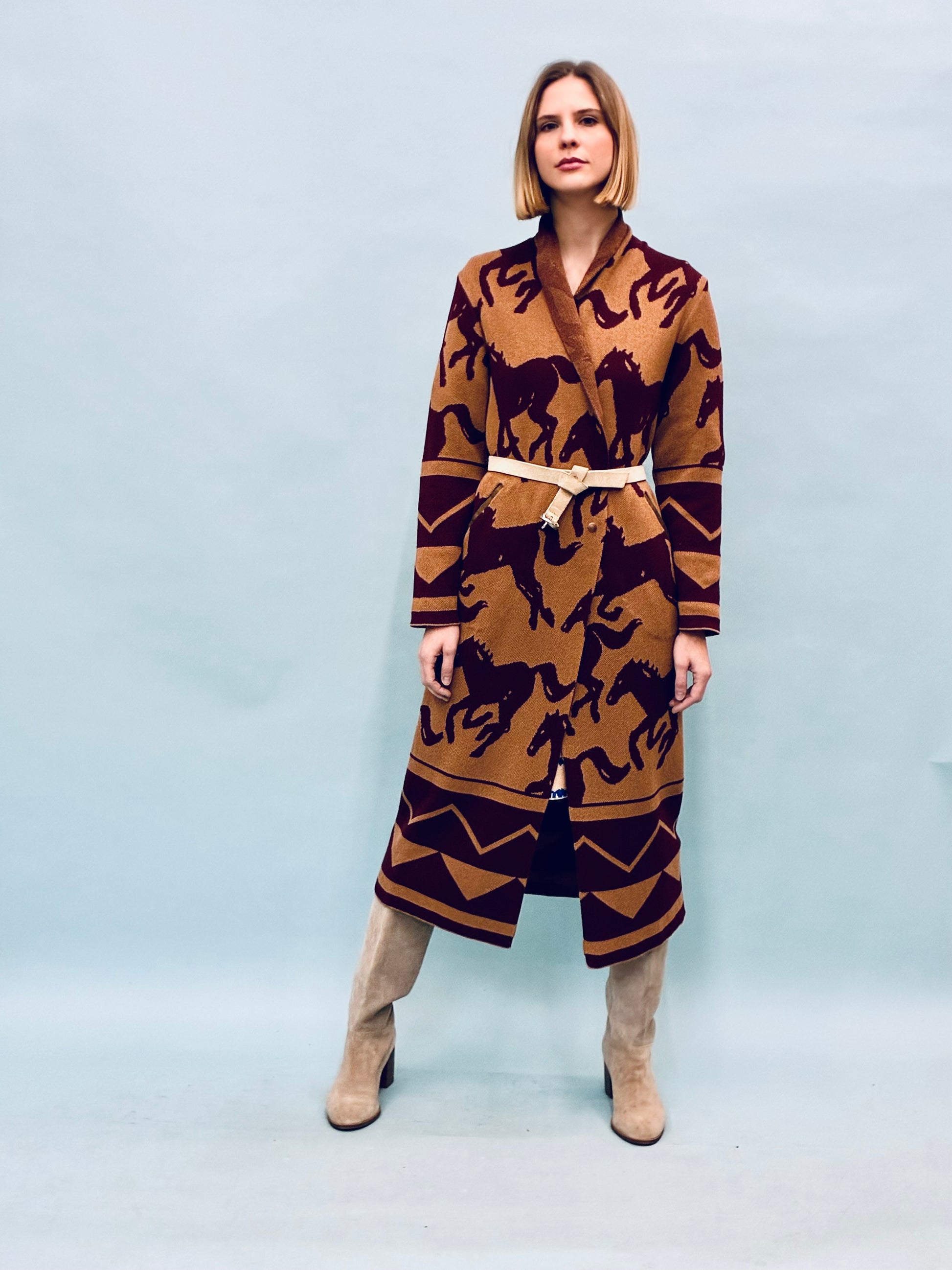 Knitted transitional light coat with aztec and horse pattern. Vibrant stylish colours, easy to wear. Has cut pockets and two copper snap fastener at the waist.