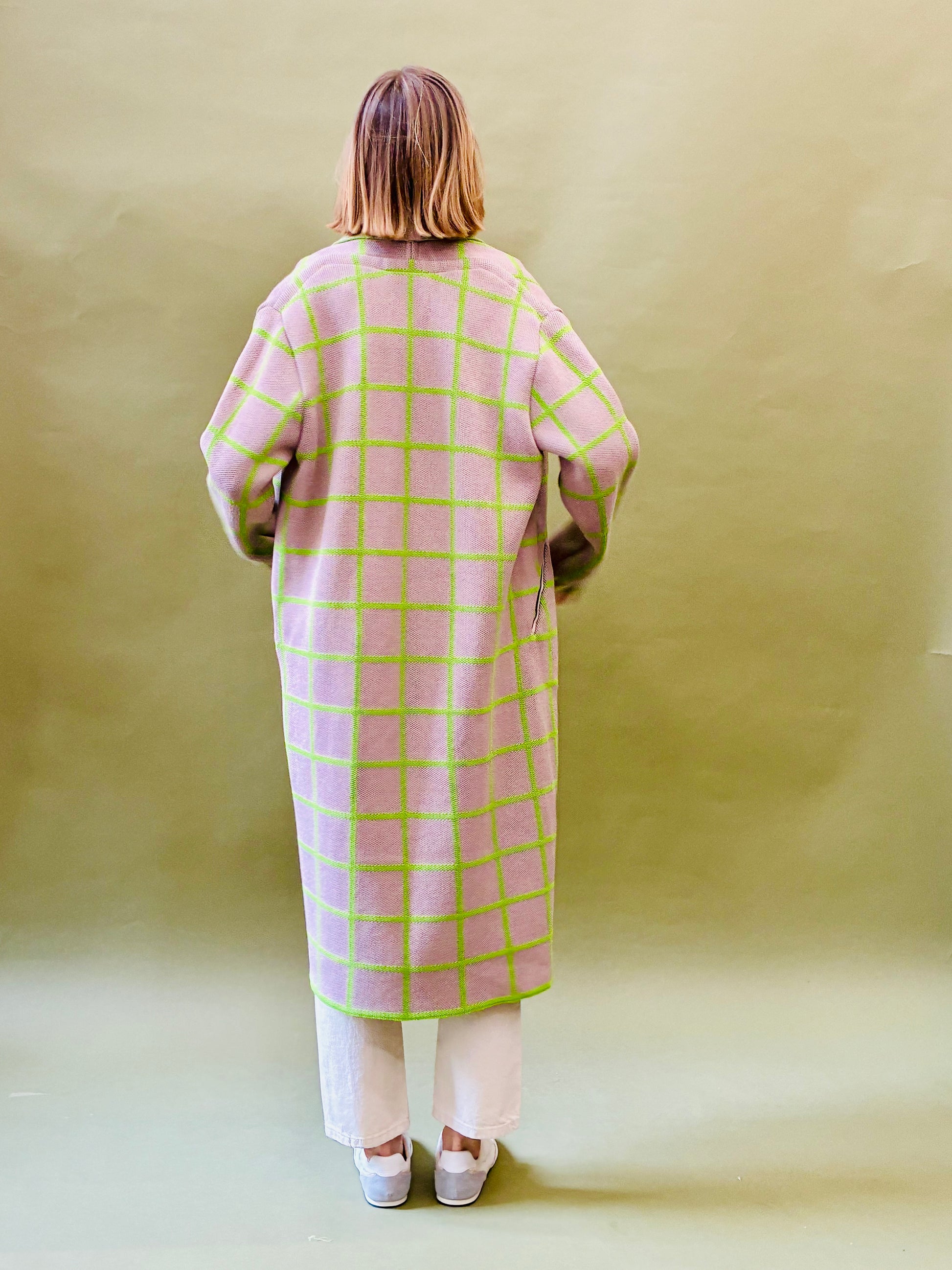 Knitted coat with a checkered pattern. Inspired by the Japanese sliding door. Has cut, pockets and two snap fastener at the waist.