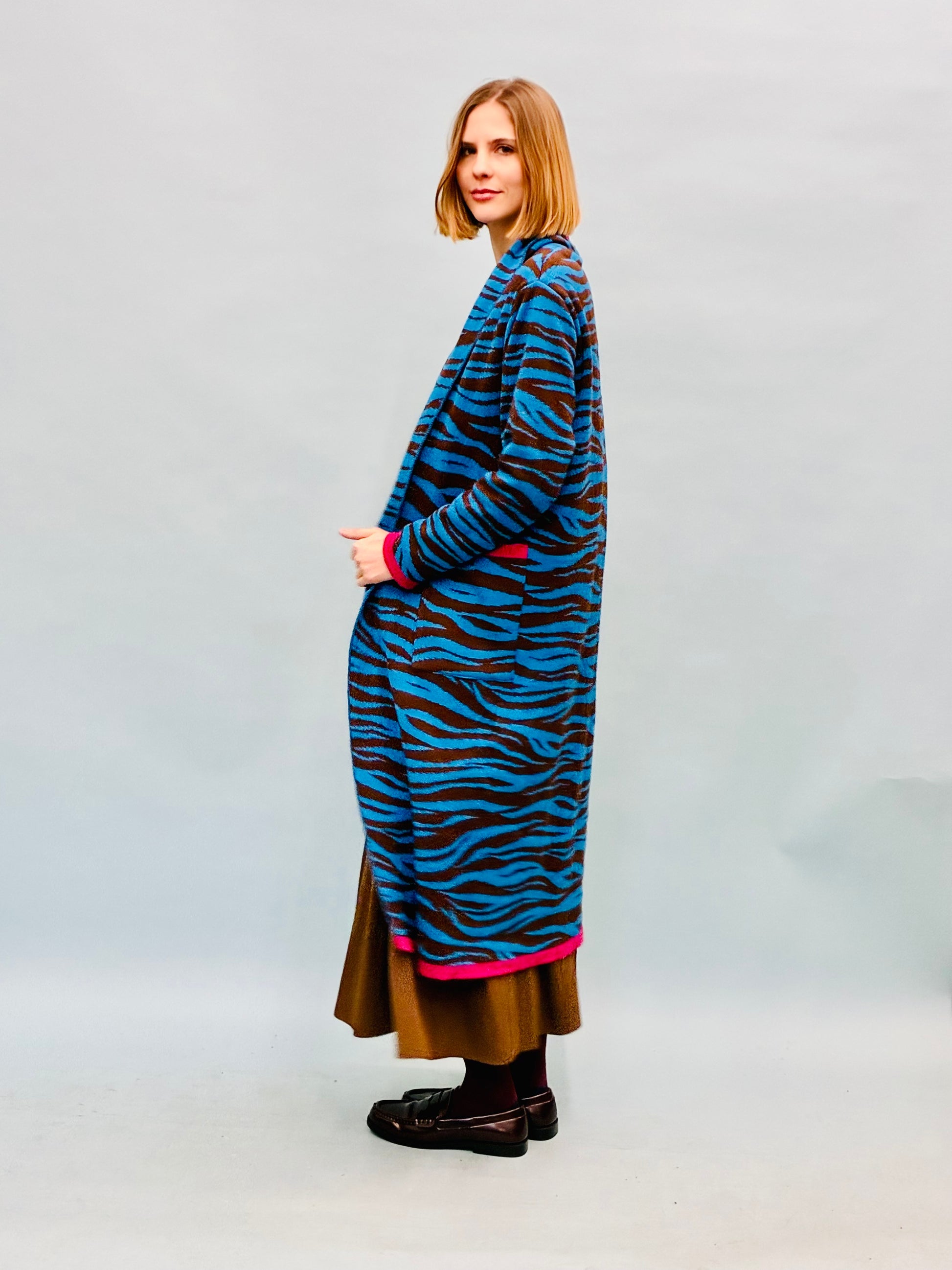 Warmer Knitted coat with tiger pattern. It has two snap fasteners at the waist. There is big patch pocket with raspberry border.