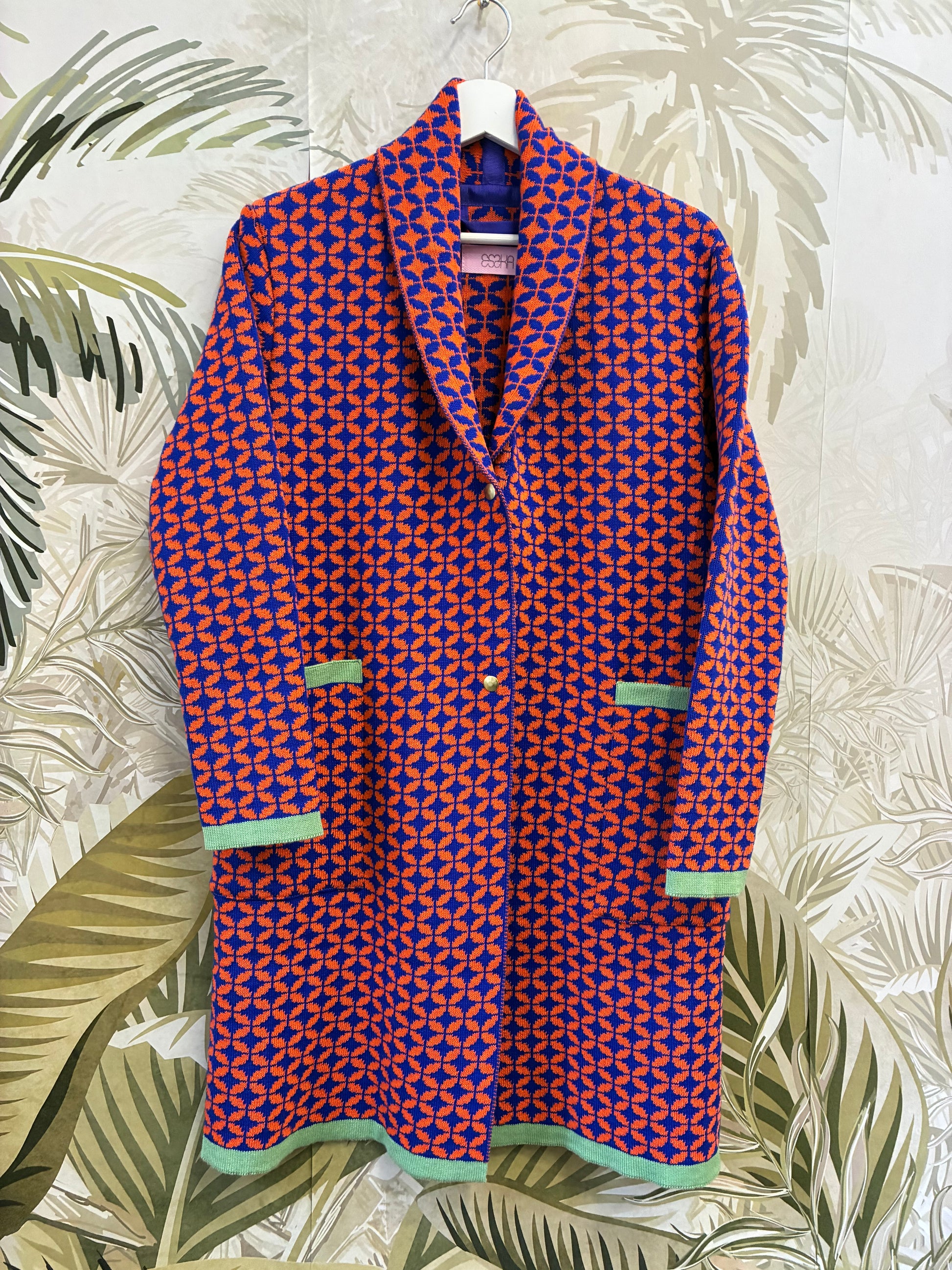 The first coat ever made by Eszka started with this pattern. Inspired by traditional Portuguese tile art, this classic warmer knit coat features spacious pockets and gold snap fasteners at the waist.