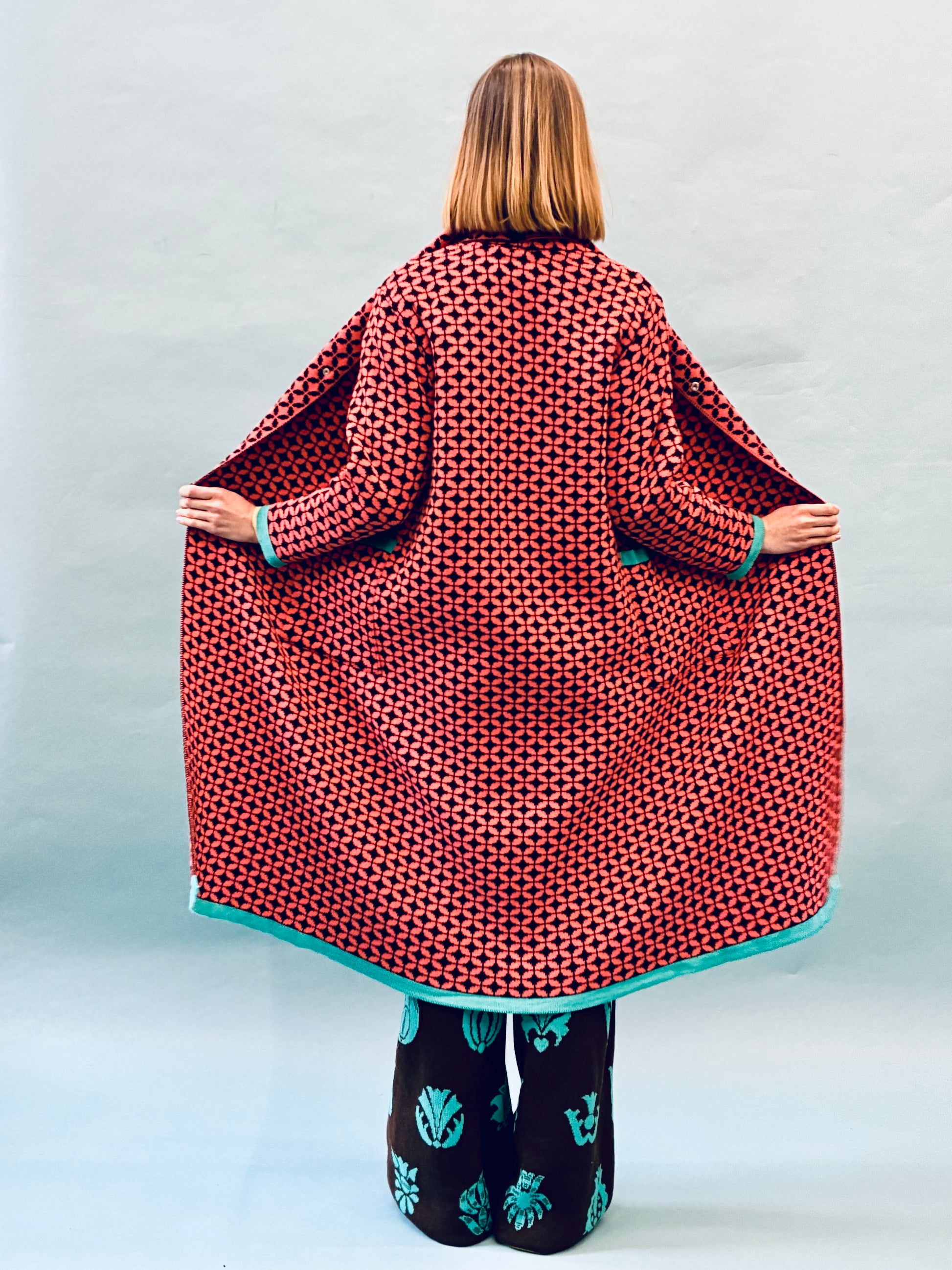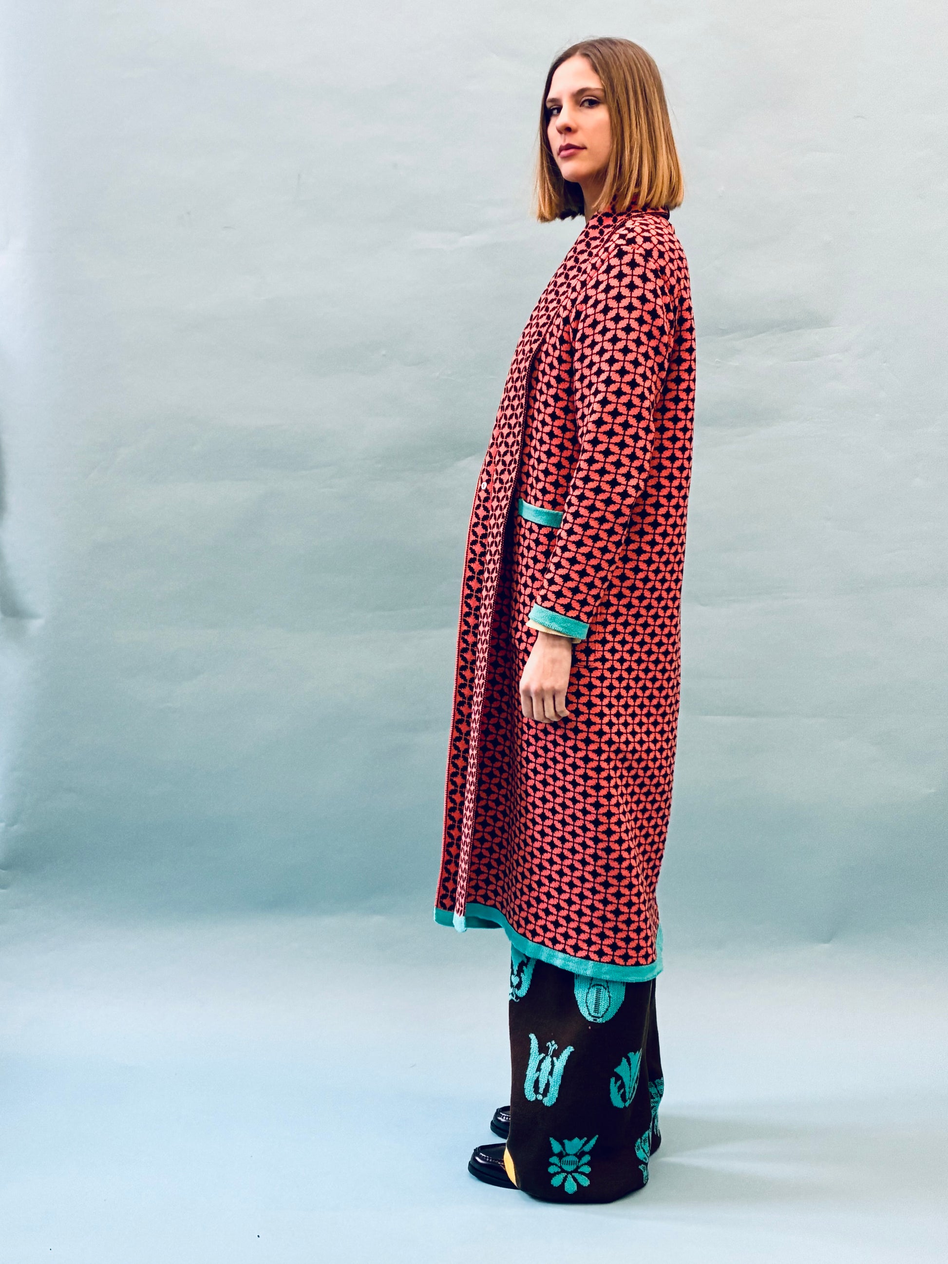 The first coat ever made by Eszka started with this pattern. Inspired by traditional Portuguese tile art, this classic warmer knit coat features spacious pockets and copper snap fasteners at the waist.