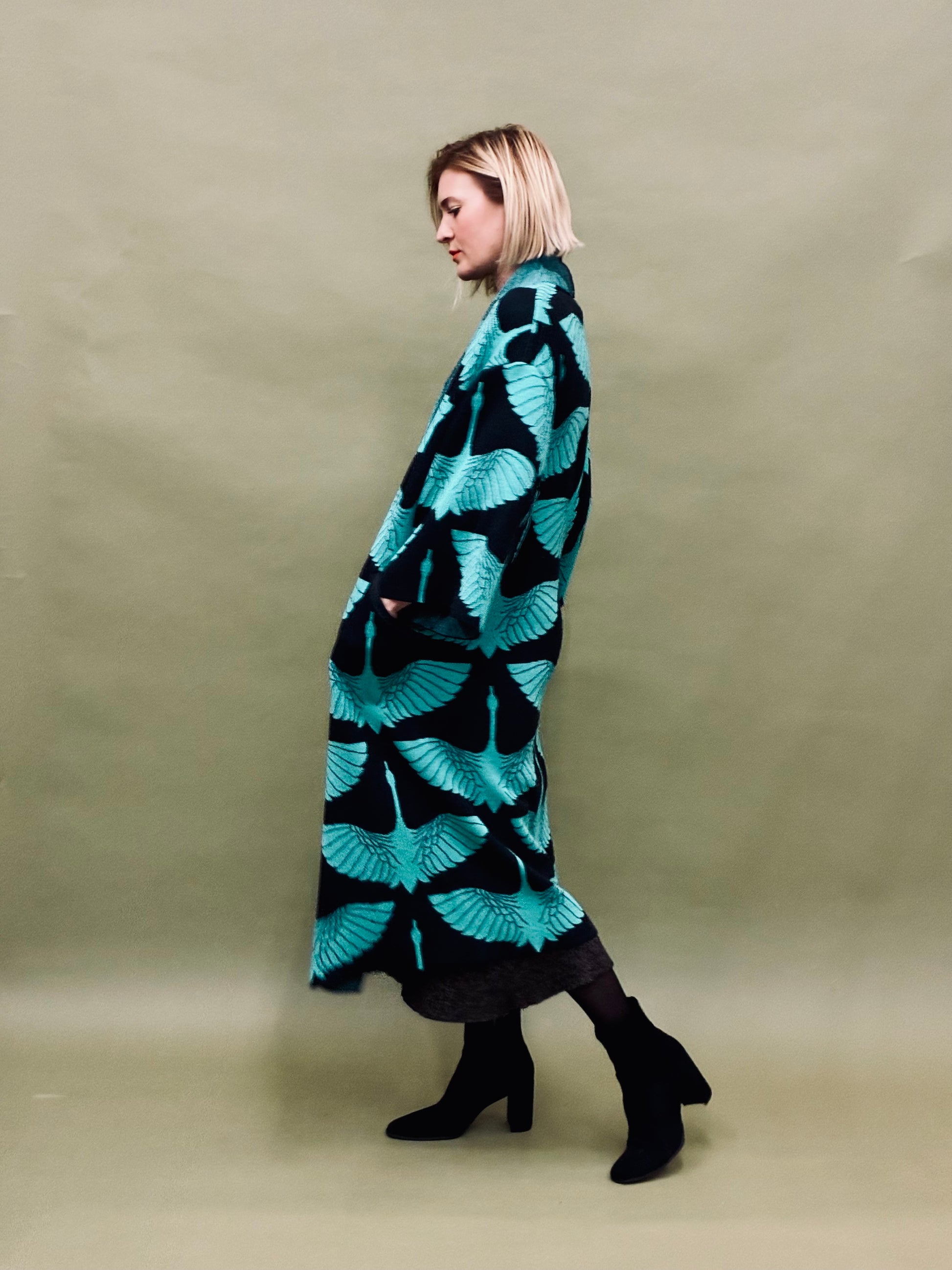 Knitted kimono coat with long wider sleeves with a crane bird pattern and cut pockets. This is a stylish and cosy outfit.