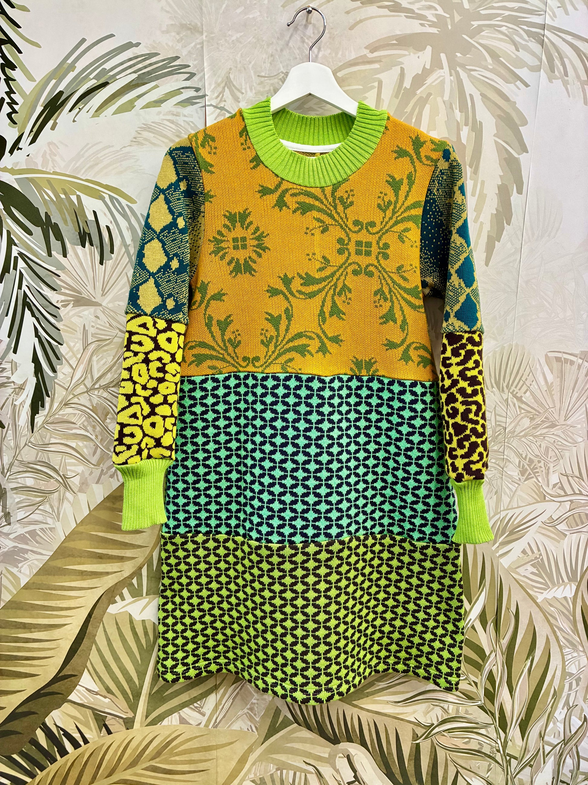 Limited edition knitted patchwork dress. A one-of-a-kind fusion of bold colors and signature patterns from our coat collection. Effortlessly comfortable, designed for everyday wear for a total unique look.